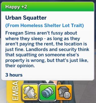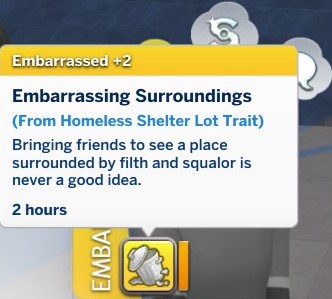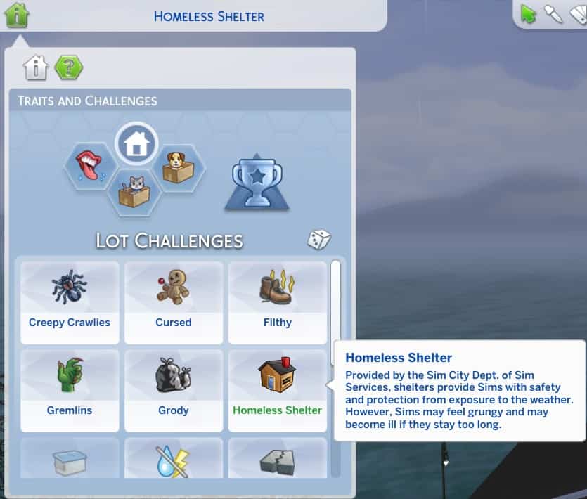 -Homeless Shelter Challenge Lot Trait – Provided by the Sim City Dept. of Sim Services, shelters provide Sims with safety and protection from exposure to the weather. However, Sims may feel grungy and may become ill if they stay too long.
