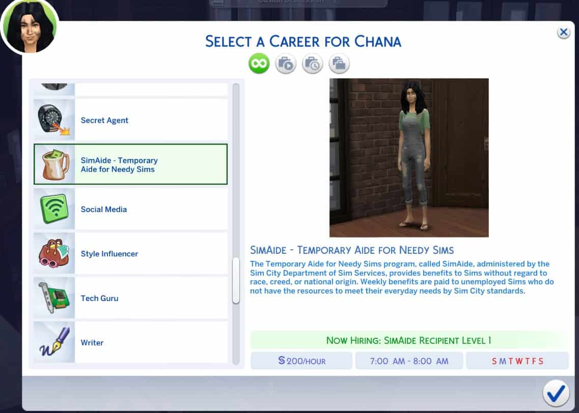 -SimAide – The Temporary Aide for Needy Sims program, called SimAide, administered by the Sim City Dept. of Sim Services, provides benefits to Sims without regard to race, creed, or national origin. Weekly benefits are paid to unemployed Sims who do not have the resources to meet their everyday needs by Sim City standards.