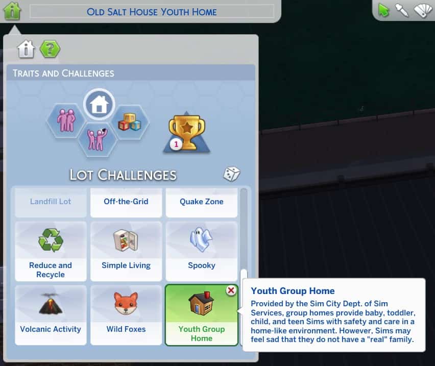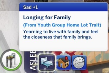 -Youth Group Home Challenge Lot Trait – Provided by the Sim City Dept. of Sim Services, group homes provide baby, toddler, child, and teen Sims with safety and care in a home-like environment. However, Sims may feel sad that they do not have a “real” family.
