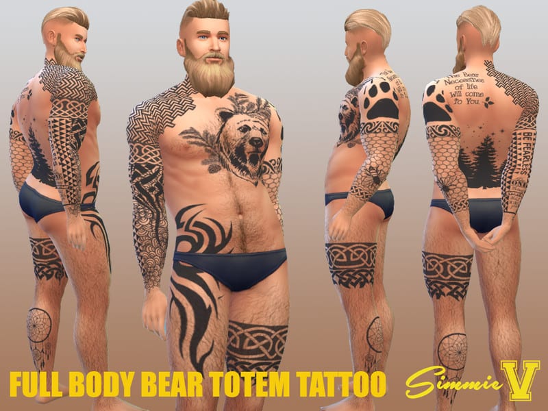 Our database contains only the highest quality Sims 4 mods that meet the most stringent requirements, like SimmieV Full Body Bear Totem tattoo Sims 4 Mod. This guarantees that our visitors have access to the most exclusive and useful files.