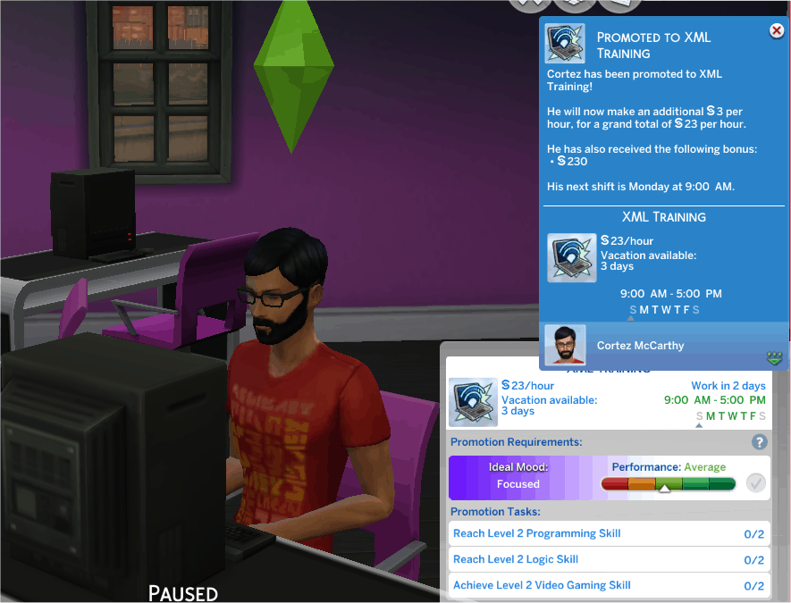 Your skills have not gone unnoticed by the makers of Sims Forever, they are so impressed with your ability to code their game, they have given you an official job with the company! Congratulations and keep working hard, there are still pay rises to get!