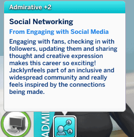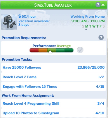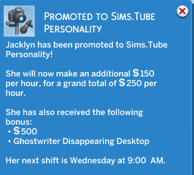 {0.SimFirstName} has a small but dedicated following. Spending time perfecting {M0.his}{F0.her} website and working on programming skills, increasing charisma and reach by advertising and reviewing products, and recording and uploading even more videos is sure to pay off.