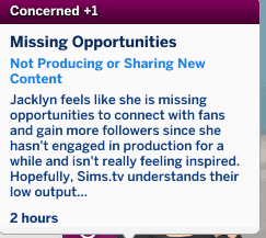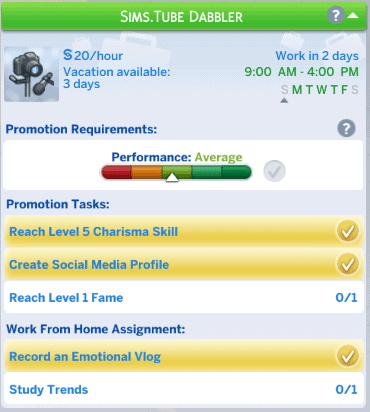 {0.SimFirstName} has just stepped a toe into the world of as a self-made media star. {M0.He}{F0.She}will need to quickly hone {M0.his}{F0.her} charisma skills, setup their following, communicate often with followers, and make enough money to buy equipment and handiness skill to fix the equipment already owned.