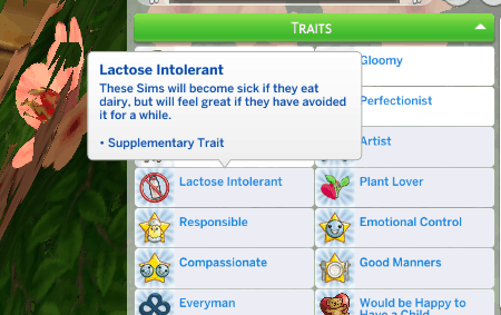 Note: You can still pick it in CAS if you like, but this is so you can have your sim be Lactose Intolerant but still have them have 3 personality traits.