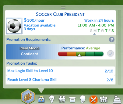 This is a custom career that allows you to live out your soccer player dreams. It has 10 levels and the skills required to level up are: Fitness, Charisma, Logic. You start as a Third Division Player and can go up to a Soccer VIP, going through levels such as Major League Player, Soccer Manager, etc. Hope you enjoy it and have fun!