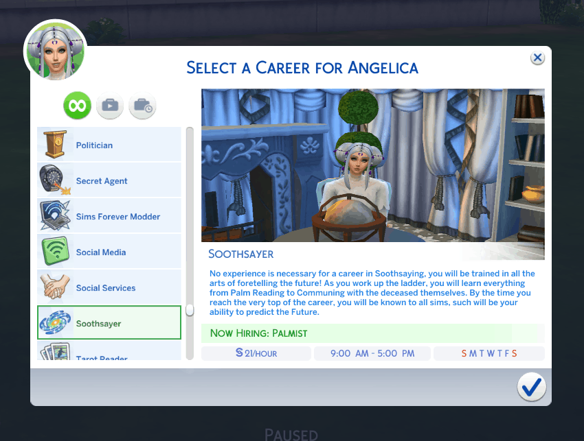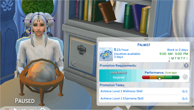 Description: No experience is necessary for a career in Soothsaying, you will be trained in all the arts of foretelling the future! As you work up the ladder, you will learn everything from Palm Reading to Communing with the deceased themselves. By the time you reach the very top of the career, you will be known to all sims, such will be your ability to predict the Future.