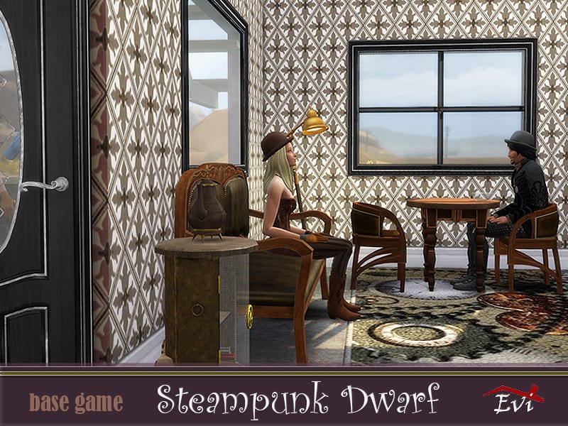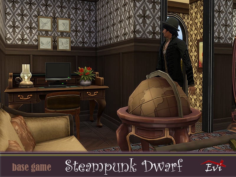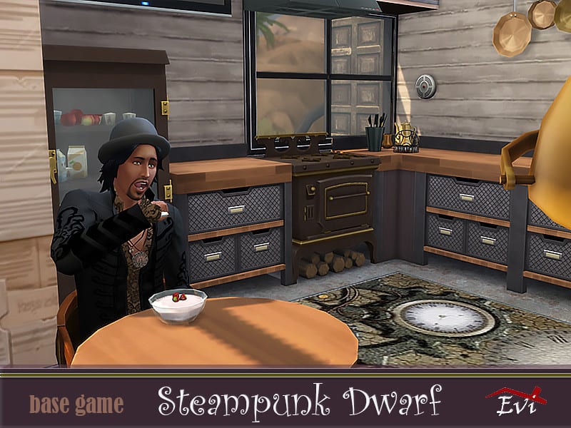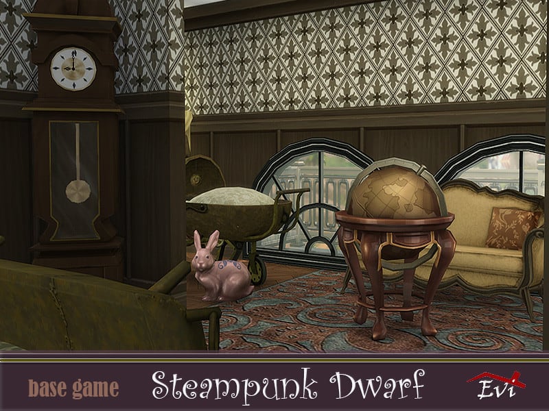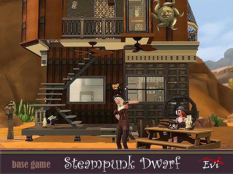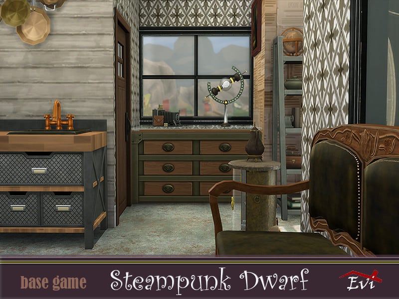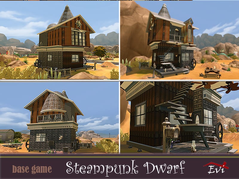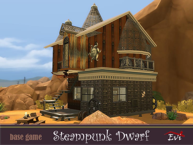 A tiny steampunk house with a bedroom on the second floor as well as some area for a baby to come.