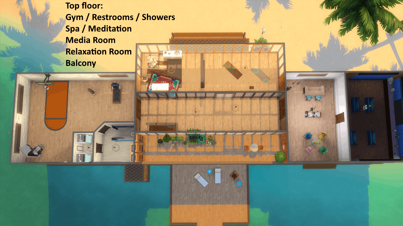 The uppermost floor has a hidden gem: a complete spa under a glass roof. There are yoga mats, a prayer mat, and massage chair and table so you can hire a professional or ask a loved one for a rub down. To either side of the spa you find more entertainment areas: The west wing has a full gym, including a basketball half-court. Along with the workout equipment, there is a full public bathroom for guests. In the west wing, you will find a Relaxation room with a bar and bubble machine. Through a door, you will enter the dark and cozy media room, to curl up on a couch and watch tv, a movie, or play a game.