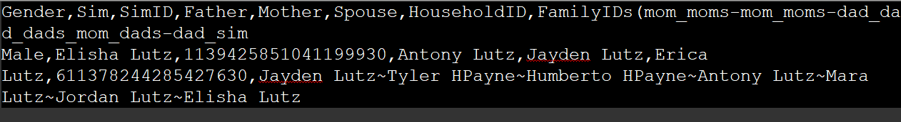 SimLog – Will create a logfile with Sim name, Sim Id, Fathers name, Mothers Name, Spoues name, Household ID, and it will list their Family parents of sim, parents of parent sim etc. it will output the logfile as FamilyFile.txt in the mods folder.