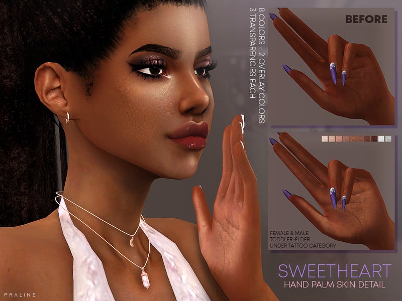 Our database contains only the highest quality Sims 4 mods that meet the most stringent requirements, like Sweetheart Hand Palms Skin Detail Sims 4 Mod. This guarantees that our visitors have access to the most exclusive and useful files.