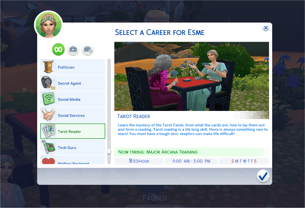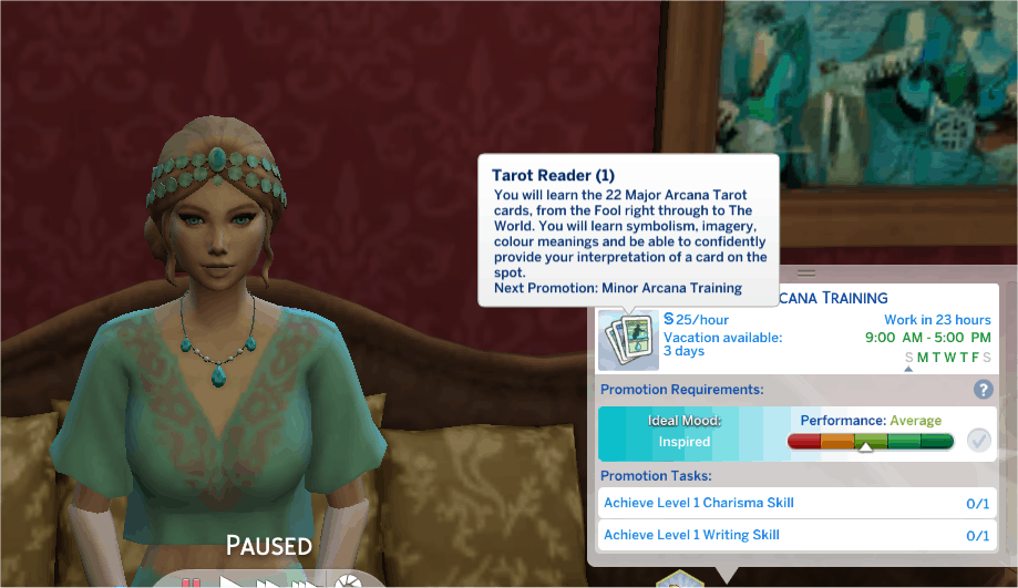 You are now so versed in the way of the Tarot, you train other sims with your experience and insight. You are never wrong in a Tarot Reading prediction and because of you, sims finally give Tarot Reading and its Readers, the respect it deserves. Be proud of your ability to help other sims work through issues in their lives and never forget, there is always something new to learn from the cards.