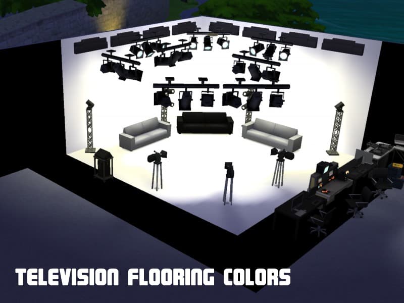 Flooring colors suitable for television and movie studios. This set features pure black and pure white alongside Chroma Key colors of green and blue. This set works in combination with my Television Backdrop Colors set to allow near seamless flow of backdrops. Requests welcome.