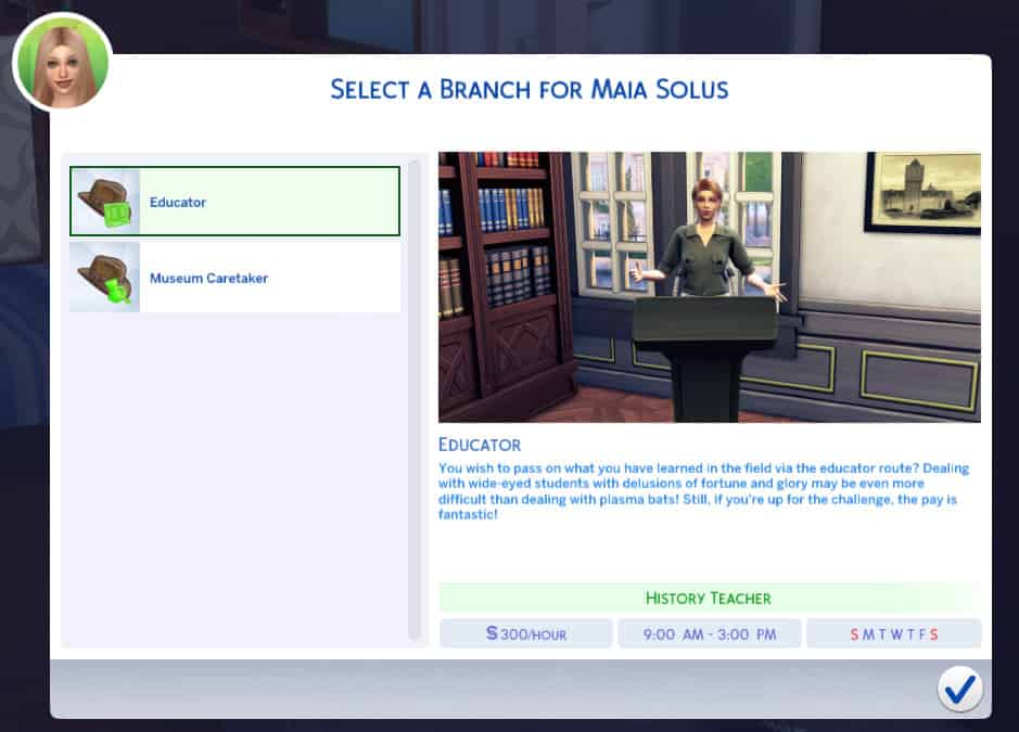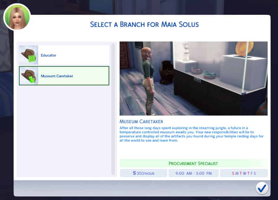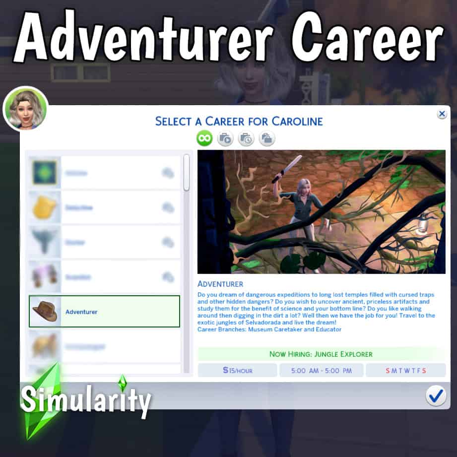 I have also made this career compatible with Discover University. Get a certain degree and you can jump to one of the two career branches! (I split that part of the mod into another package so that it?s optional incase you don?t have University or don?t want that functionality for some reason.) This career does however require the Jungle Adventure Game Pack so keep that in mind.