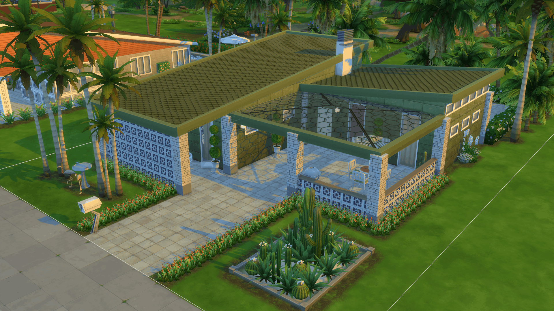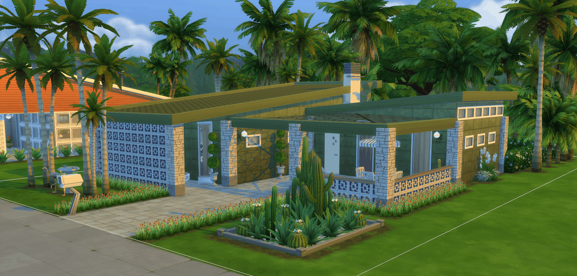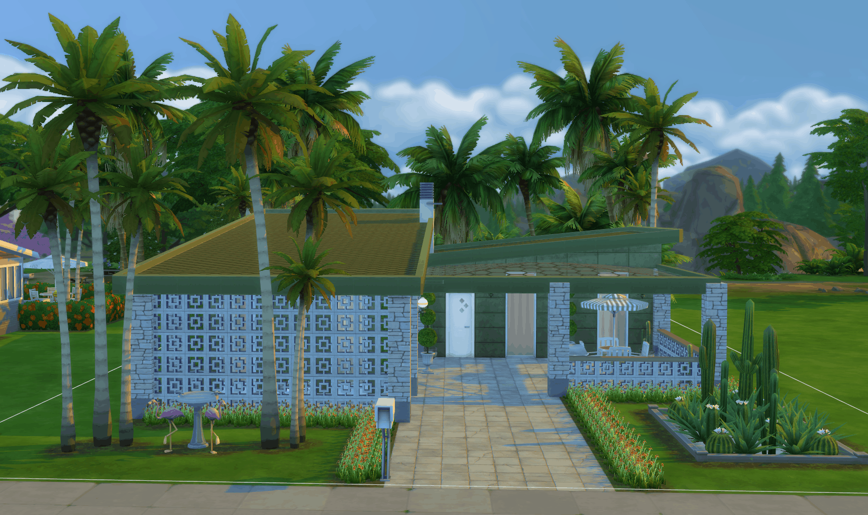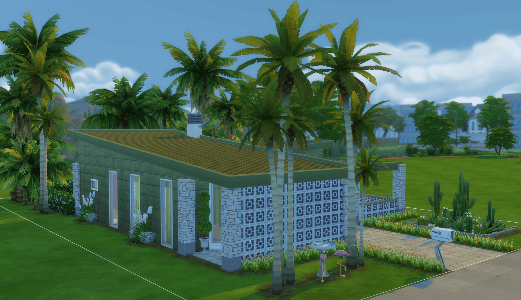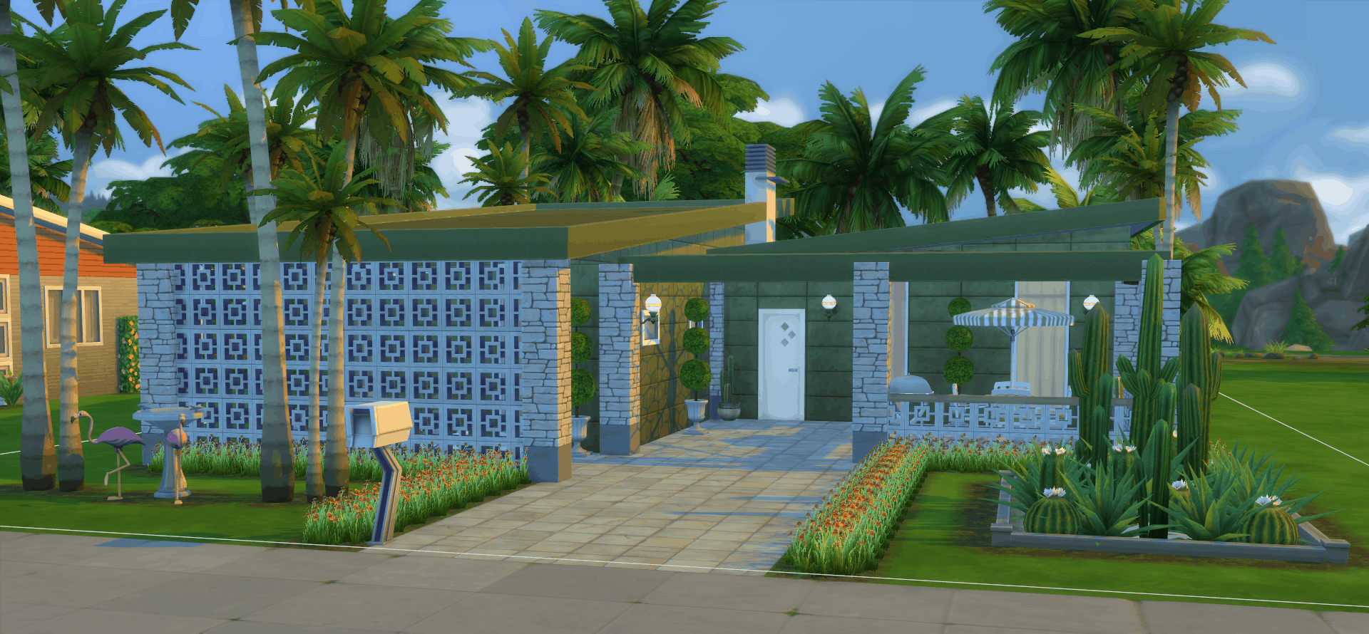 Hello everyone! I’m back with another home from my Atomic Acres neighorhood. I call this one The Mulholland Drive because I thought of California while building it. It’s a three bedroom, one bathroom home with a livingroom done in Hollywood and Japanese themes. The kitchen has an eat-in area, and the bathroom has a laundry room adjacent to it. The smaller of the three bedrooms can be for children if needed. Feel free to change things to suit your needs. The pool area is very secluded among the palms and shrubbery, and there’s a sitting area under the front awning with a place to grill. I used the new Eco-Lifestyle roofing for this build as well. I hope you all like it! I’ve included an additional photo to show where I built the lot, but you can place it wherever you please. My Sim featured in the pics does not come with the home.