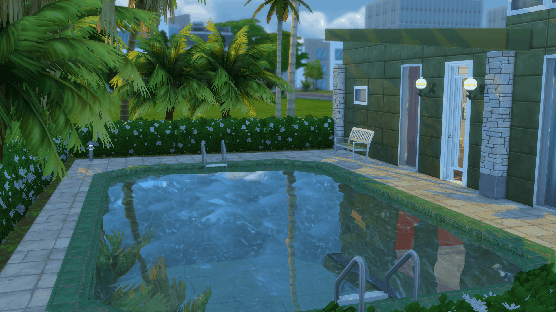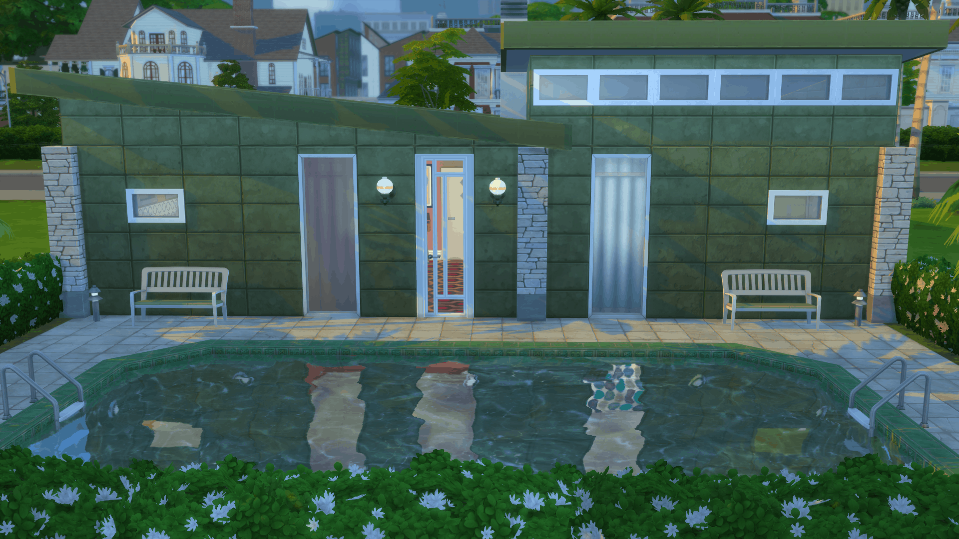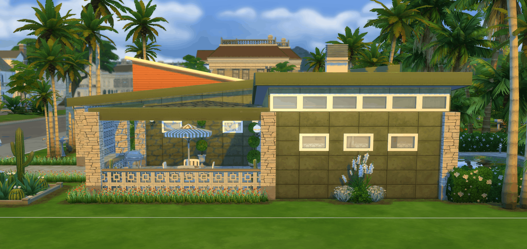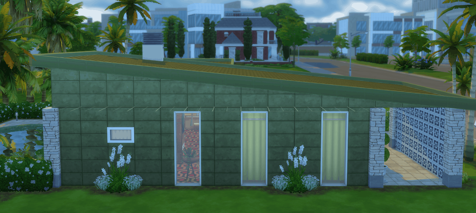 Hello everyone! I’m back with another home from my Atomic Acres neighorhood. I call this one The Mulholland Drive because I thought of California while building it. It’s a three bedroom, one bathroom home with a livingroom done in Hollywood and Japanese themes. The kitchen has an eat-in area, and the bathroom has a laundry room adjacent to it. The smaller of the three bedrooms can be for children if needed. Feel free to change things to suit your needs. The pool area is very secluded among the palms and shrubbery, and there’s a sitting area under the front awning with a place to grill. I used the new Eco-Lifestyle roofing for this build as well. I hope you all like it! I’ve included an additional photo to show where I built the lot, but you can place it wherever you please. My Sim featured in the pics does not come with the home.