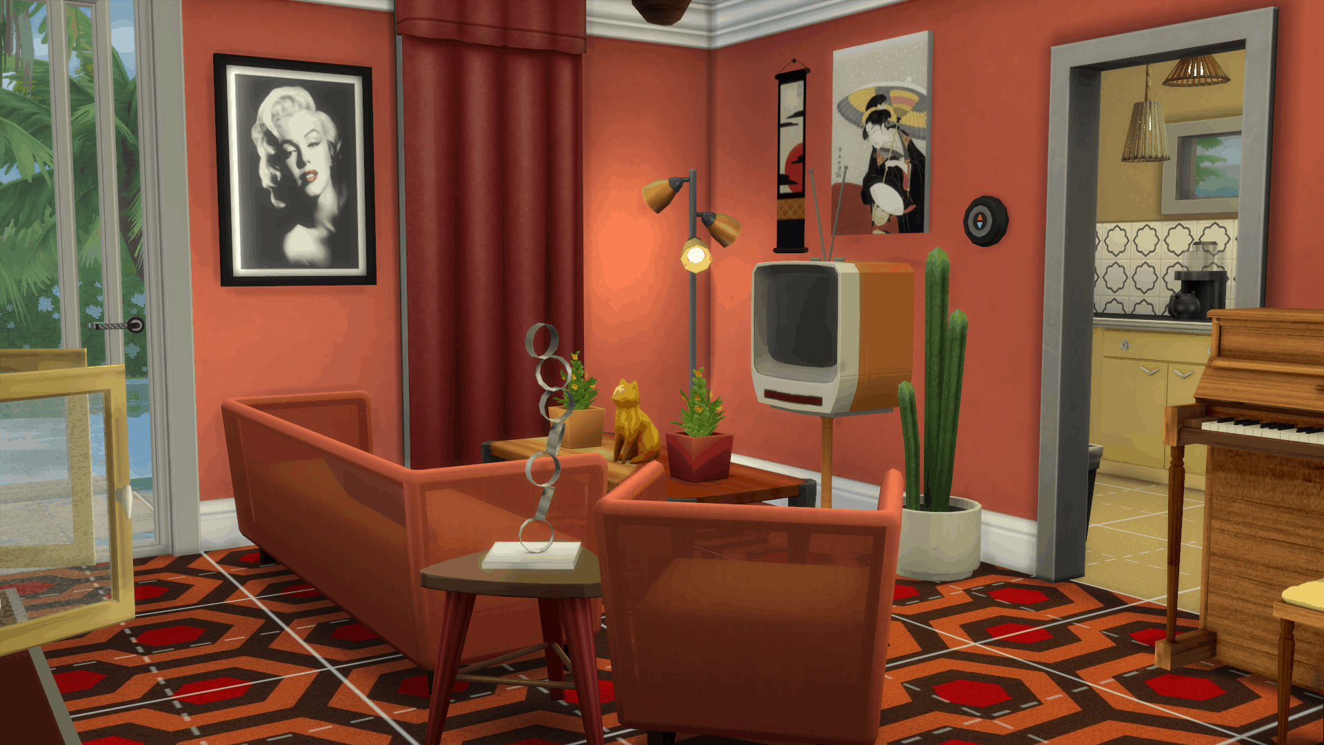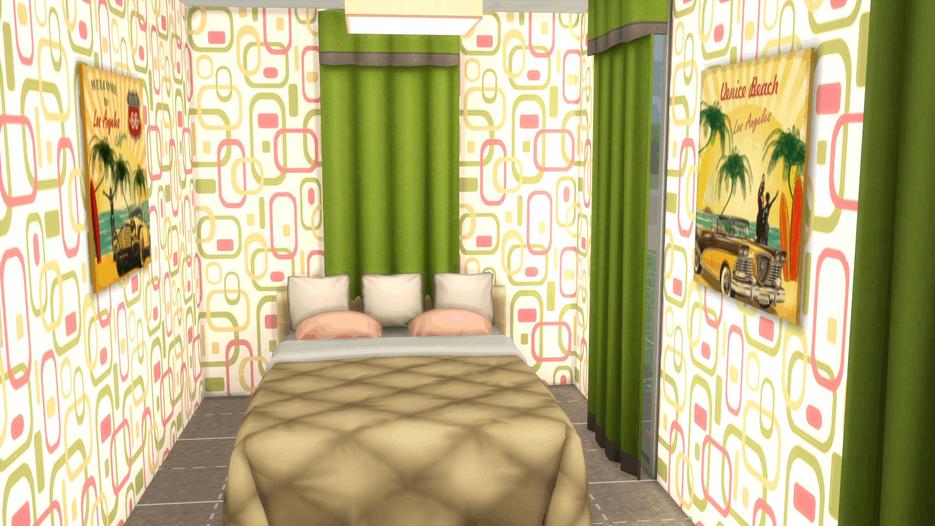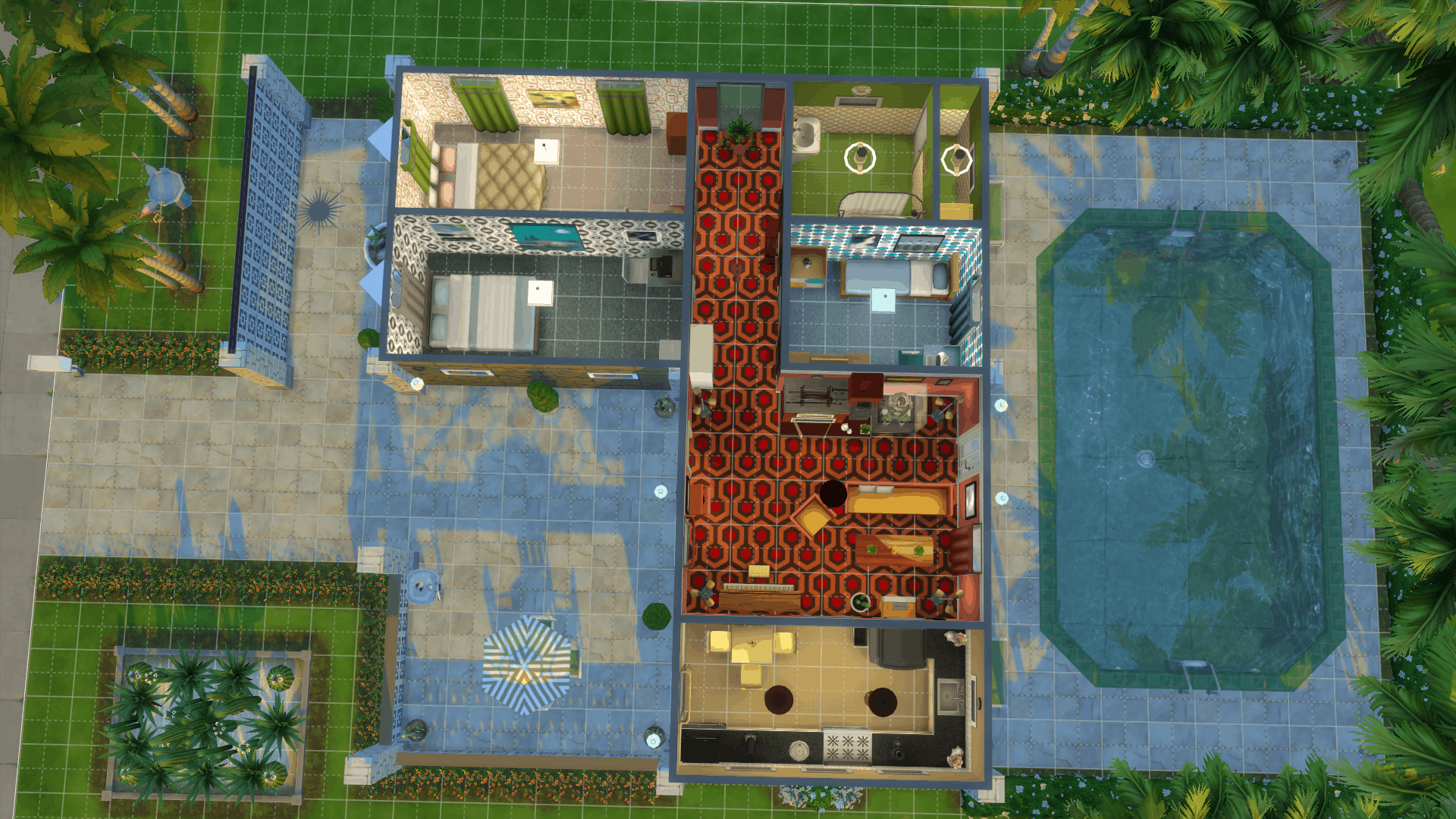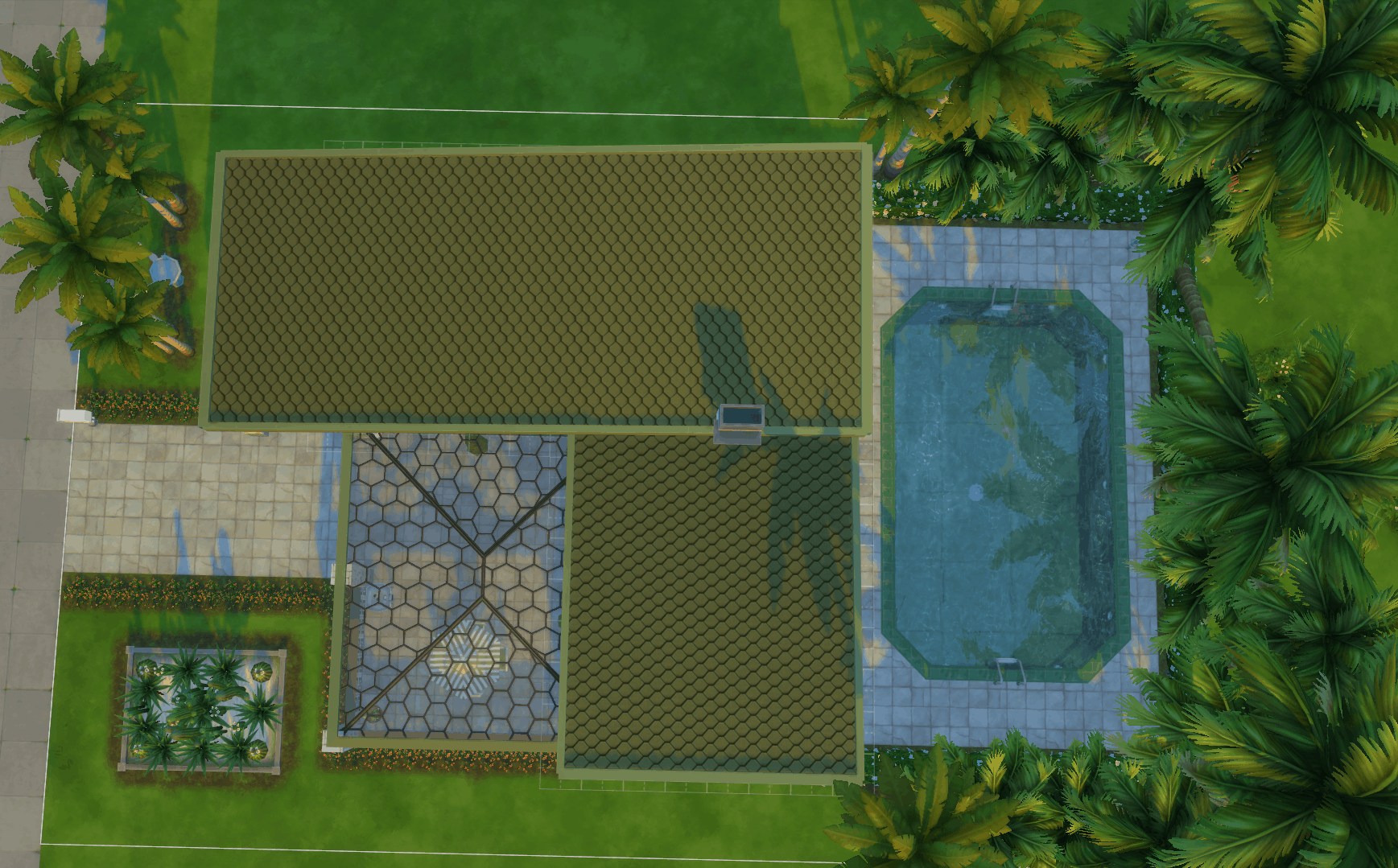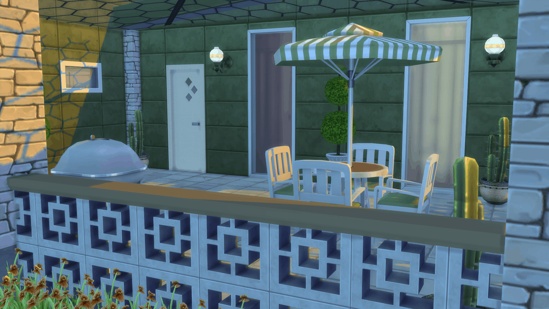 Hello everyone! I’m back with another home from my Atomic Acres neighorhood. I call this one The Mulholland Drive because I thought of California while building it. It’s a three bedroom, one bathroom home with a livingroom done in Hollywood and Japanese themes. The kitchen has an eat-in area, and the bathroom has a laundry room adjacent to it. The smaller of the three bedrooms can be for children if needed. Feel free to change things to suit your needs. The pool area is very secluded among the palms and shrubbery, and there’s a sitting area under the front awning with a place to grill. I used the new Eco-Lifestyle roofing for this build as well. I hope you all like it! I’ve included an additional photo to show where I built the lot, but you can place it wherever you please. My Sim featured in the pics does not come with the home.