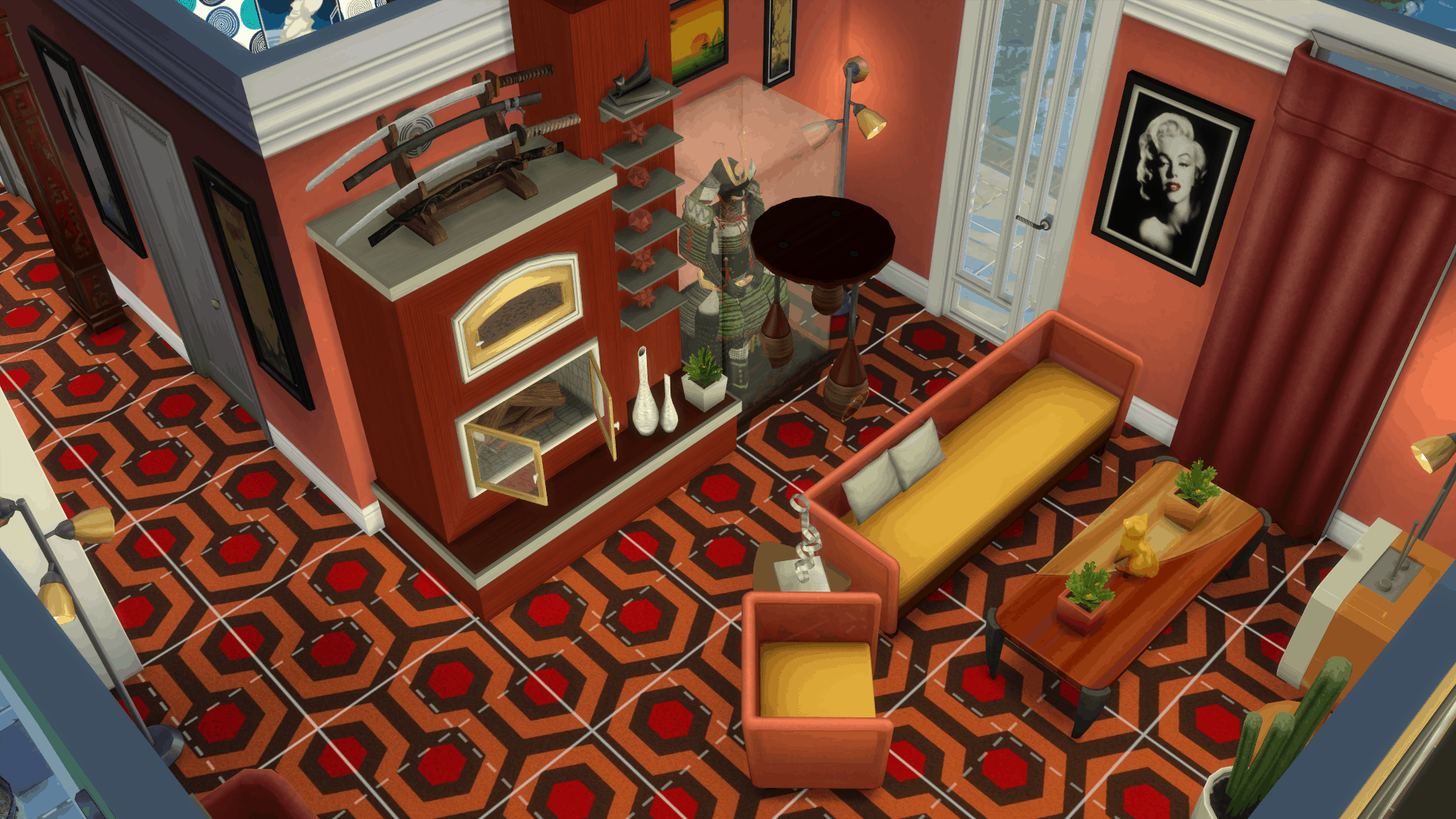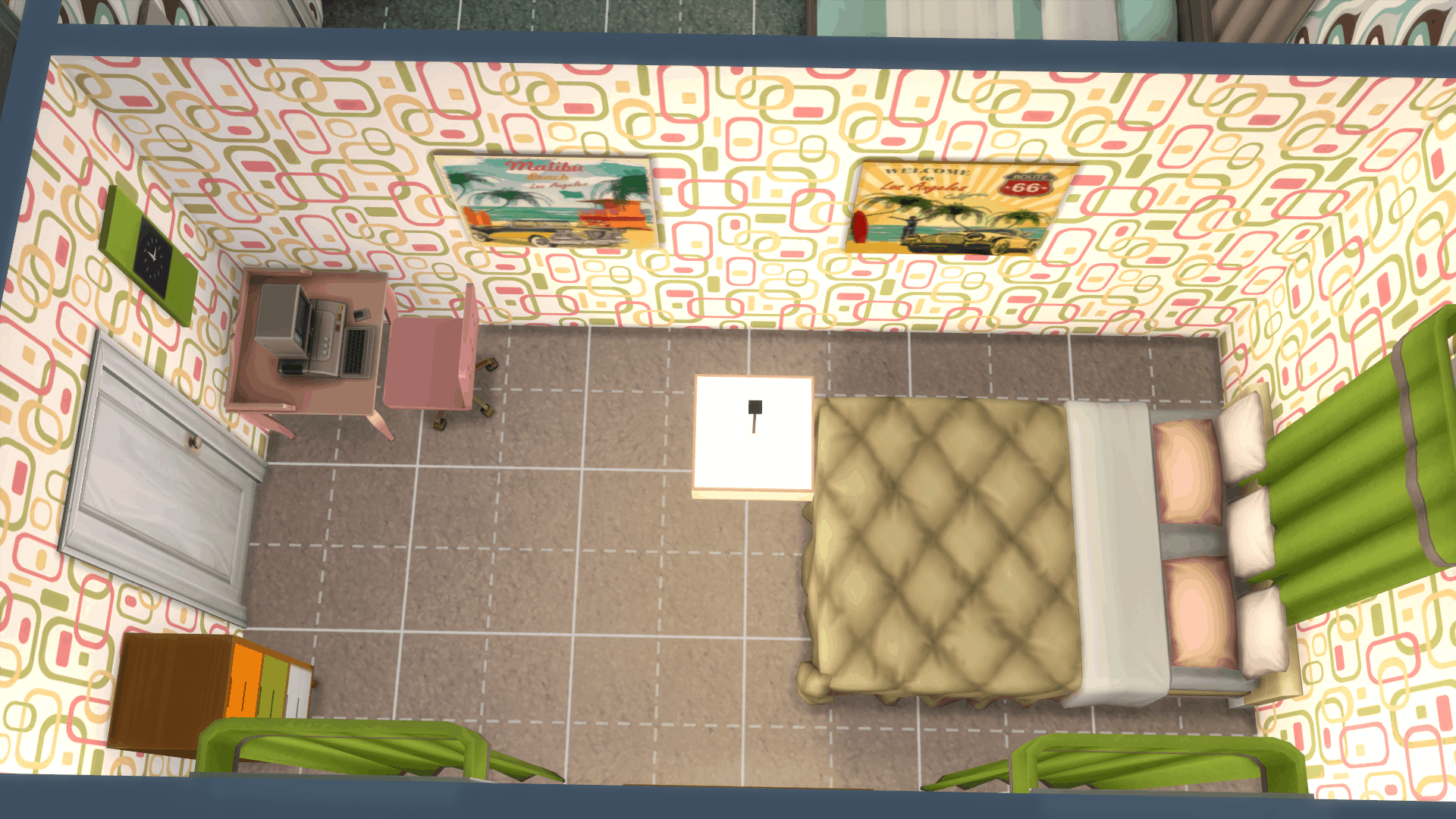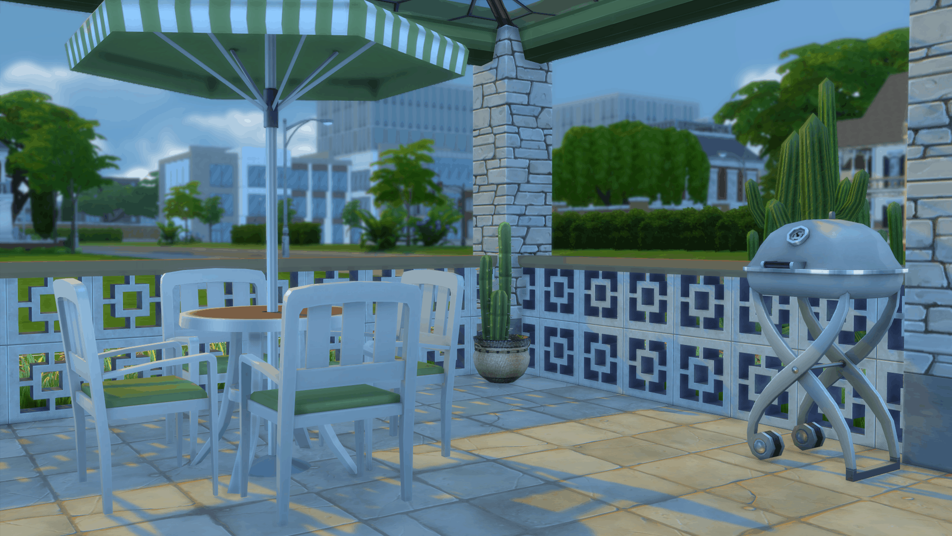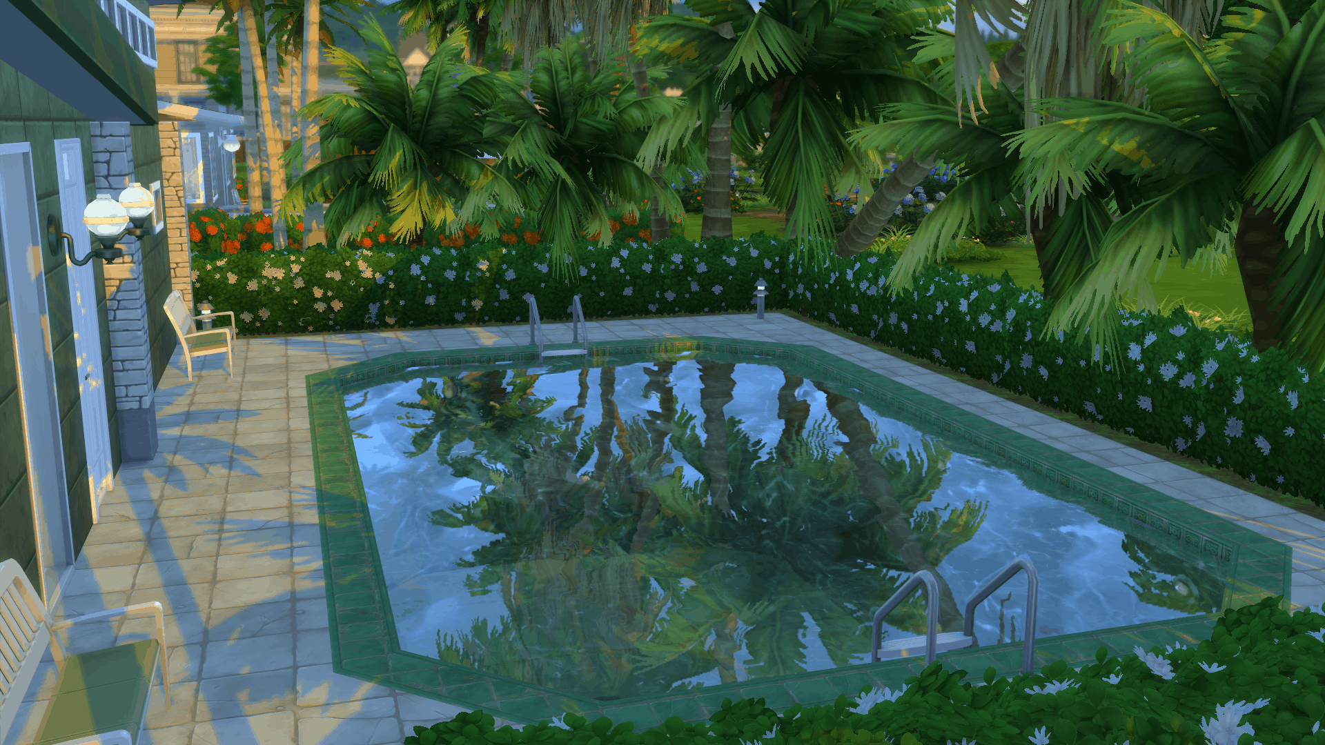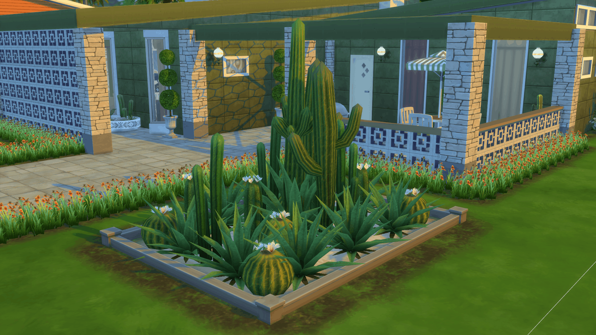 Hello everyone! I’m back with another home from my Atomic Acres neighorhood. I call this one The Mulholland Drive because I thought of California while building it. It’s a three bedroom, one bathroom home with a livingroom done in Hollywood and Japanese themes. The kitchen has an eat-in area, and the bathroom has a laundry room adjacent to it. The smaller of the three bedrooms can be for children if needed. Feel free to change things to suit your needs. The pool area is very secluded among the palms and shrubbery, and there’s a sitting area under the front awning with a place to grill. I used the new Eco-Lifestyle roofing for this build as well. I hope you all like it! I’ve included an additional photo to show where I built the lot, but you can place it wherever you please. My Sim featured in the pics does not come with the home.