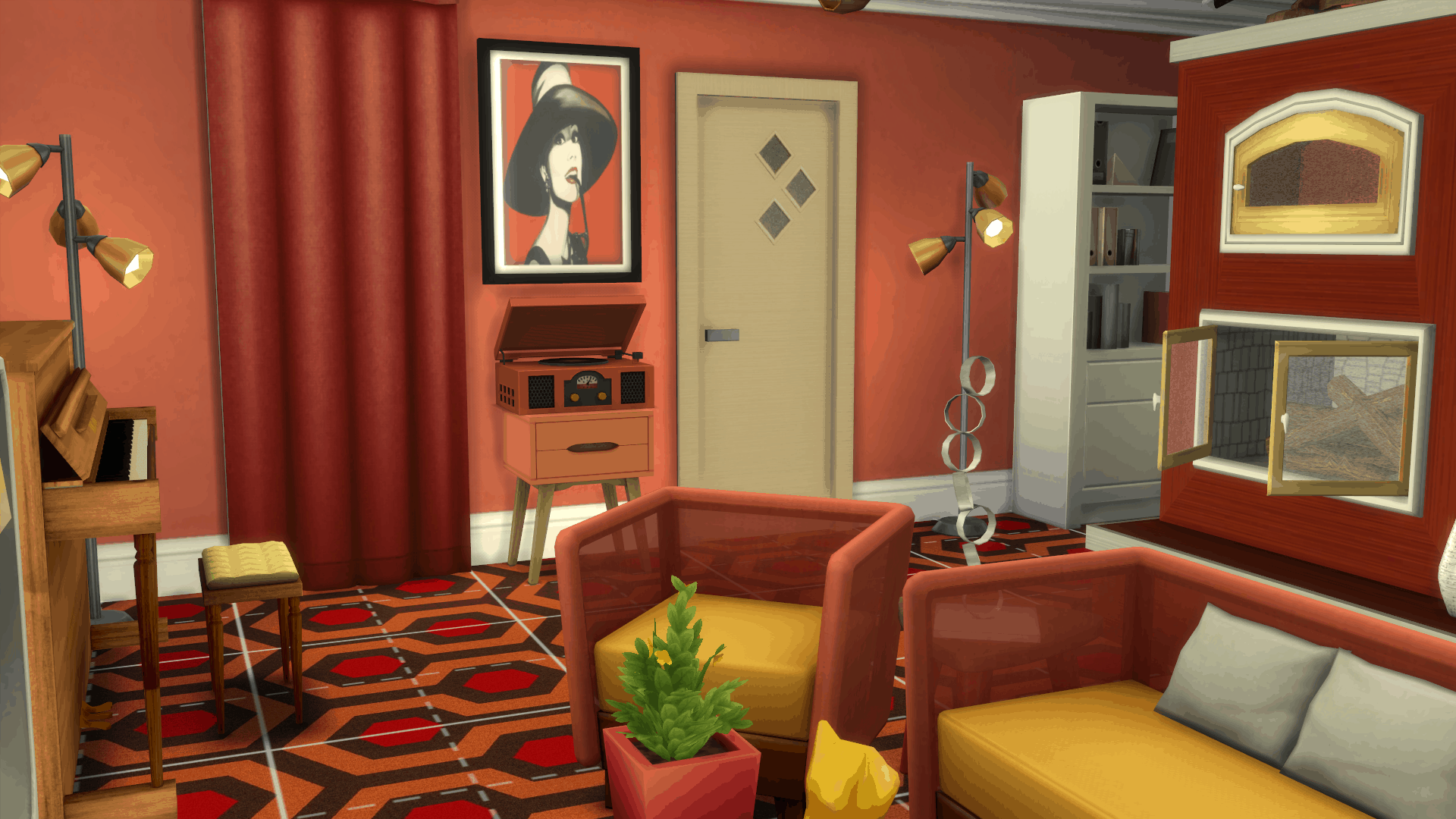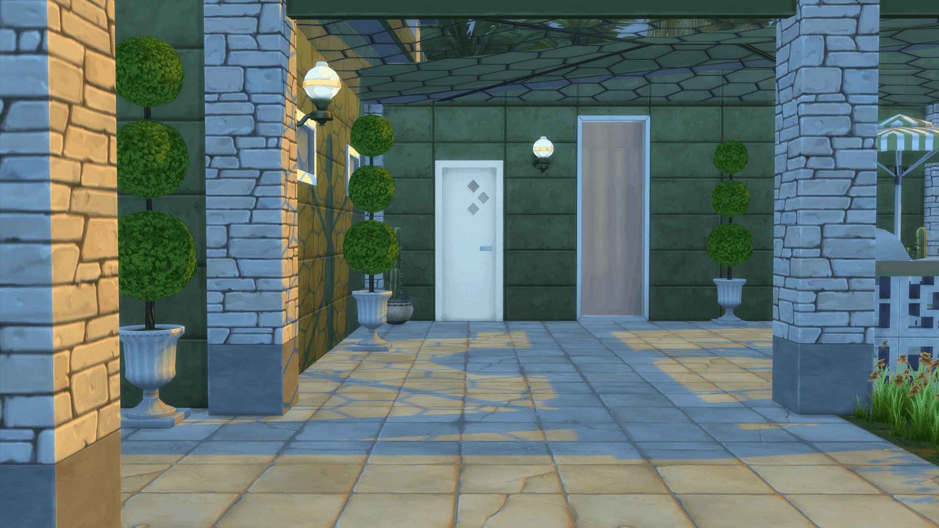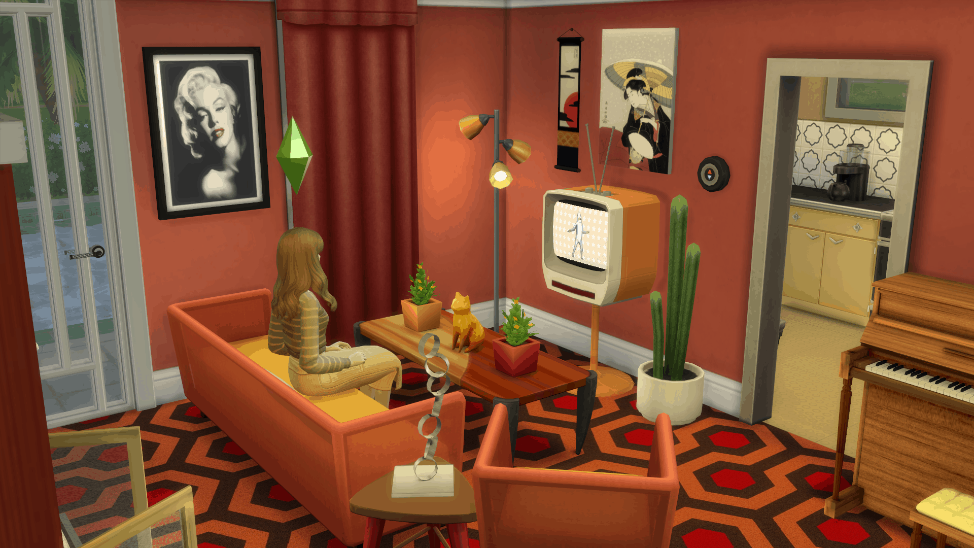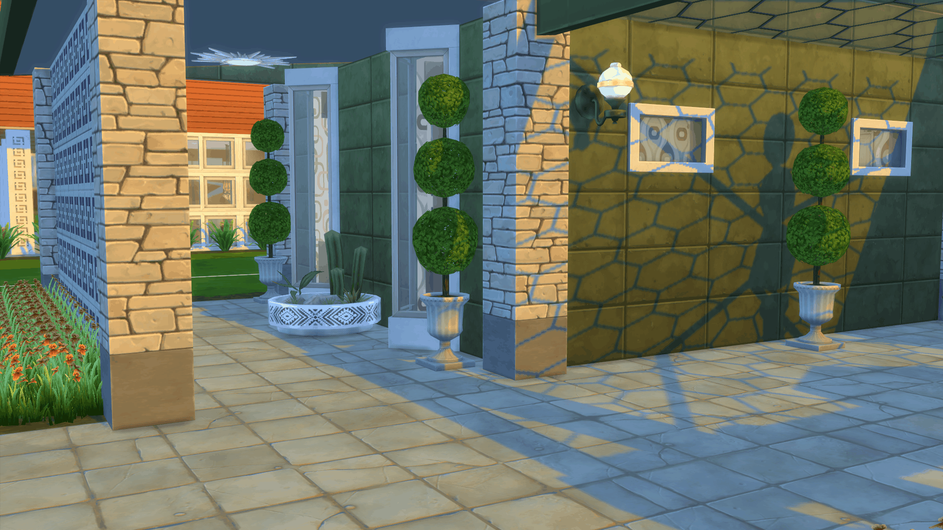 Hello everyone! I’m back with another home from my Atomic Acres neighorhood. I call this one The Mulholland Drive because I thought of California while building it. It’s a three bedroom, one bathroom home with a livingroom done in Hollywood and Japanese themes. The kitchen has an eat-in area, and the bathroom has a laundry room adjacent to it. The smaller of the three bedrooms can be for children if needed. Feel free to change things to suit your needs. The pool area is very secluded among the palms and shrubbery, and there’s a sitting area under the front awning with a place to grill. I used the new Eco-Lifestyle roofing for this build as well. I hope you all like it! I’ve included an additional photo to show where I built the lot, but you can place it wherever you please. My Sim featured in the pics does not come with the home.