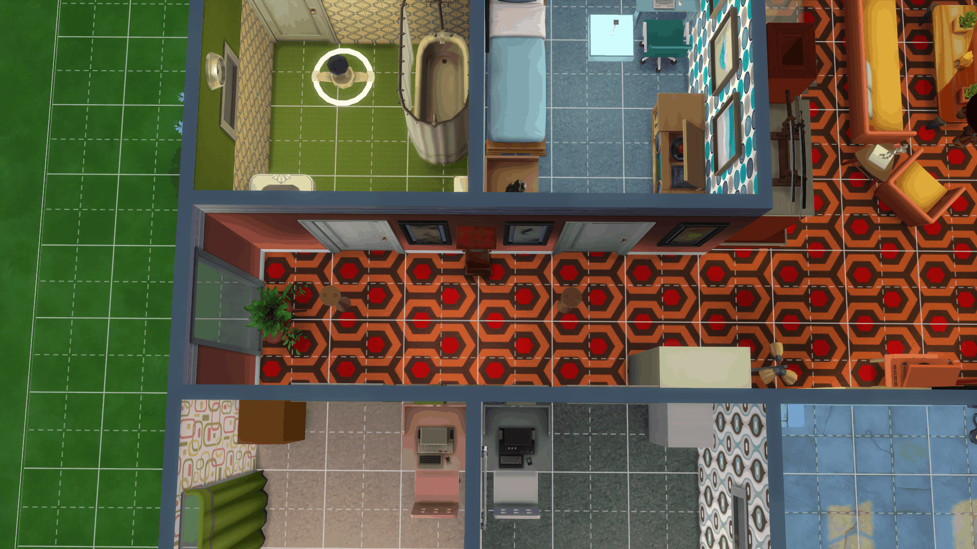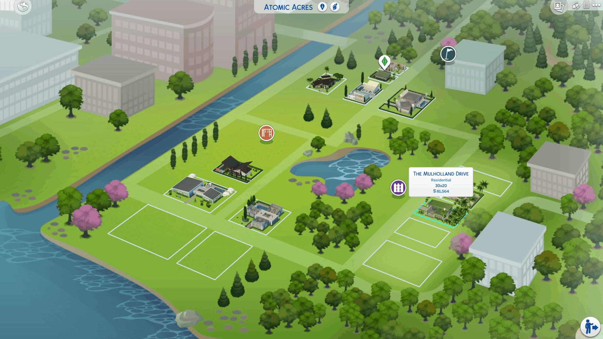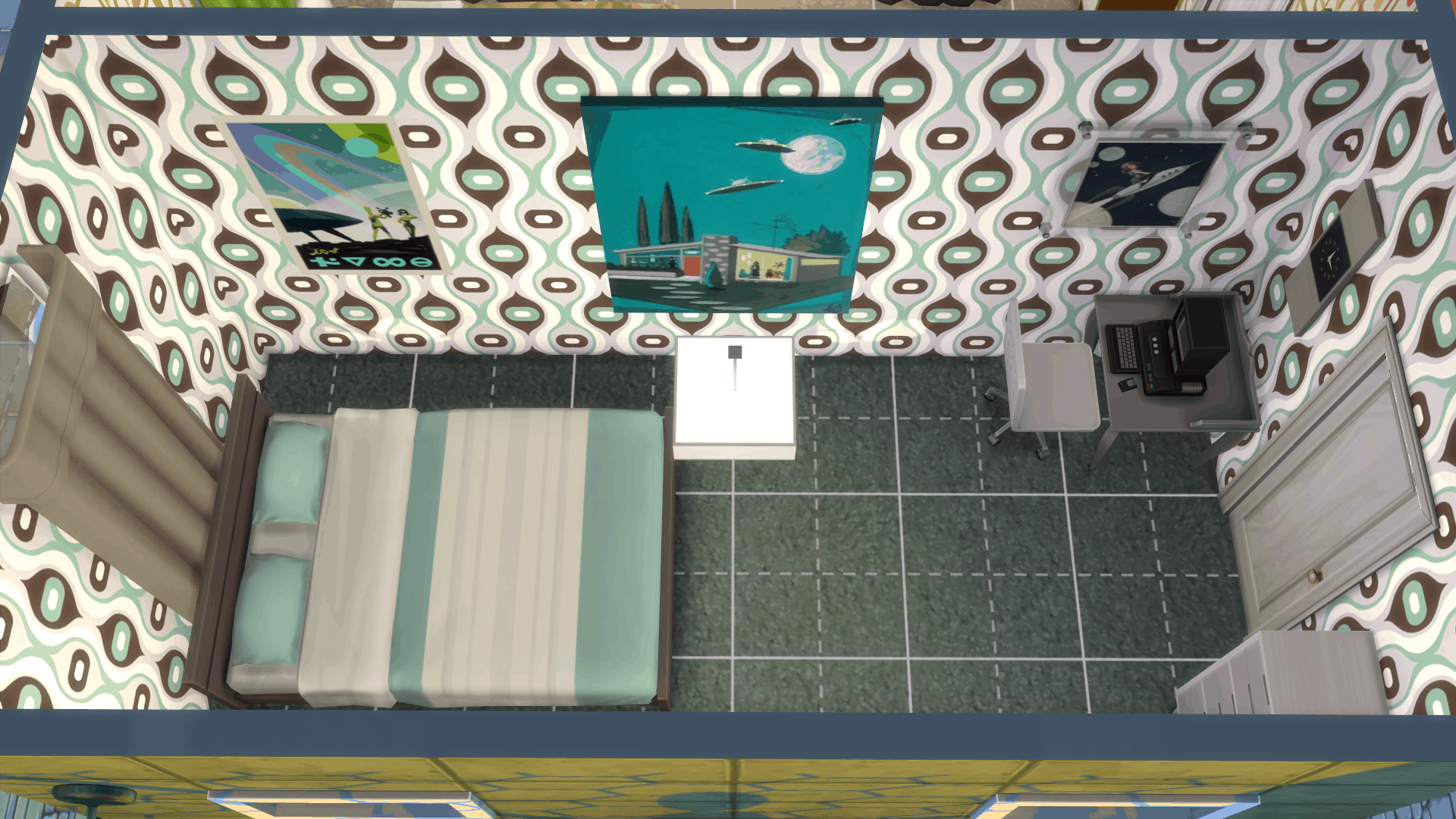 Presenting Atomic Acres lot number 10 – The Mulholland Drive! Have you ever wanted to live in California? Well now you can without ever leaving our neighborhood! This charming Mid-Century home features a theme in California green surrounded by a garden of palm trees and cacti. You’ll simply adore the living room carpeting done in reference to a very well known Hollywood movie! This three bedroom home features brand new solar roofing of the Space Age, and a sitting area underneath a glassed awning over the front entryway. The backyard gives you a secluded pool area nestled quietly between the towering palms. The perferct romantic hideaway!