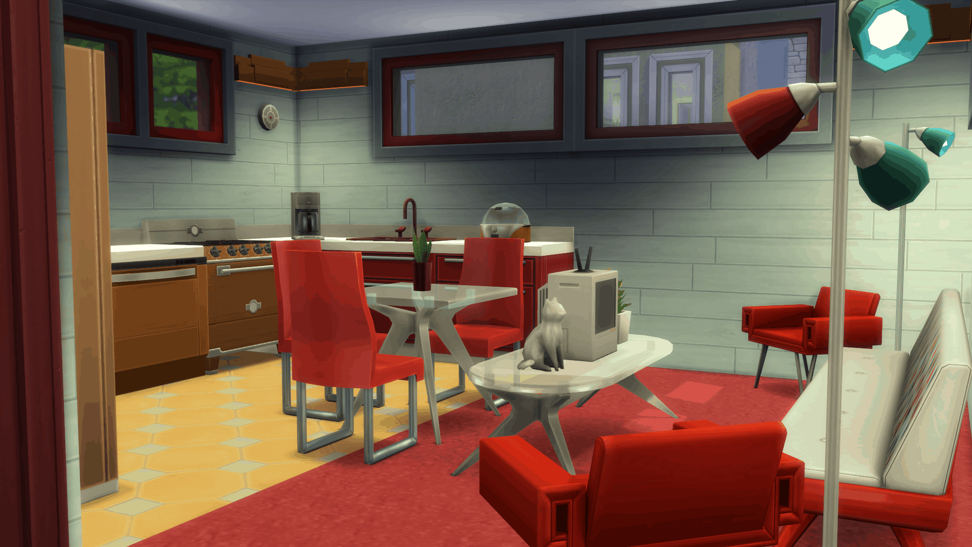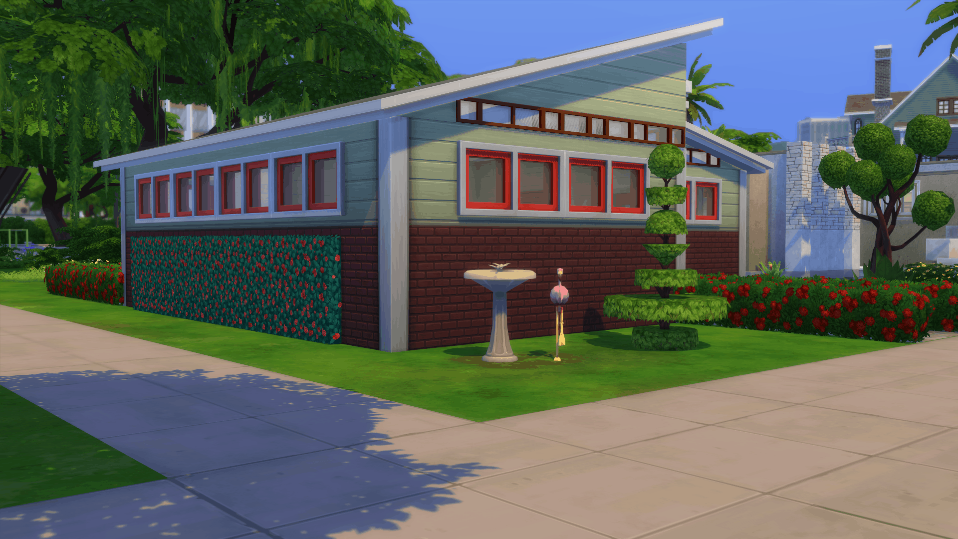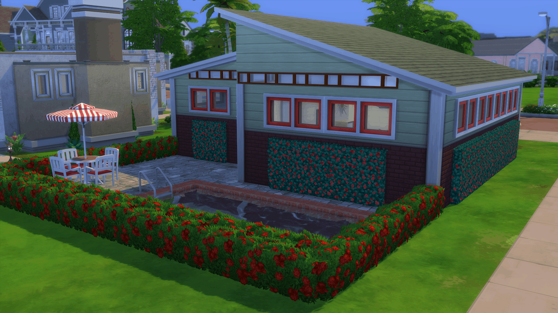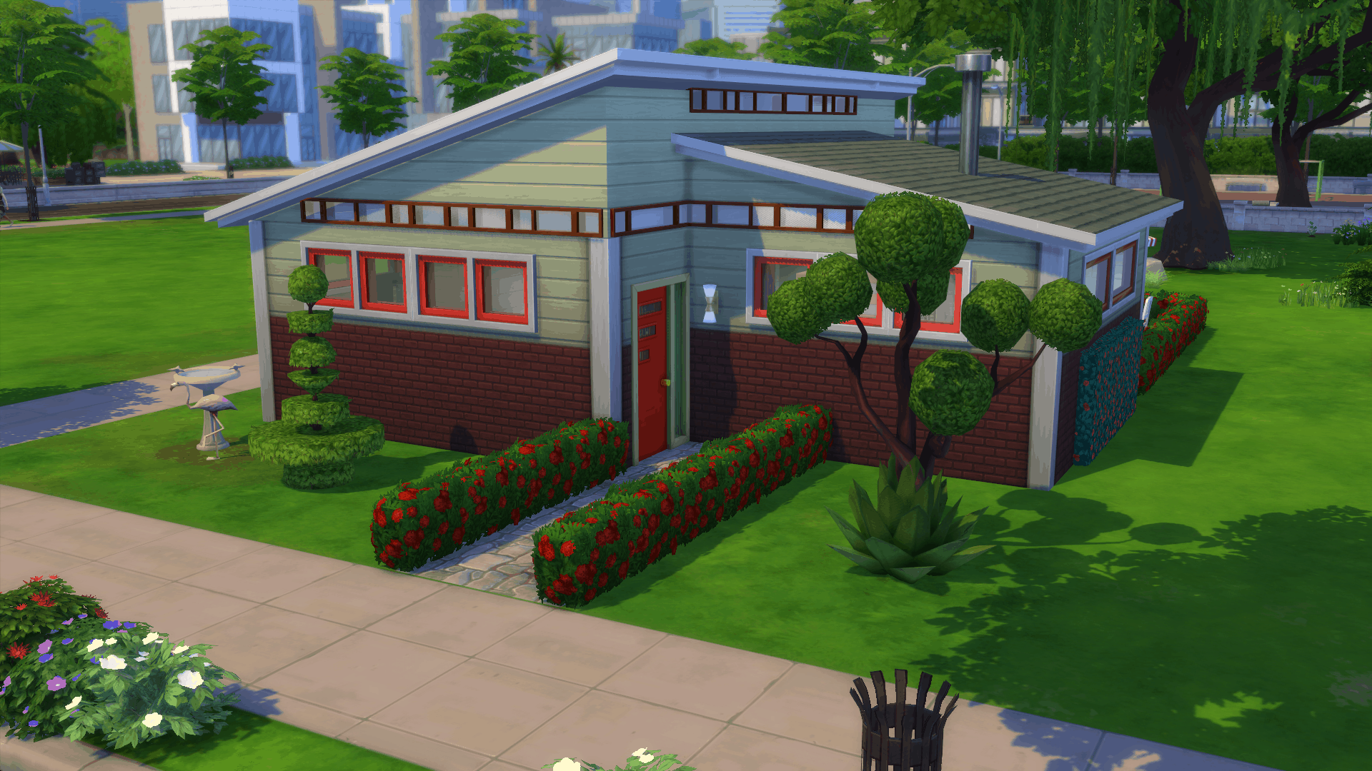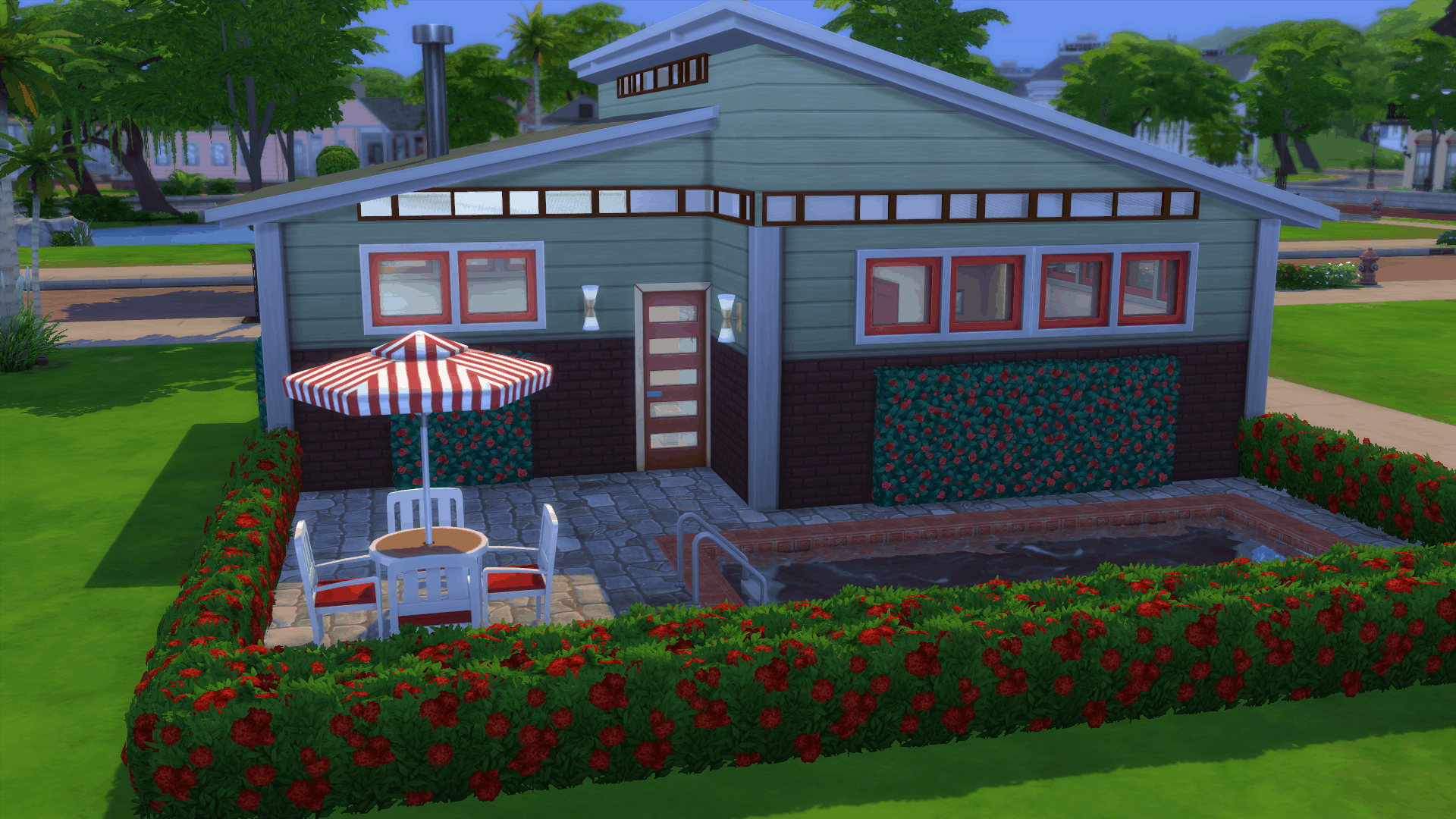 Hello fellow Simmers! I’m back again with another mid-century modern house design from my fictional Atomic Acres neighborhood. I really loved building this one in traditional style, and I like the roof lines I chose for the exterior look. I think it turned out to be very eye-catching. I chose mostly reds, greens, and yellows for the classic and iconic Atomic and Space Age appeal. This is a two bedroom small home or starter home. Perfect for starting a family. The smaller room done in red and black can be for children or teens (or a nursery if you change it around) and the larger bedroom has the Tiny Living themed objects, including a fold-out bed. There are two full bathrooms as well. It has a pool and a patio for the enclosed backyard. I hope you all enjoy it!