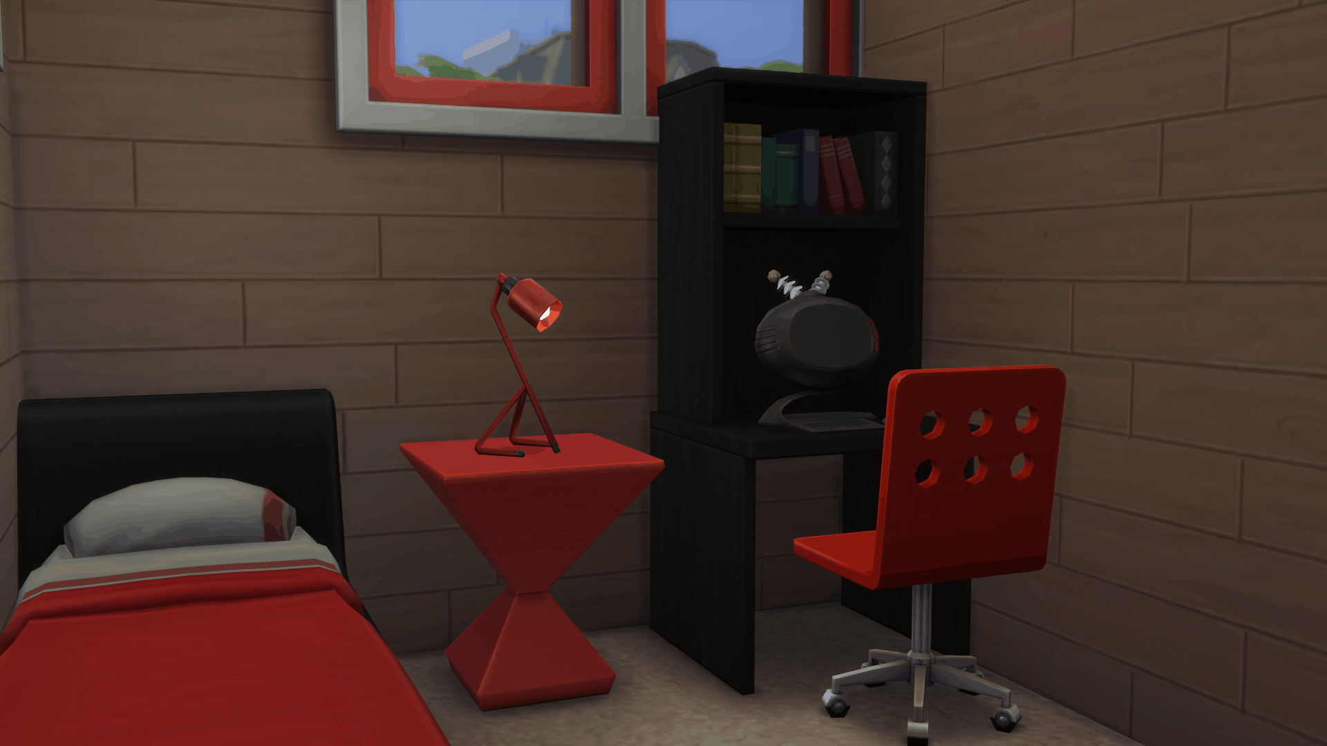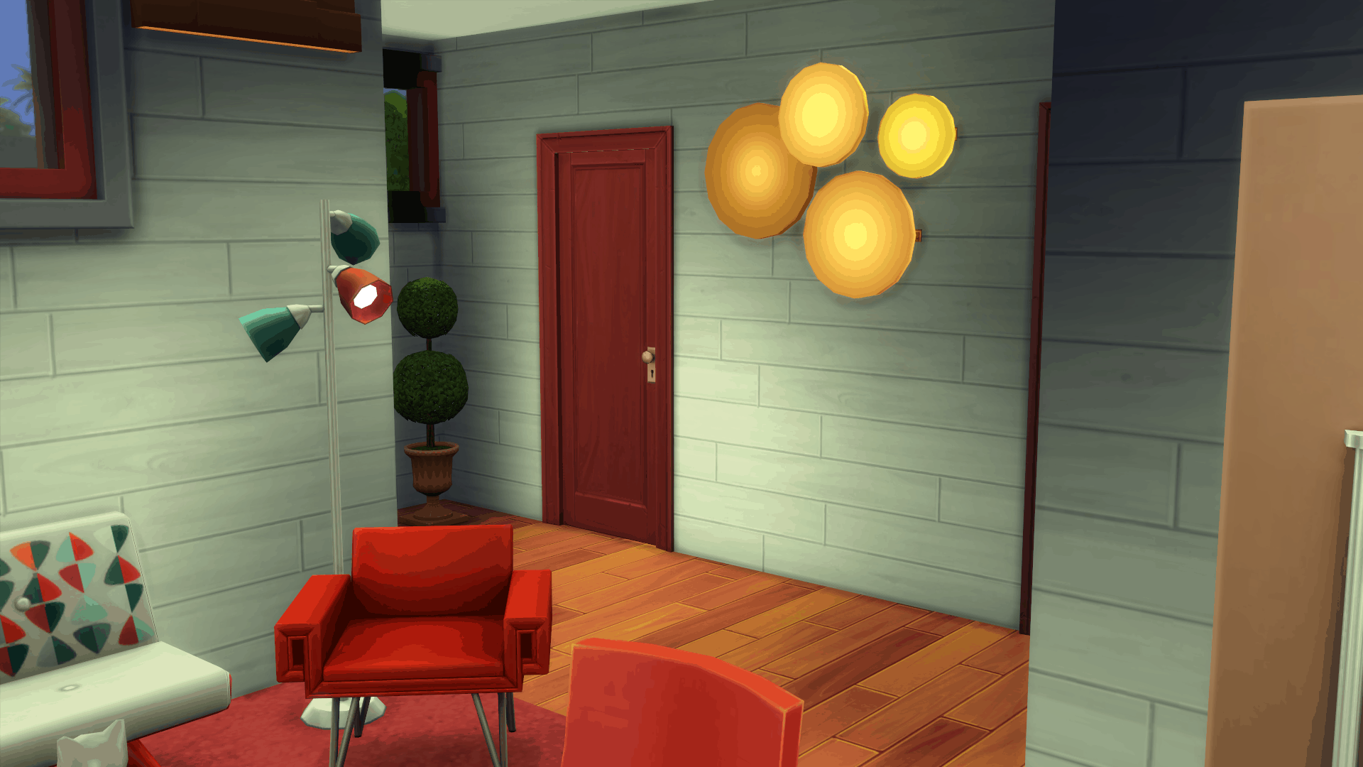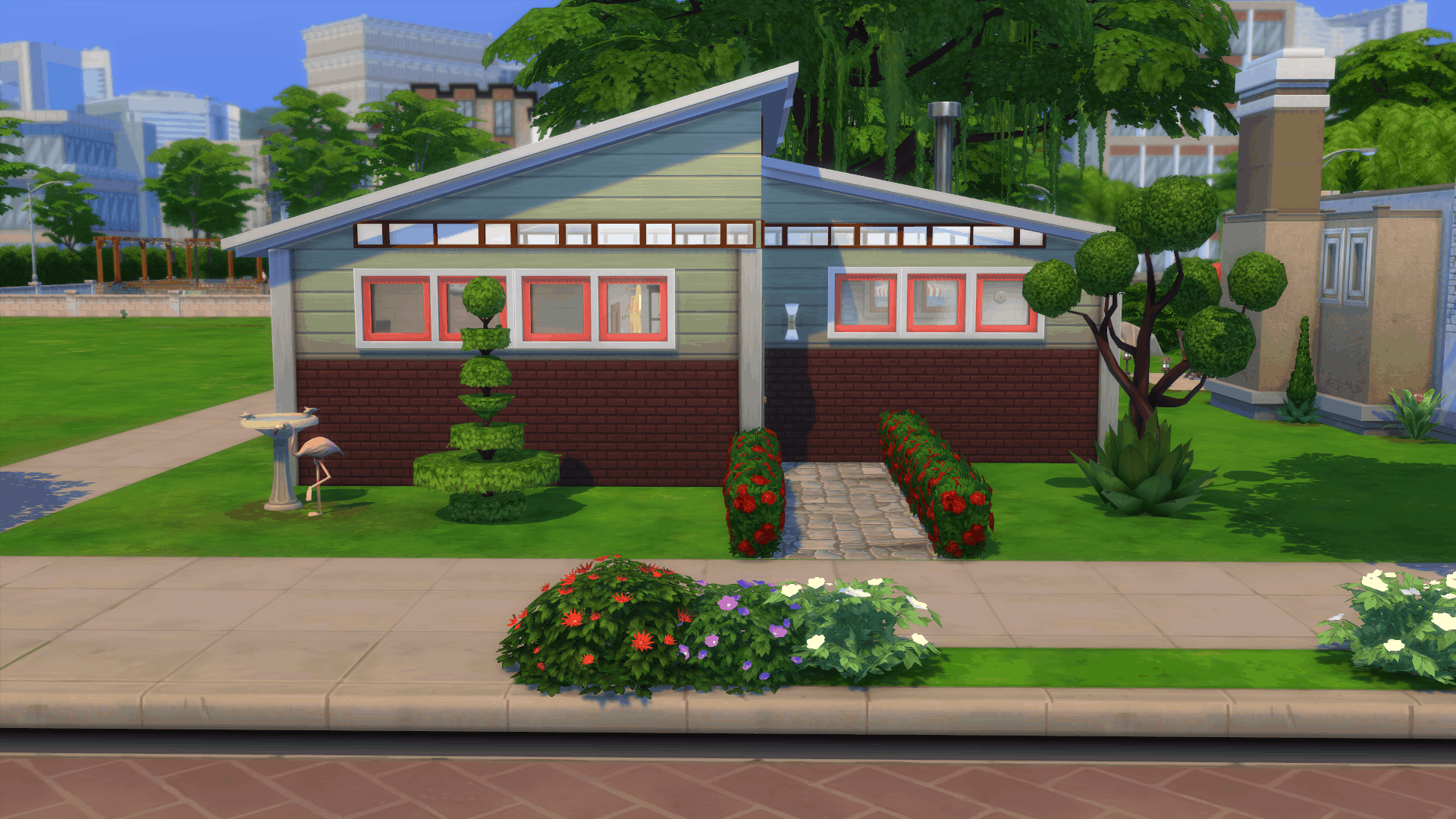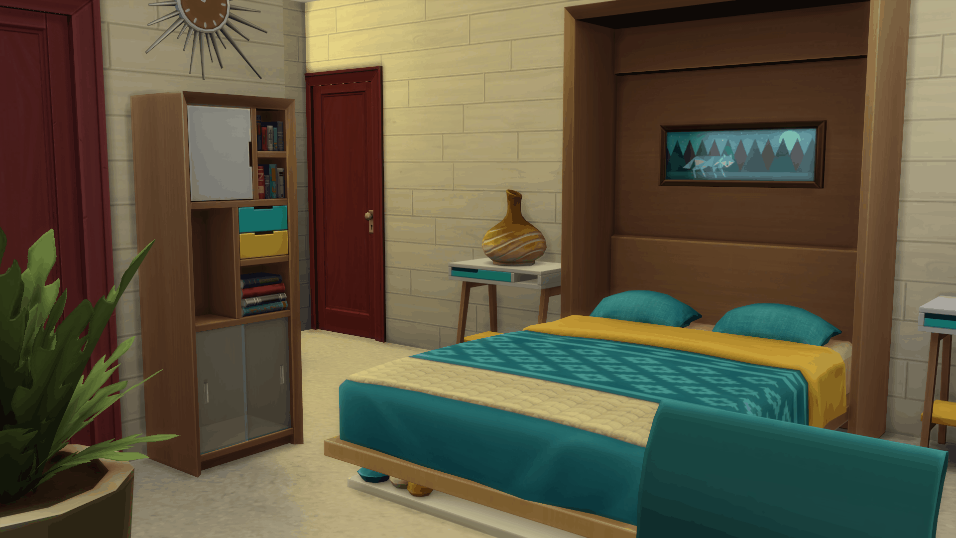 Hello fellow Simmers! I’m back again with another mid-century modern house design from my fictional Atomic Acres neighborhood. I really loved building this one in traditional style, and I like the roof lines I chose for the exterior look. I think it turned out to be very eye-catching. I chose mostly reds, greens, and yellows for the classic and iconic Atomic and Space Age appeal. This is a two bedroom small home or starter home. Perfect for starting a family. The smaller room done in red and black can be for children or teens (or a nursery if you change it around) and the larger bedroom has the Tiny Living themed objects, including a fold-out bed. There are two full bathrooms as well. It has a pool and a patio for the enclosed backyard. I hope you all enjoy it!