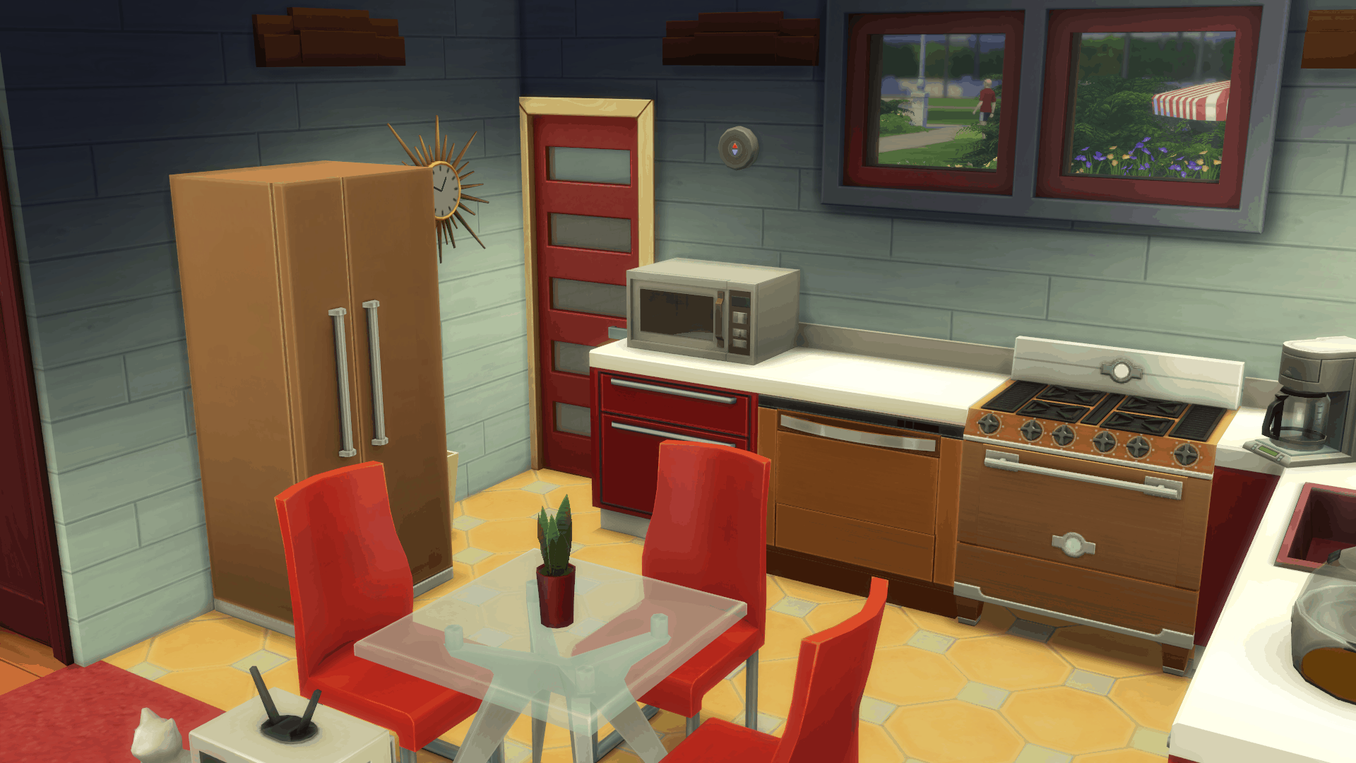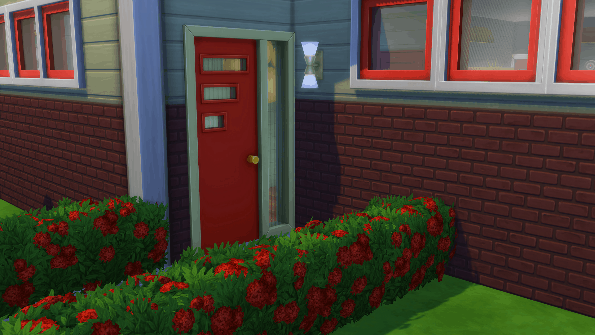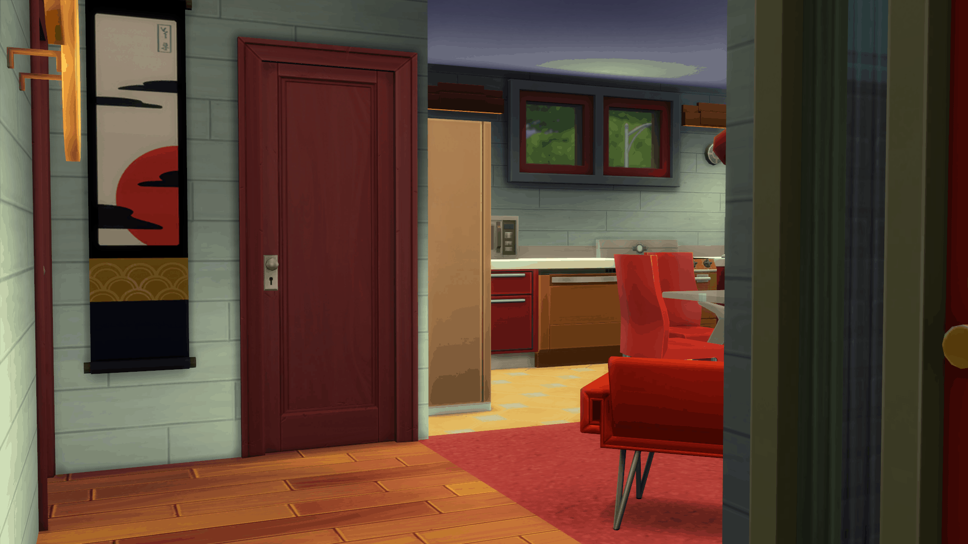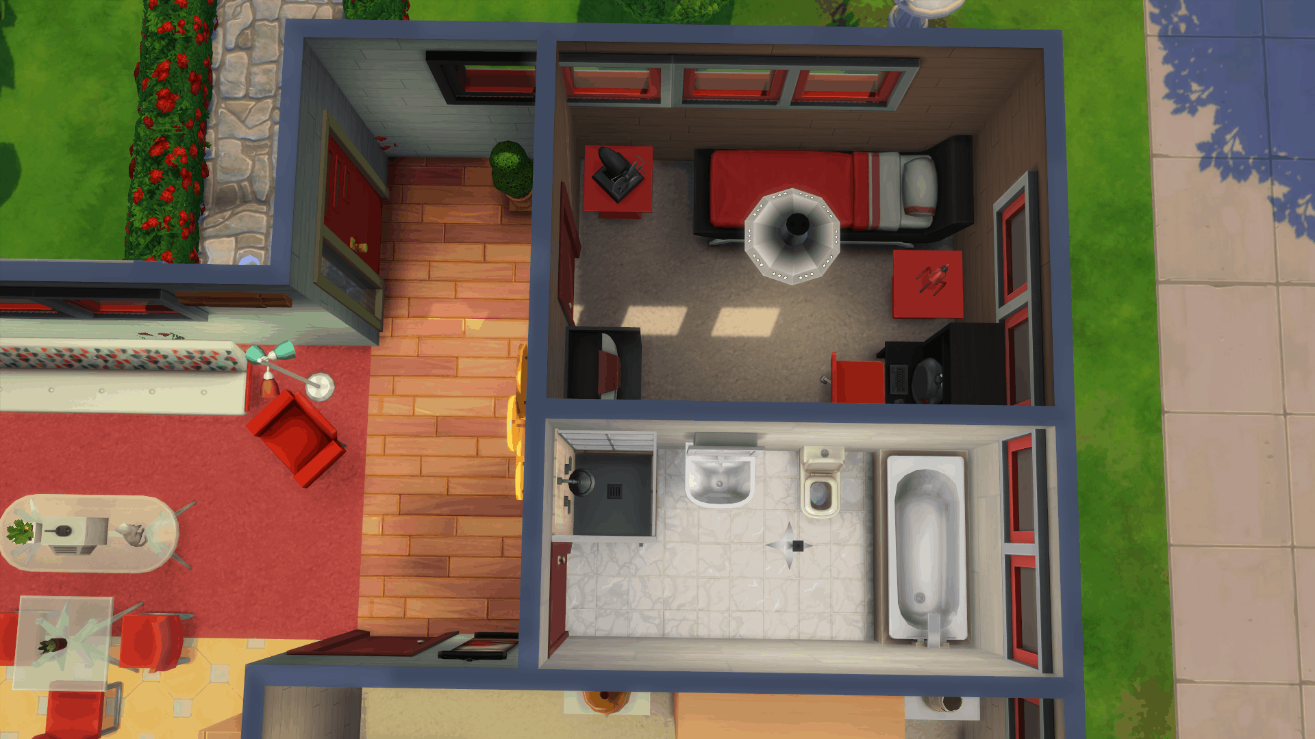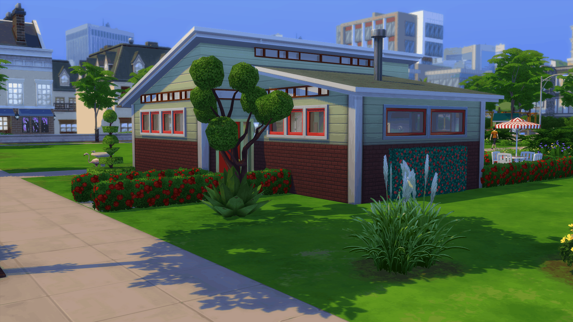 Hello fellow Simmers! I’m back again with another mid-century modern house design from my fictional Atomic Acres neighborhood. I really loved building this one in traditional style, and I like the roof lines I chose for the exterior look. I think it turned out to be very eye-catching. I chose mostly reds, greens, and yellows for the classic and iconic Atomic and Space Age appeal. This is a two bedroom small home or starter home. Perfect for starting a family. The smaller room done in red and black can be for children or teens (or a nursery if you change it around) and the larger bedroom has the Tiny Living themed objects, including a fold-out bed. There are two full bathrooms as well. It has a pool and a patio for the enclosed backyard. I hope you all enjoy it!
