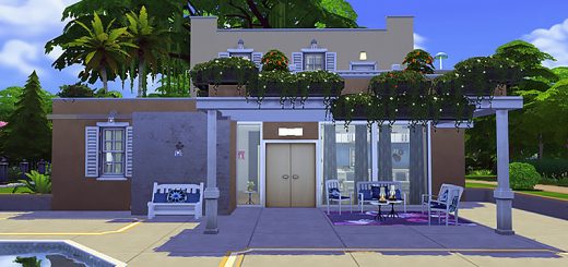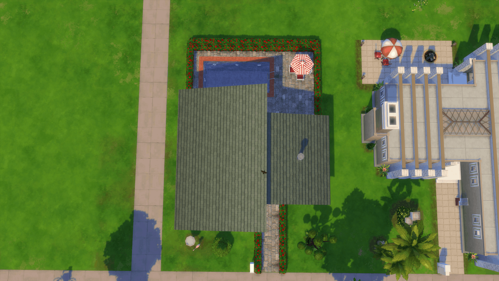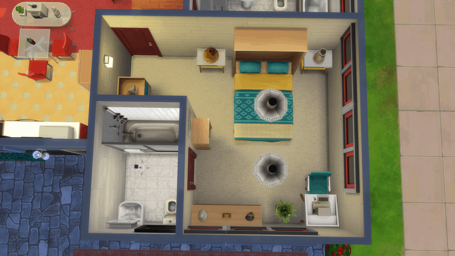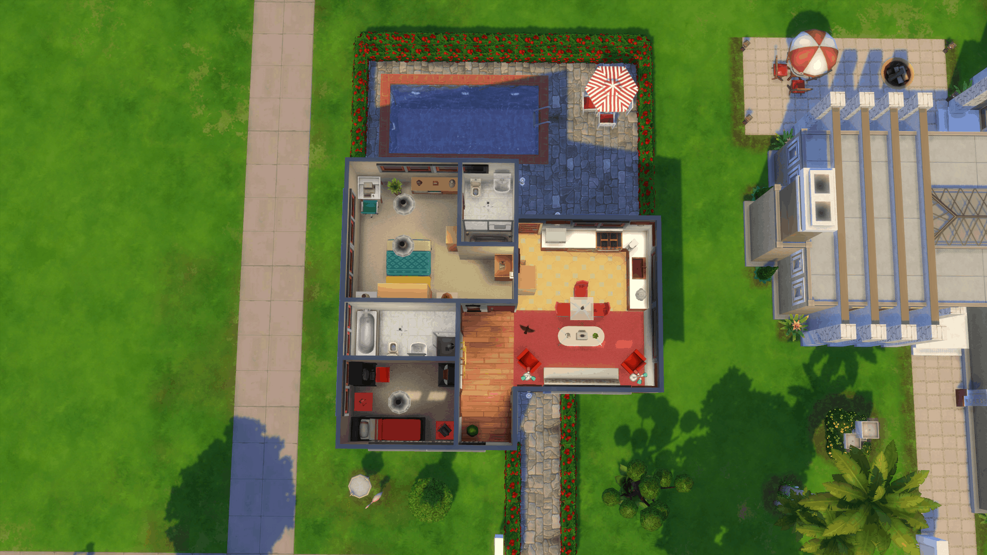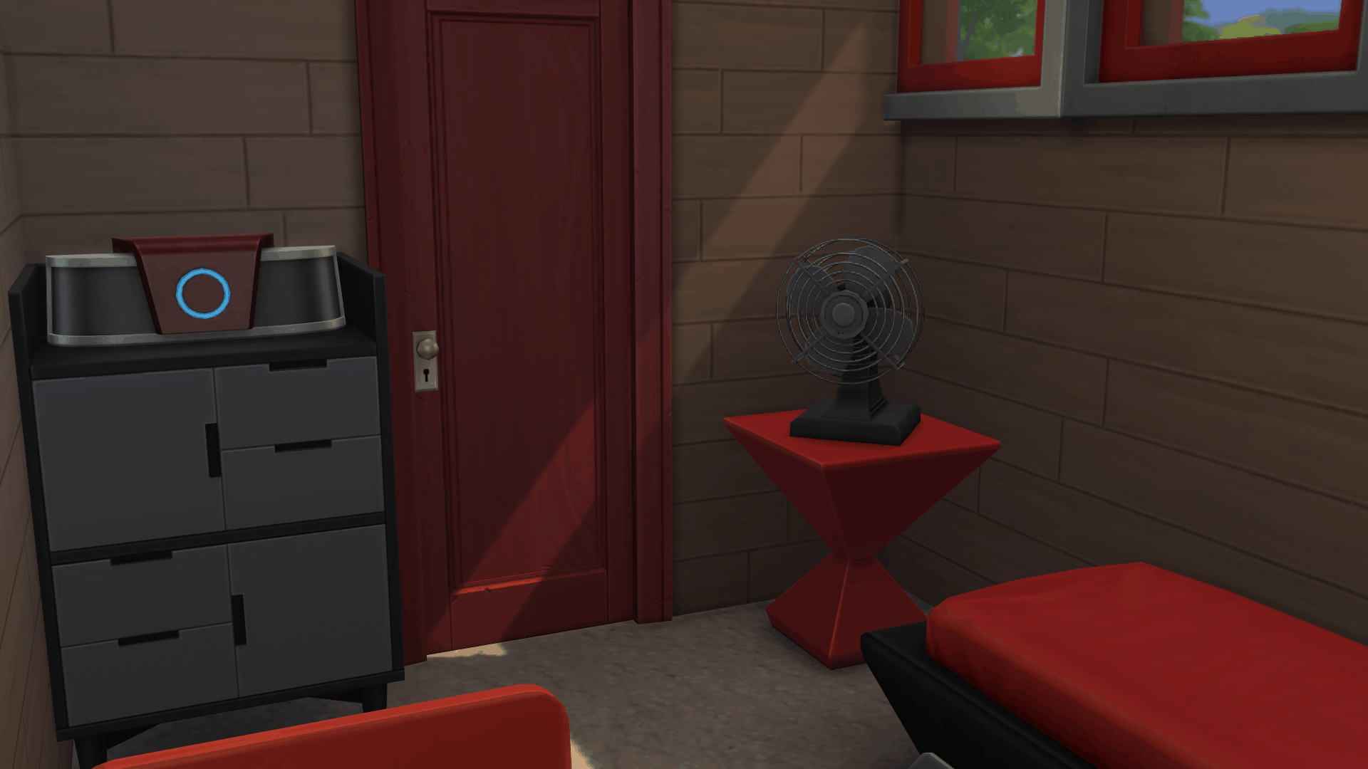 Hello fellow Simmers! I’m back again with another mid-century modern house design from my fictional Atomic Acres neighborhood. I really loved building this one in traditional style, and I like the roof lines I chose for the exterior look. I think it turned out to be very eye-catching. I chose mostly reds, greens, and yellows for the classic and iconic Atomic and Space Age appeal. This is a two bedroom small home or starter home. Perfect for starting a family. The smaller room done in red and black can be for children or teens (or a nursery if you change it around) and the larger bedroom has the Tiny Living themed objects, including a fold-out bed. There are two full bathrooms as well. It has a pool and a patio for the enclosed backyard. I hope you all enjoy it!