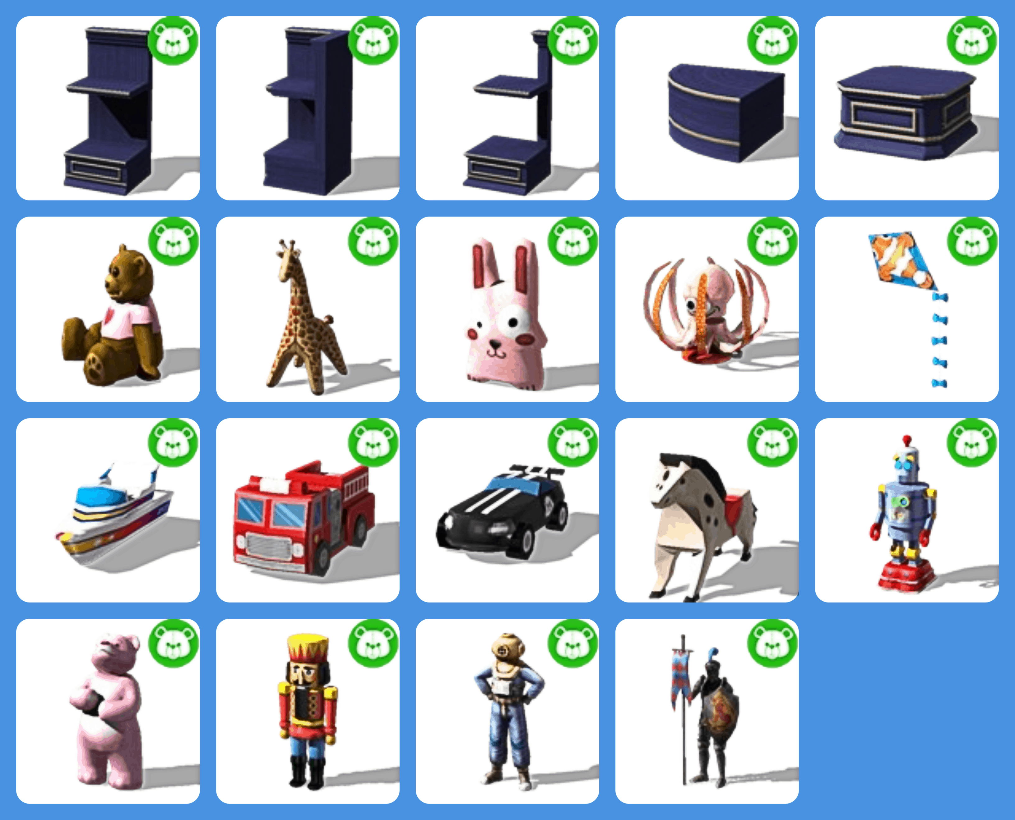Add this beautiful collection of vintage items and recolors to your game and build the toy store of your dreams!