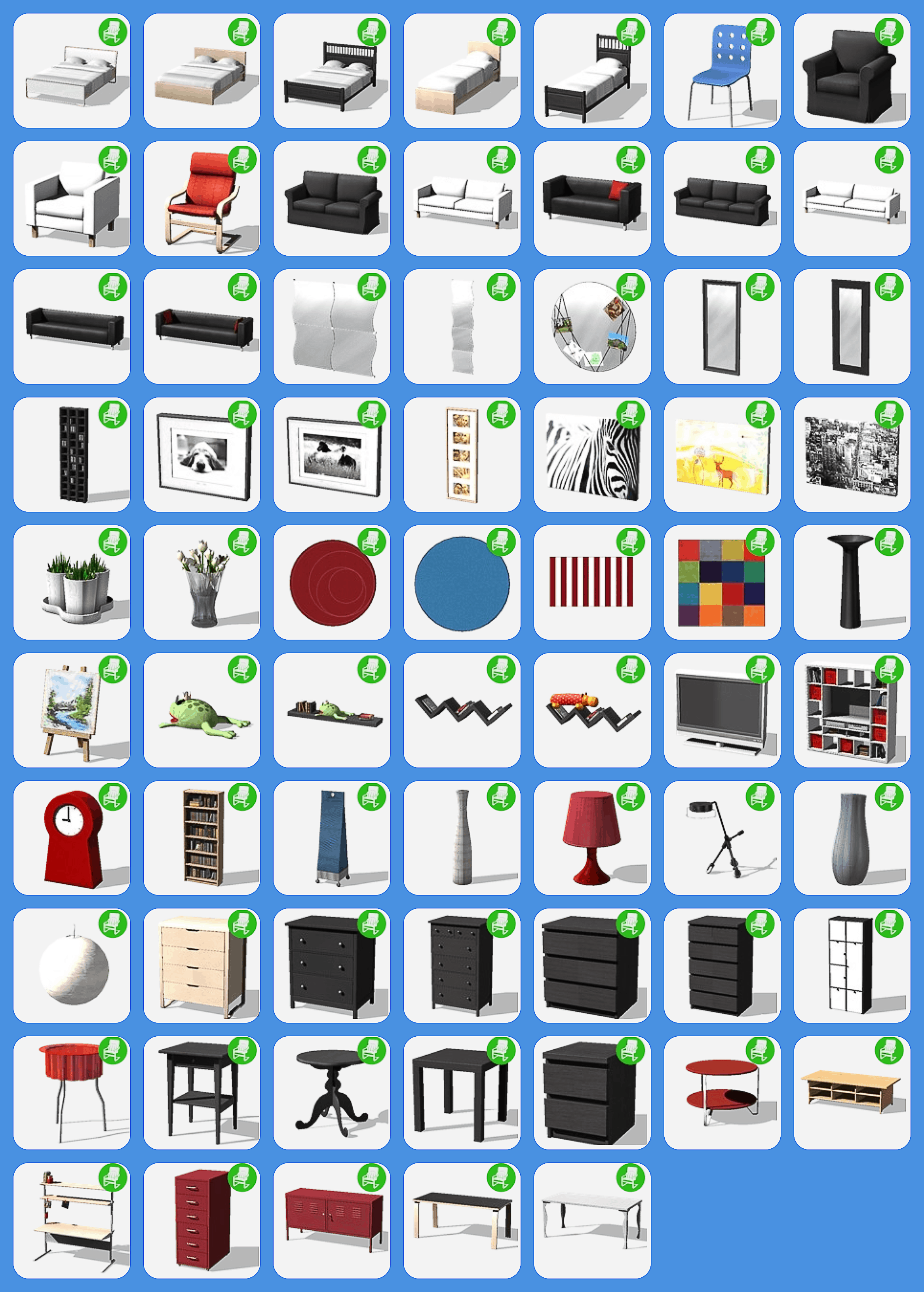 This is a conversion of the entire “Sims 2 Ikea Home Stuff” Pack, including 68 brand new items for your sims’ homes. Here is everything included in this pack,categorized by function.