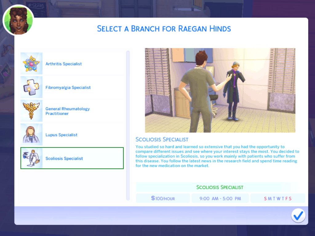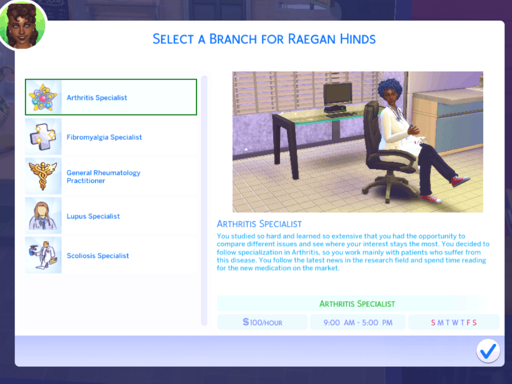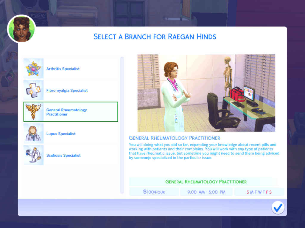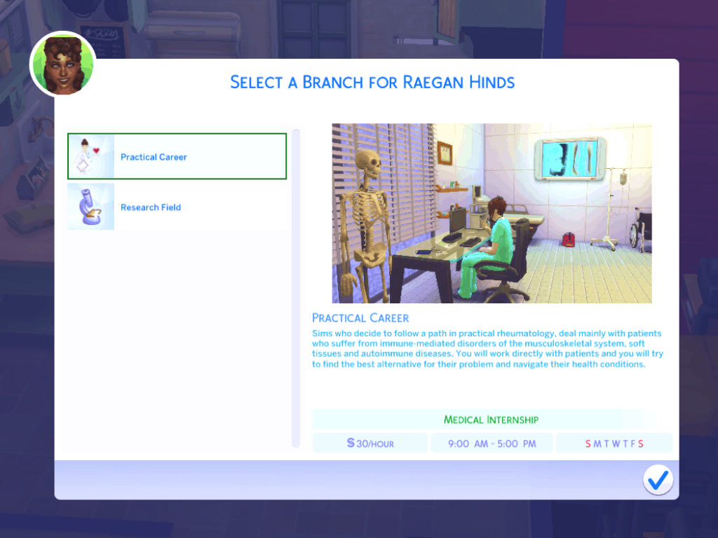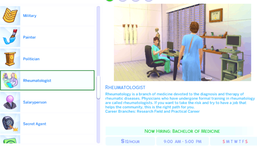 Afterward, your sim will need to choose between two career options. Whether they want to be a researcher and find a cure for rheumatic disorders, or a practitioner who helps individuals with chronic conditions.