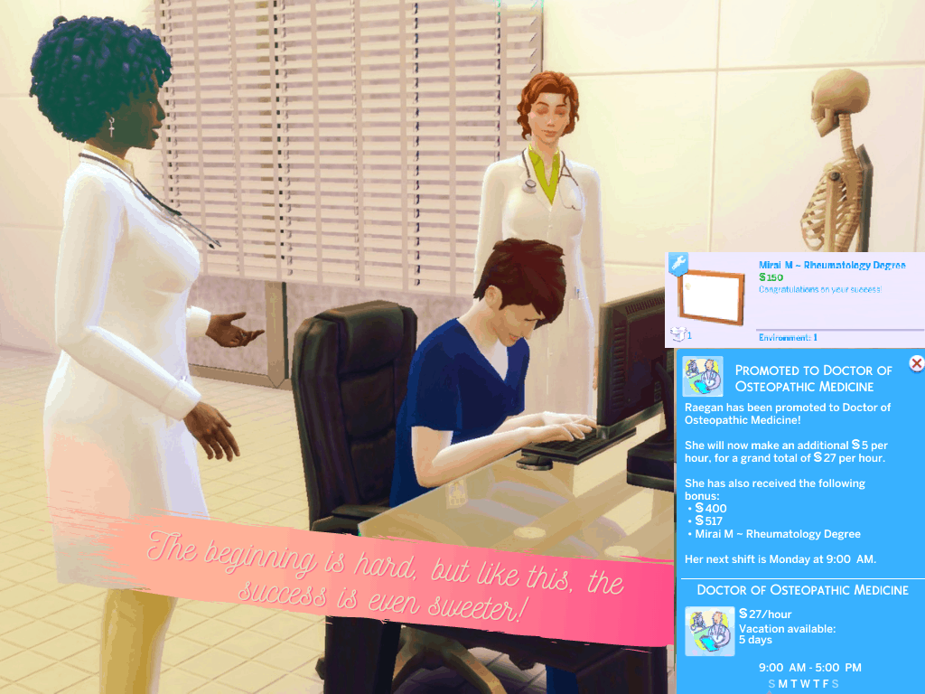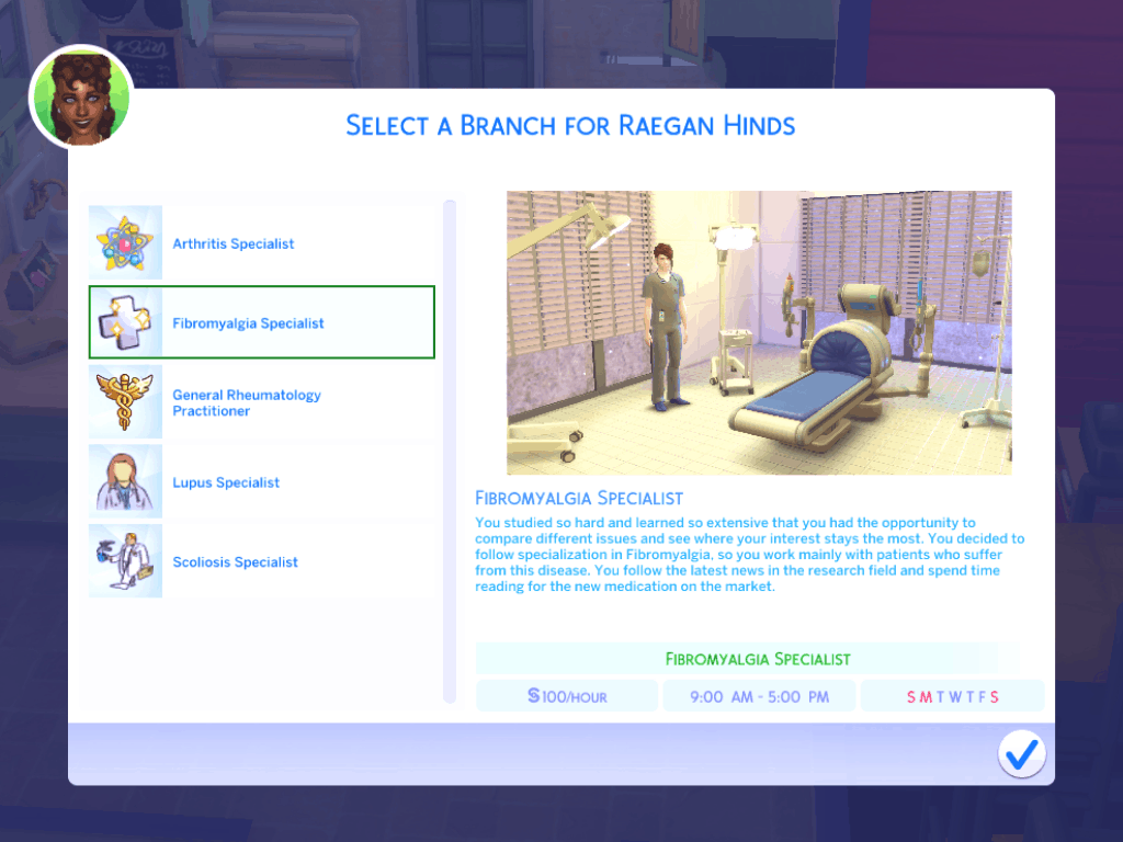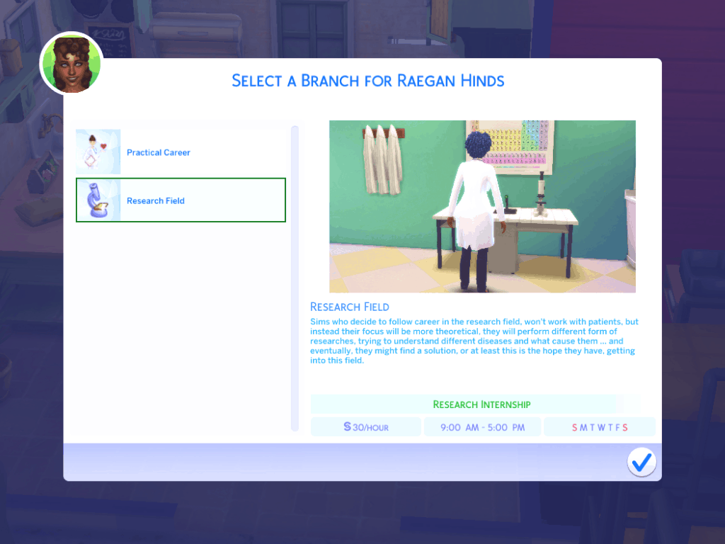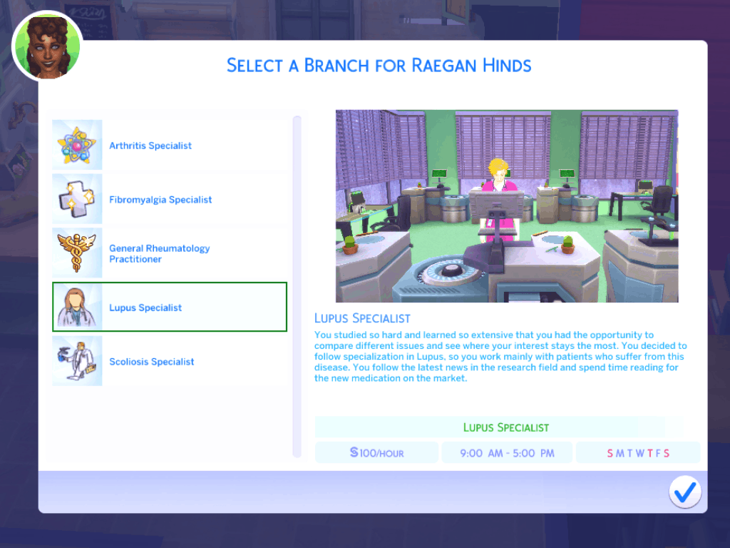 Afterward, your sim will need to choose between two career options. Whether they want to be a researcher and find a cure for rheumatic disorders, or a practitioner who helps individuals with chronic conditions.
