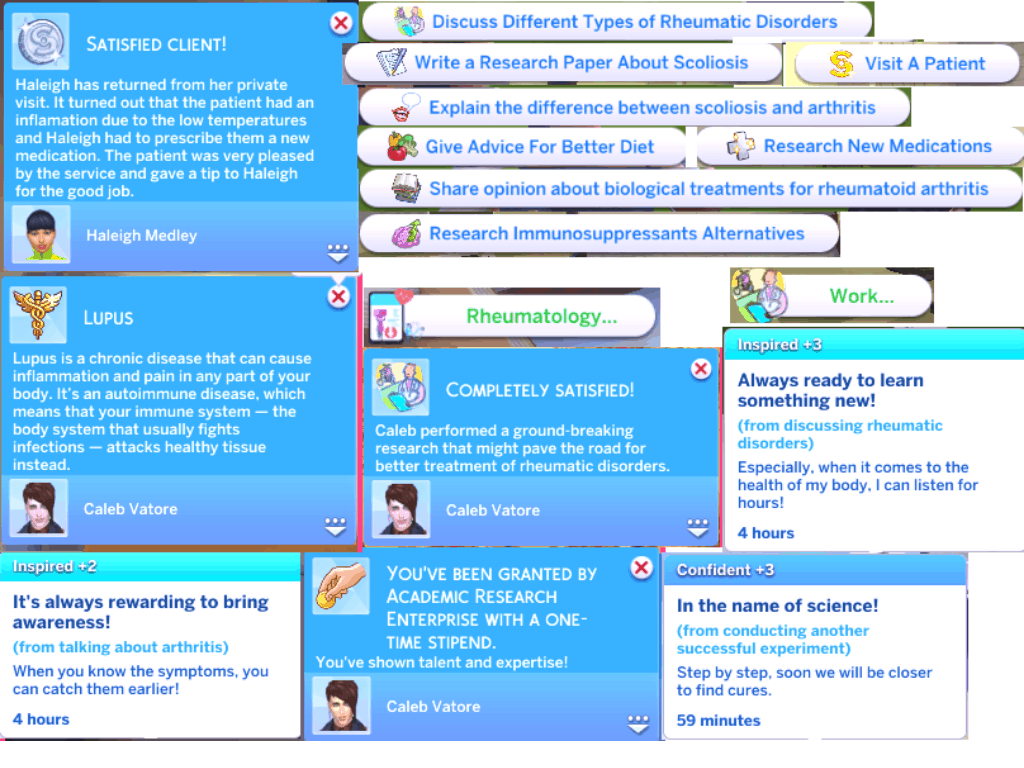 When you press on another sim, you will see a pie menu called “Work”, these are the interactions connected to your rheumatology job.