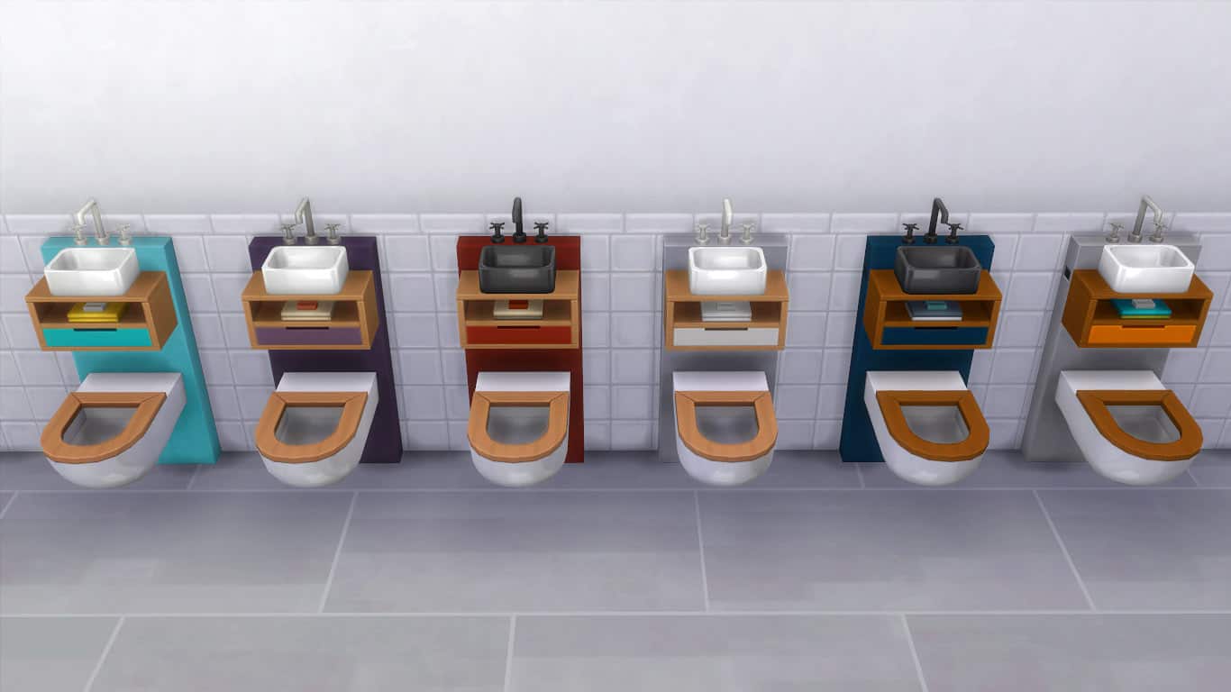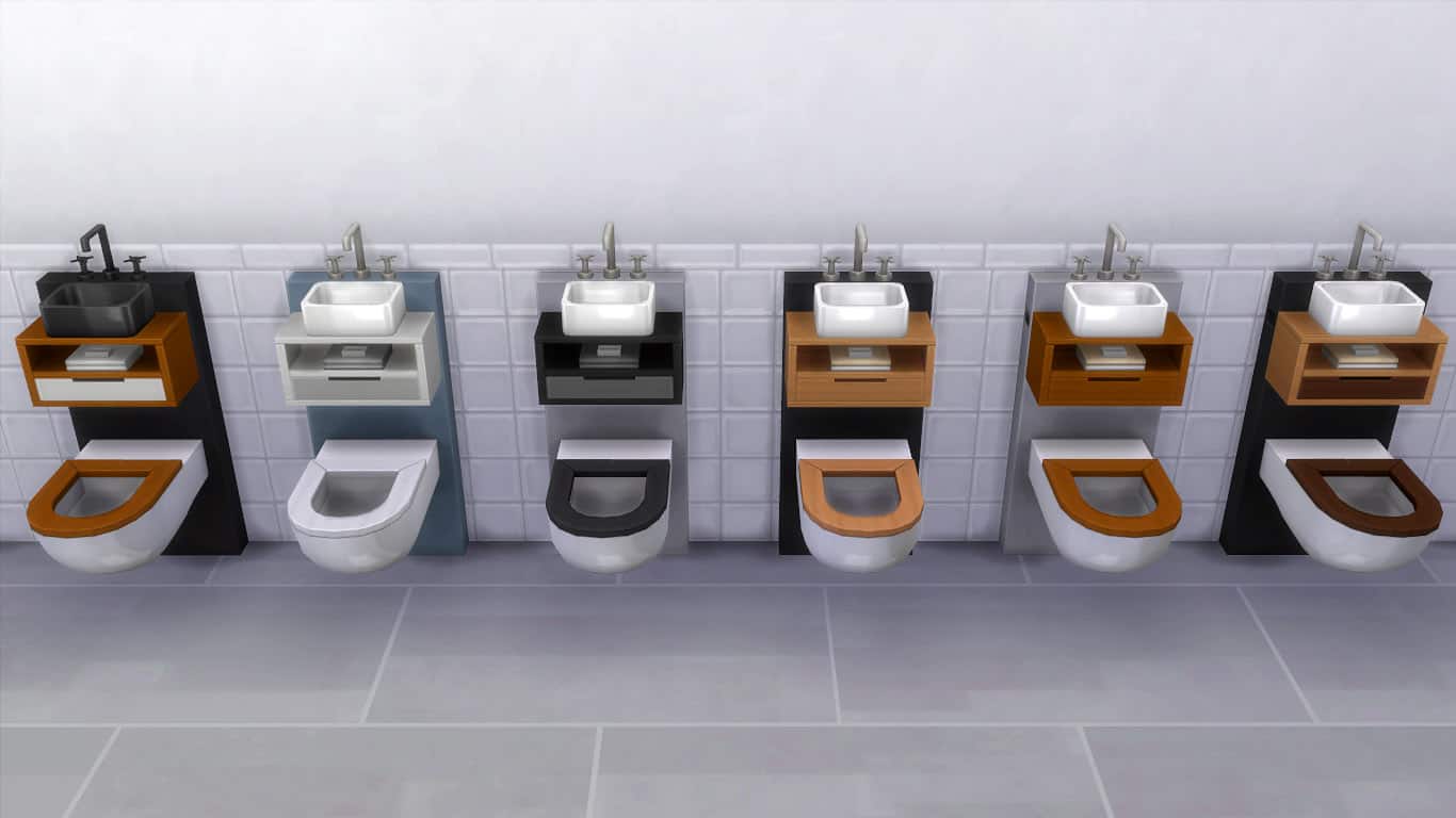– The sink textures reference the game to keep the files as small as possible, but I added matching recolors for the toilet so each sink has one or more colors to be paired with. I also moved the “flush button” to the side.
