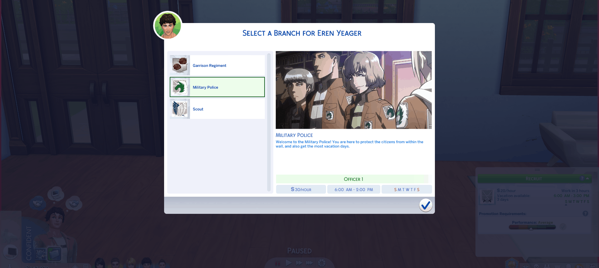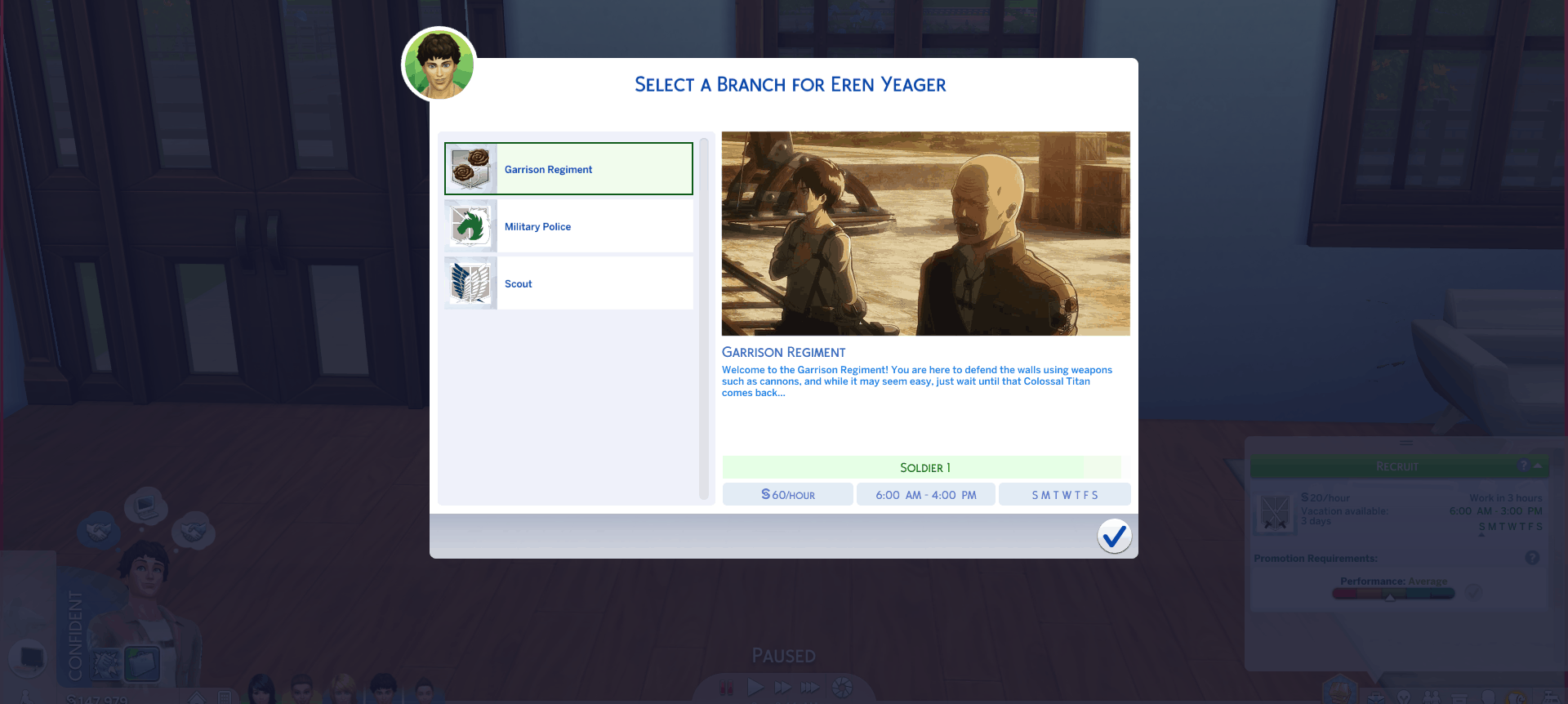 A mod that allows any young adult-elder Sim to join the military as shown in the Attack on Titan series (Scouts, Garrison Regiment, Military Police.).