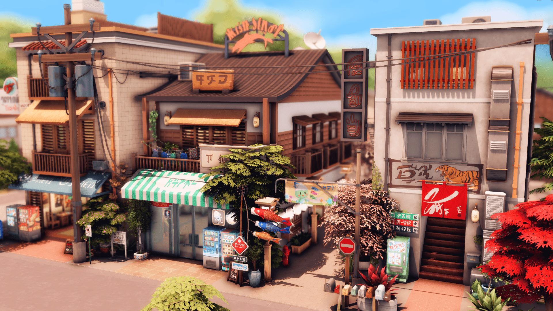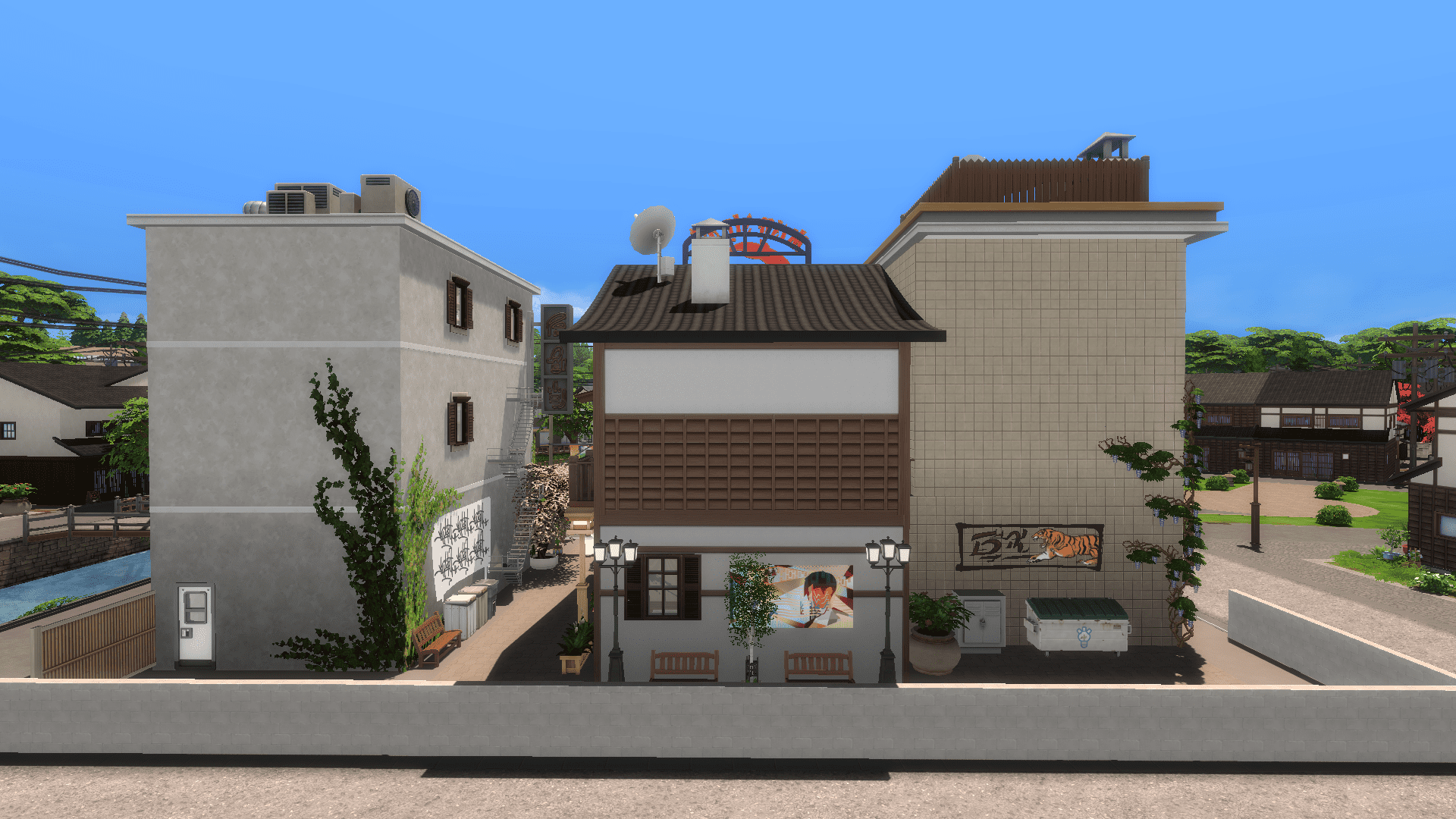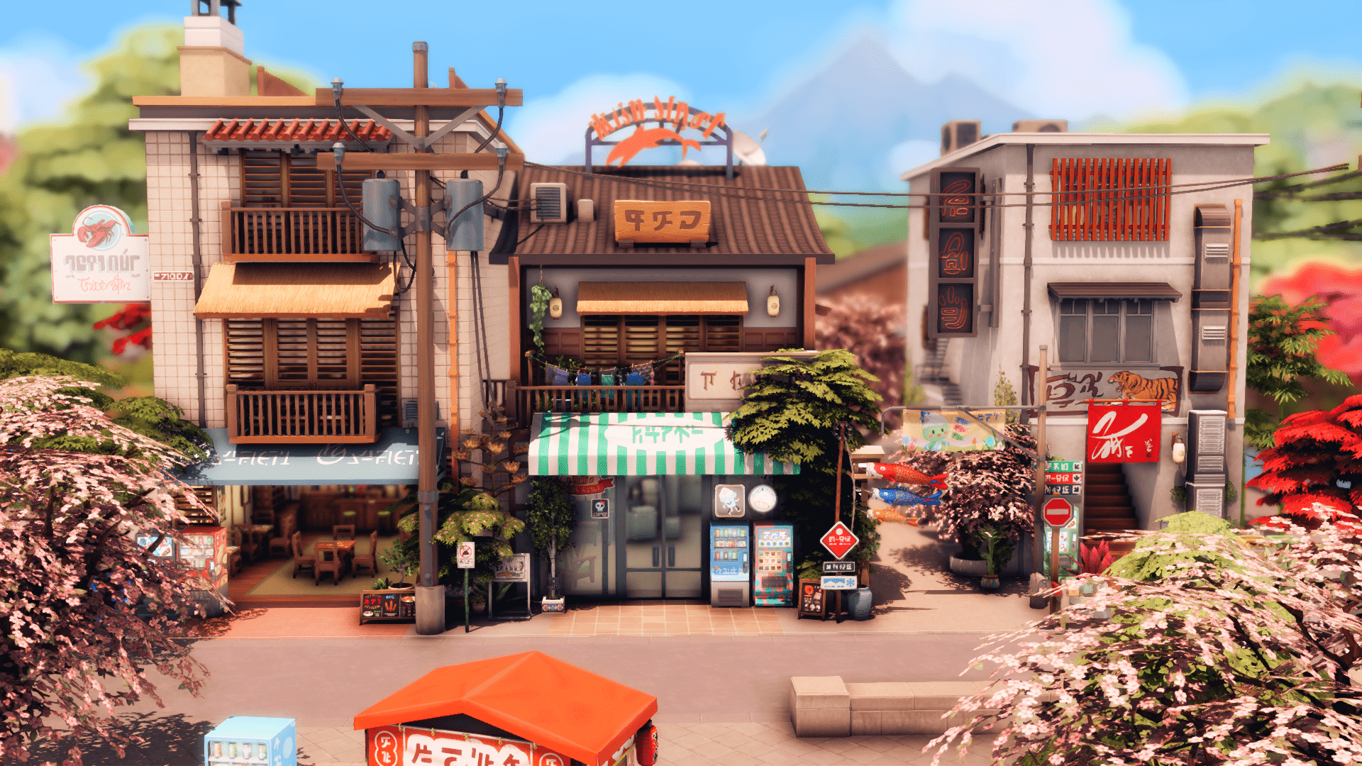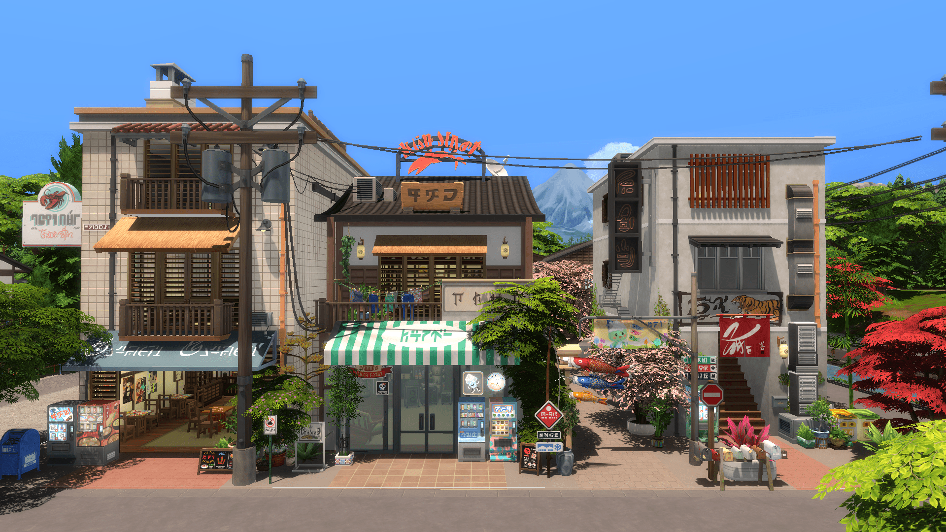 This Tokyo street was made to bring more color and life to your Mt. Komorebi! This lot contains a bar, a karaoke and an apartment, it is set as “bar” lot type, but you can change to residential if you prefer.
