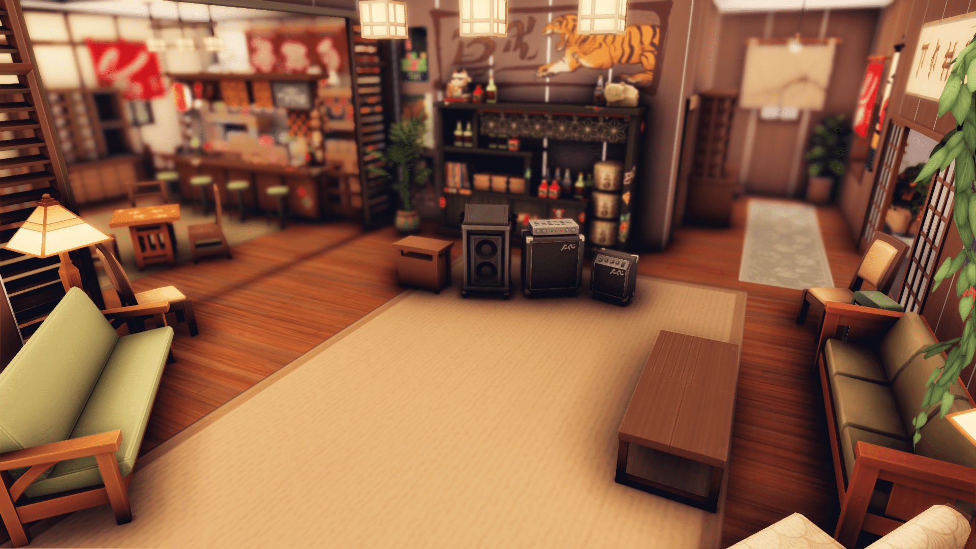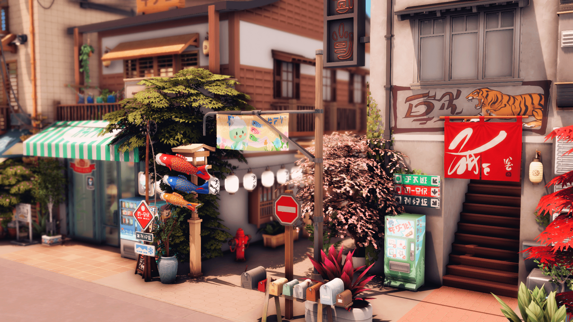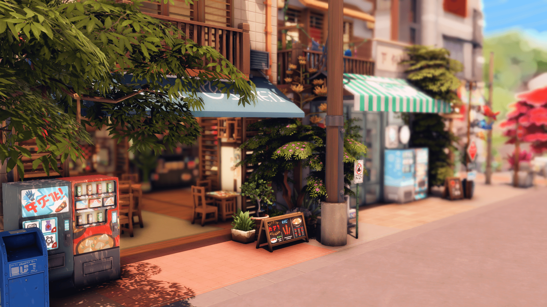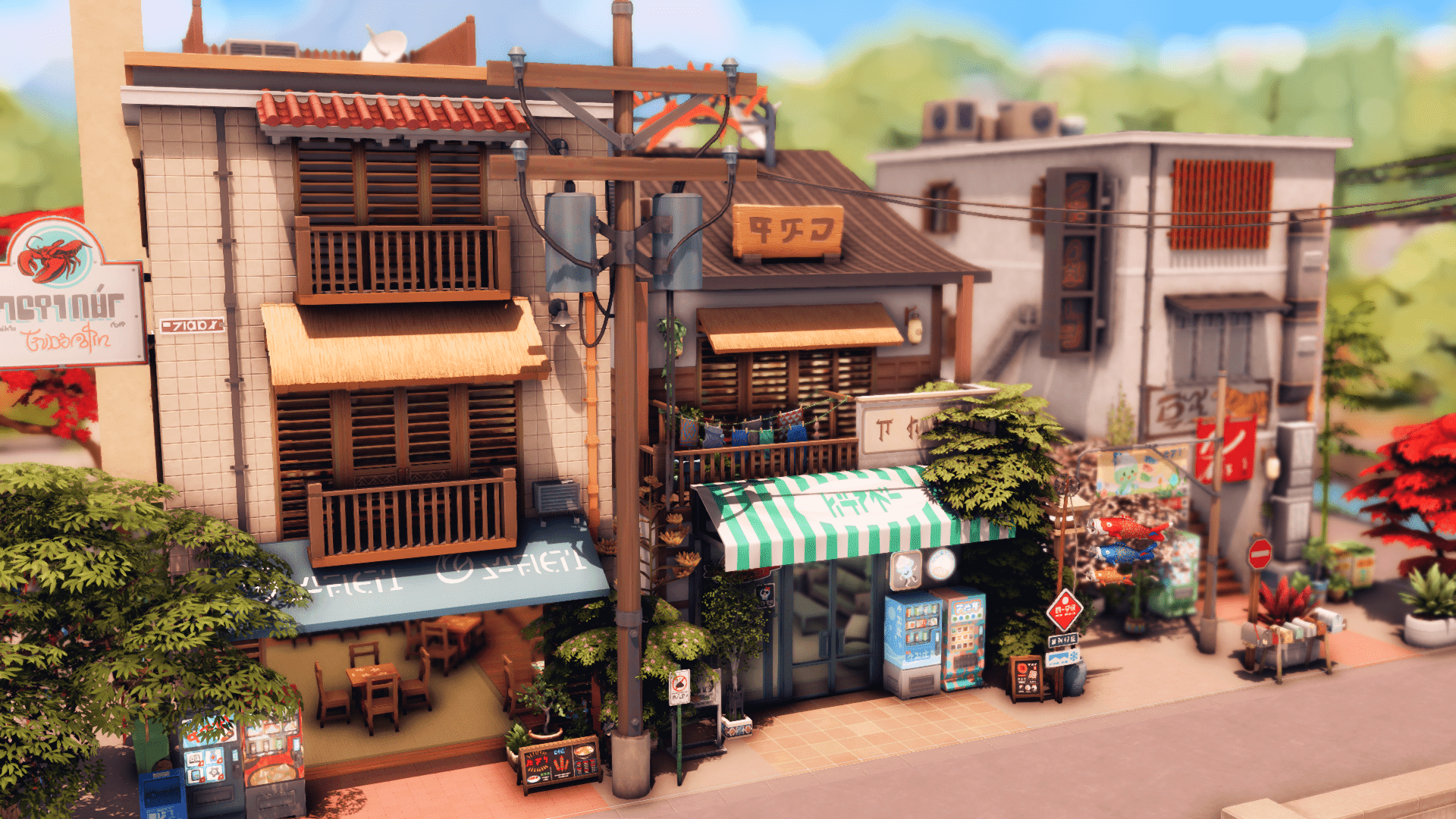 This Tokyo street was made to bring more color and life to your Mt. Komorebi! This lot contains a bar, a karaoke and an apartment, it is set as “bar” lot type, but you can change to residential if you prefer.