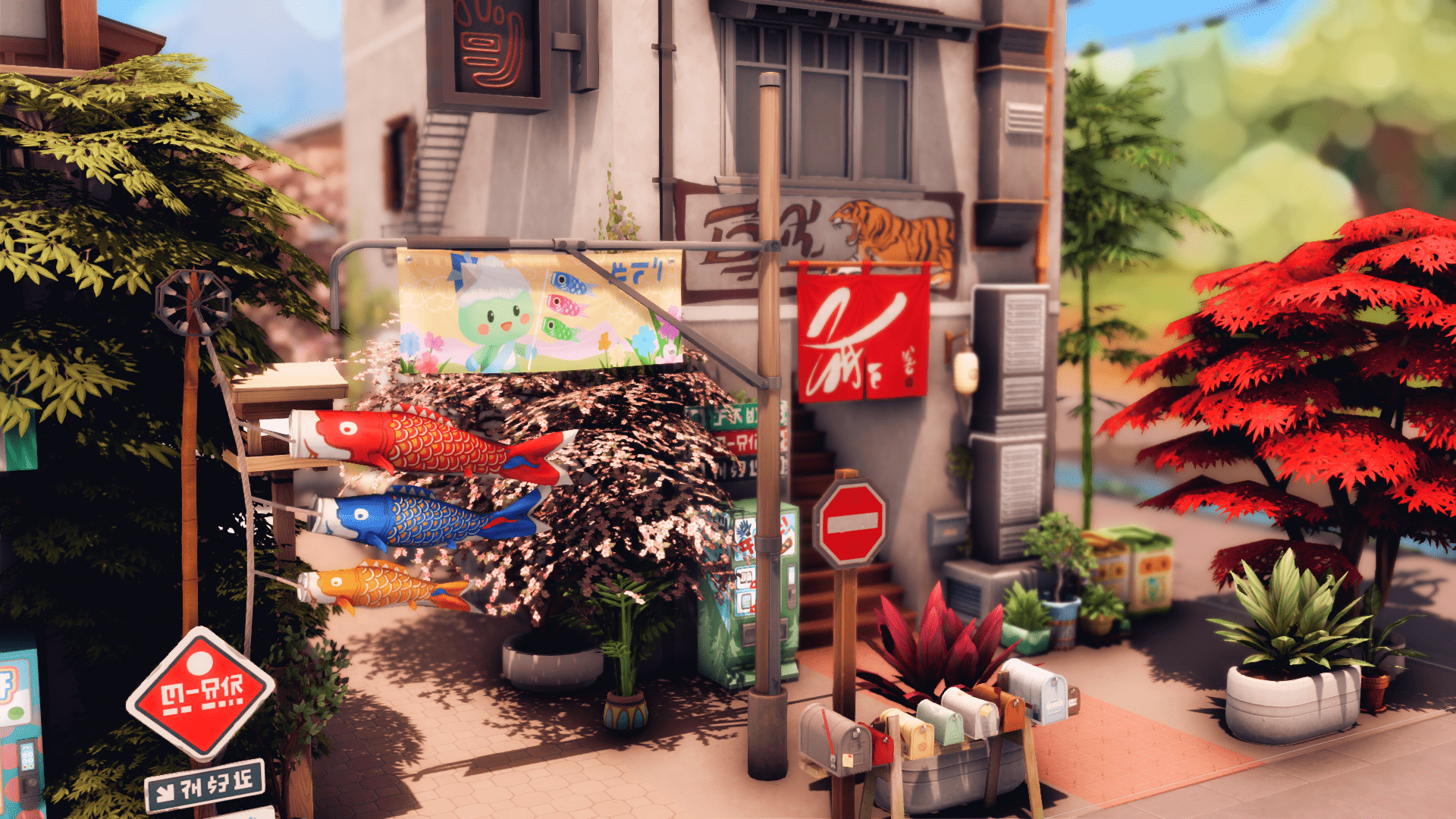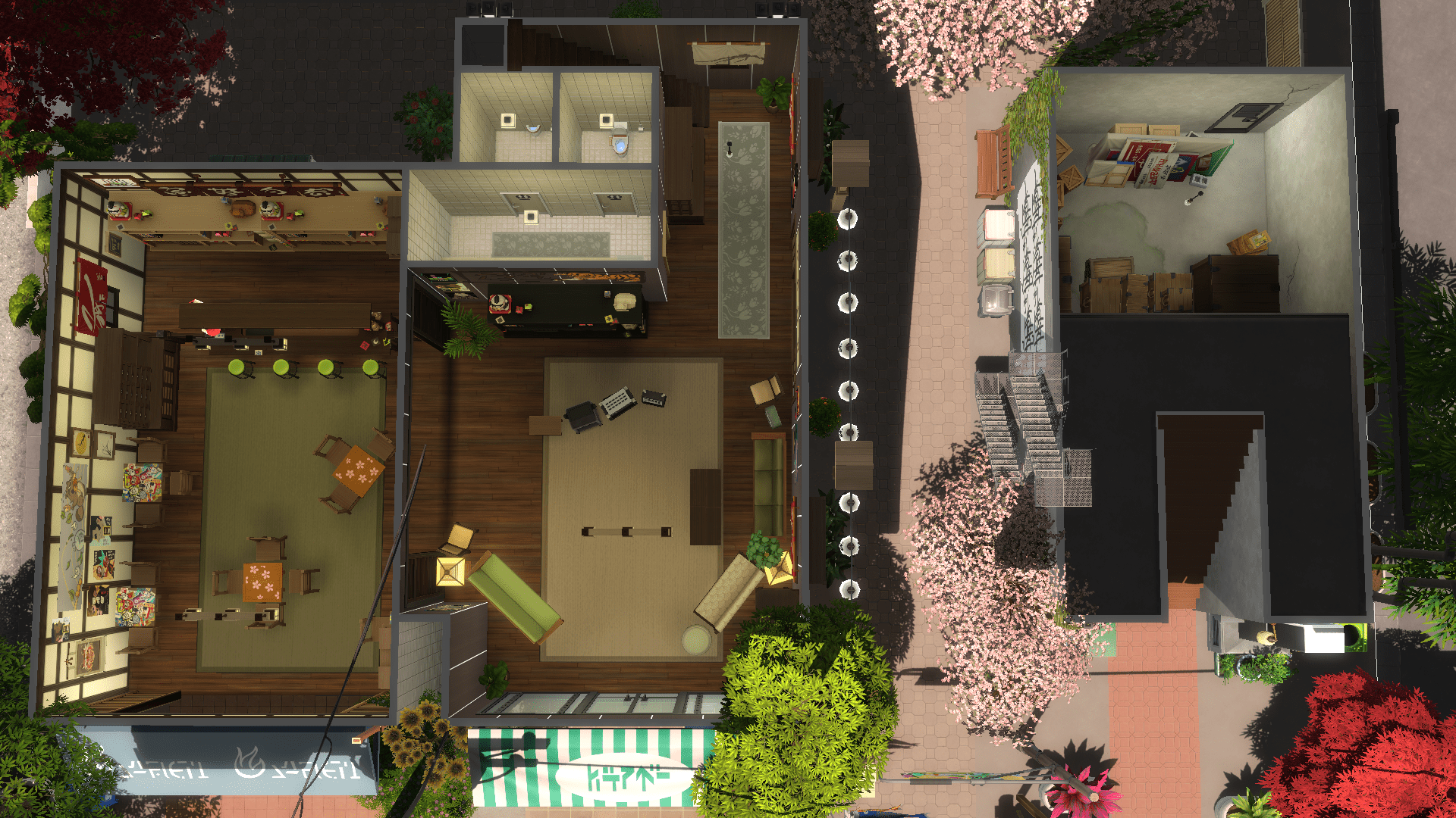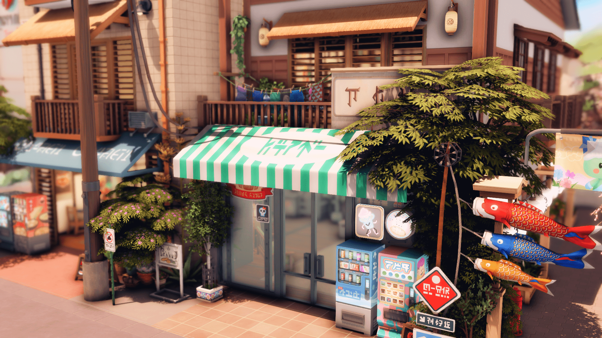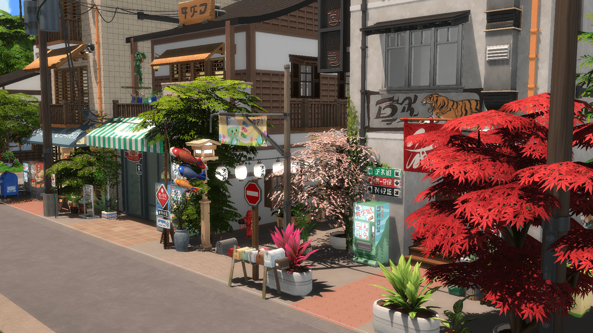 This Tokyo street was made to bring more color and life to your Mt. Komorebi! This lot contains a bar, a karaoke and an apartment, it is set as “bar” lot type, but you can change to residential if you prefer.