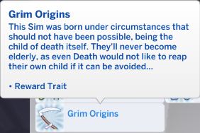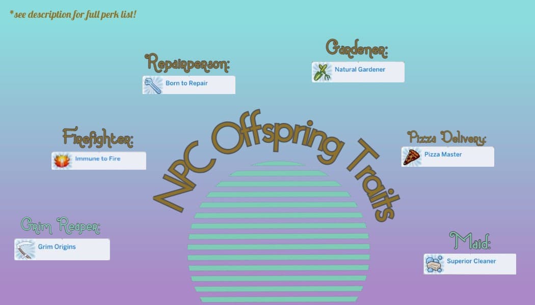 With this, a few select NPCs will now grant their offspring a bonus trait! Note that the NPC traits are no longer valid if you add them to household (unless you use some NPC manager to prevent that), so if you want your children to get the respective trait from their NPC parent, you have to make sure the parent has the relevant NPC trait (IsGrimReaper, IsGardener, etc.). That tends to be relatively easy to check by the red letters from their situation job above their name, though you could also use something like MC CAS to check their hidden traits.