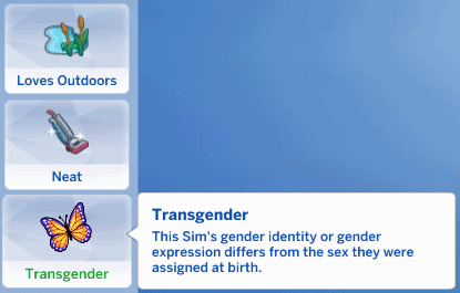 – Create a Sim and select the Transgender trait, found in the Lifestyle category. It is not recommended you physically customize the Sim at this time, as restricted access/access to the sliders requires the trait to be recognized in-game first. If you already have an existing Sim and are adding the trait to them, they will still need to follow the next steps