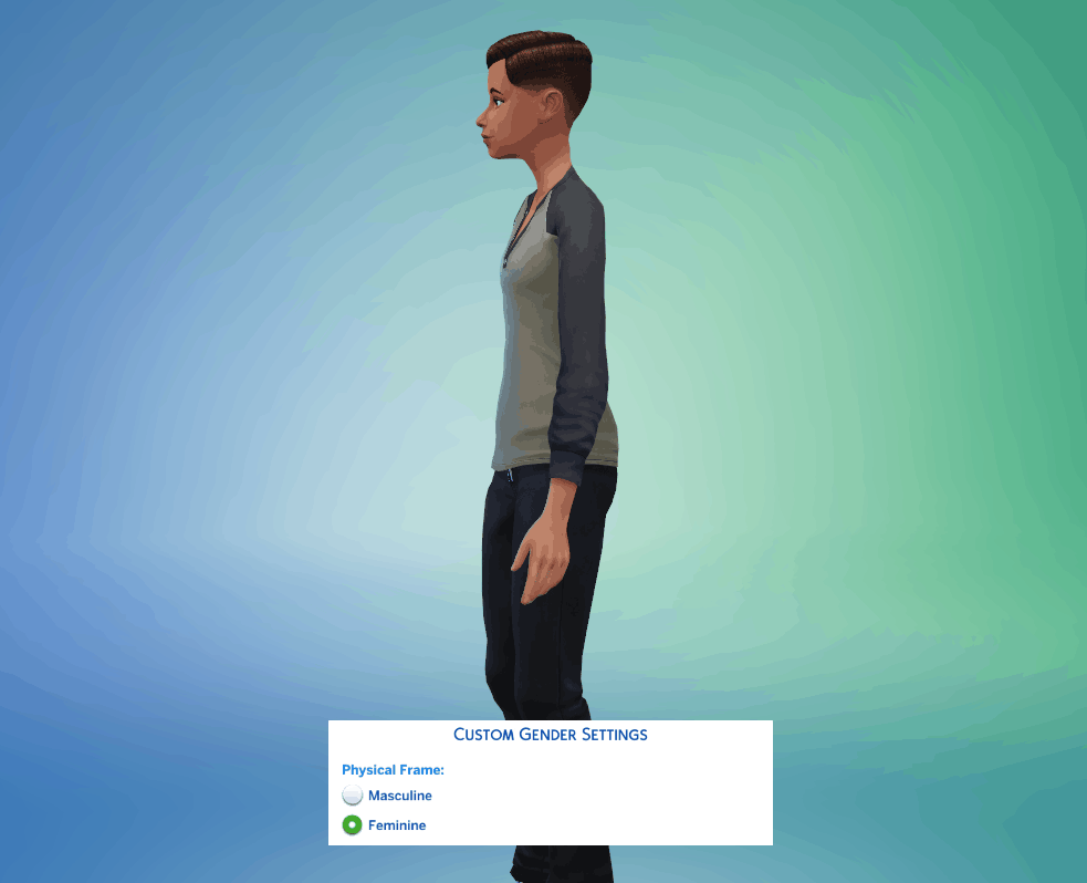 Sims who were assigned female now no longer have access to the breast slider, regardless of the masculine or feminine frame. Sims who were assigned male now do have access to the breast slider, regardless of the masculine or feminine frame.