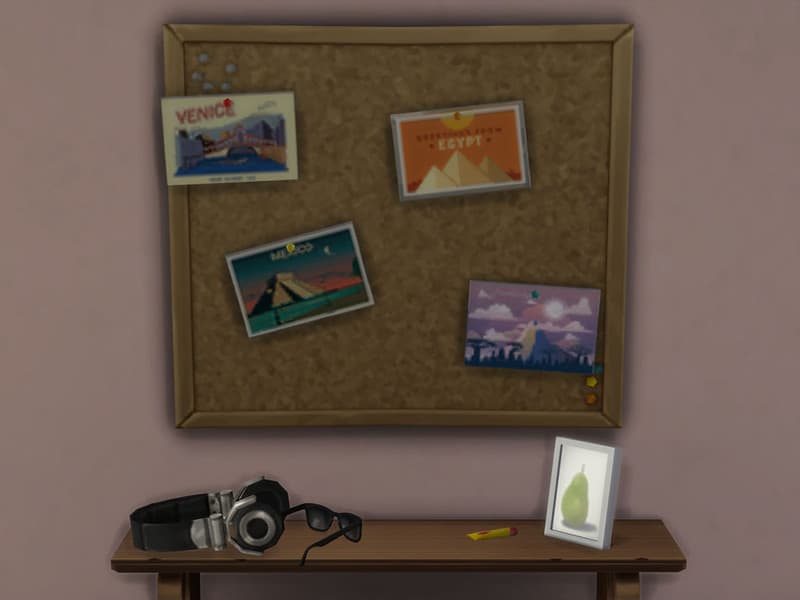 Postcards from different locations for your sim to display on their cork board.