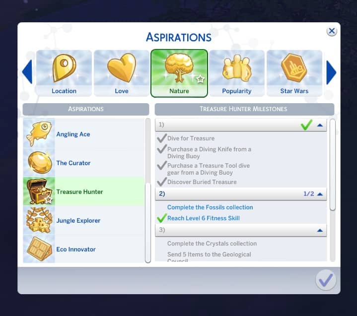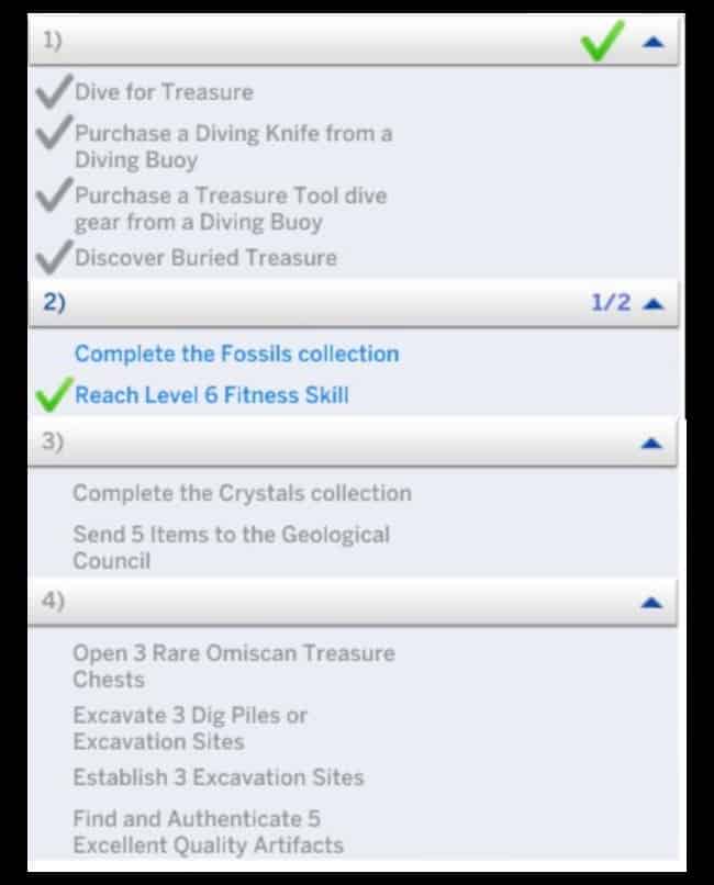 This is a very involved aspiration for your sims. The first level will lull you into a false sense of simplicity, and then you get slammed with completing two collections and multiple excavations. If you’re looking for something quick and easy, this isn’t for you!