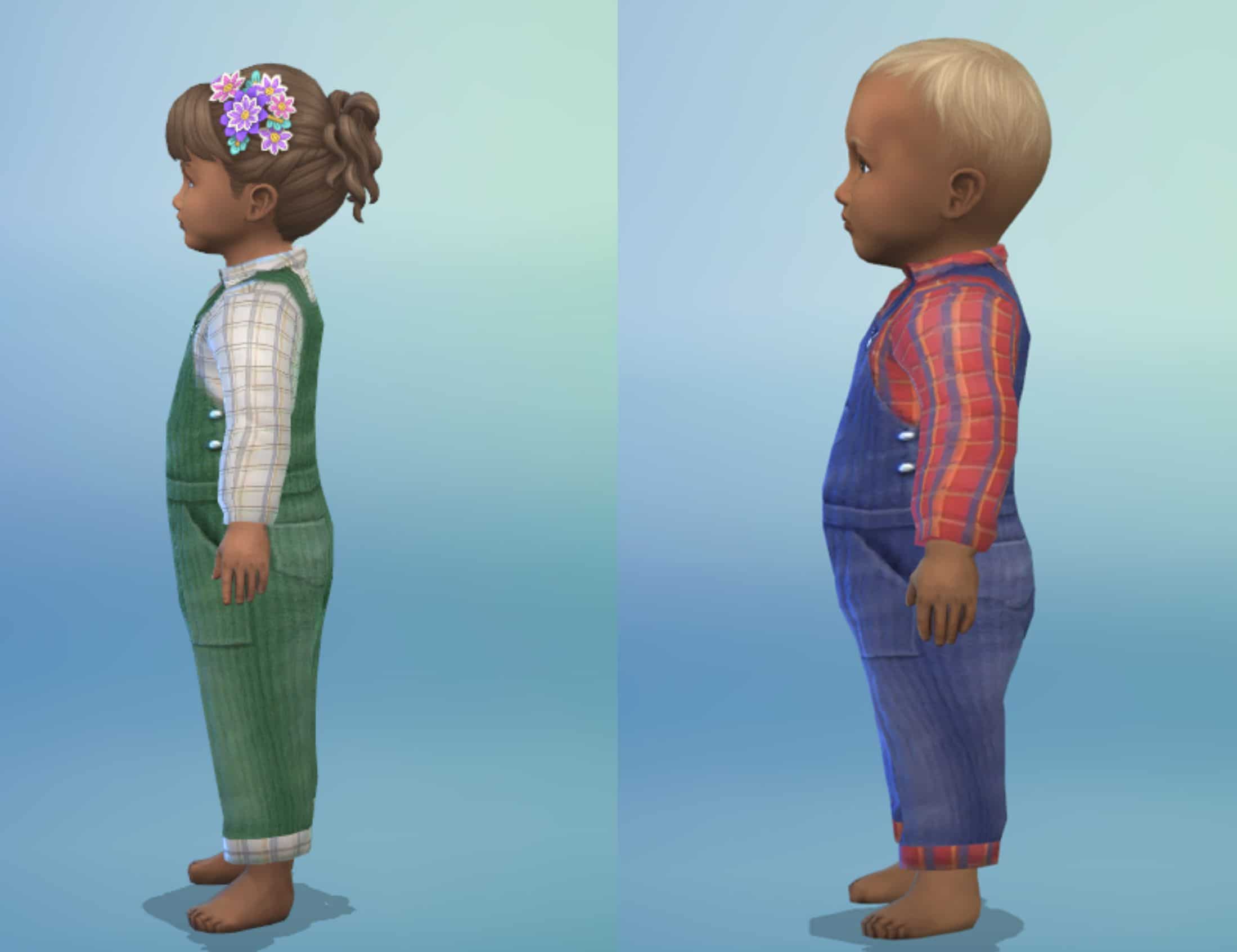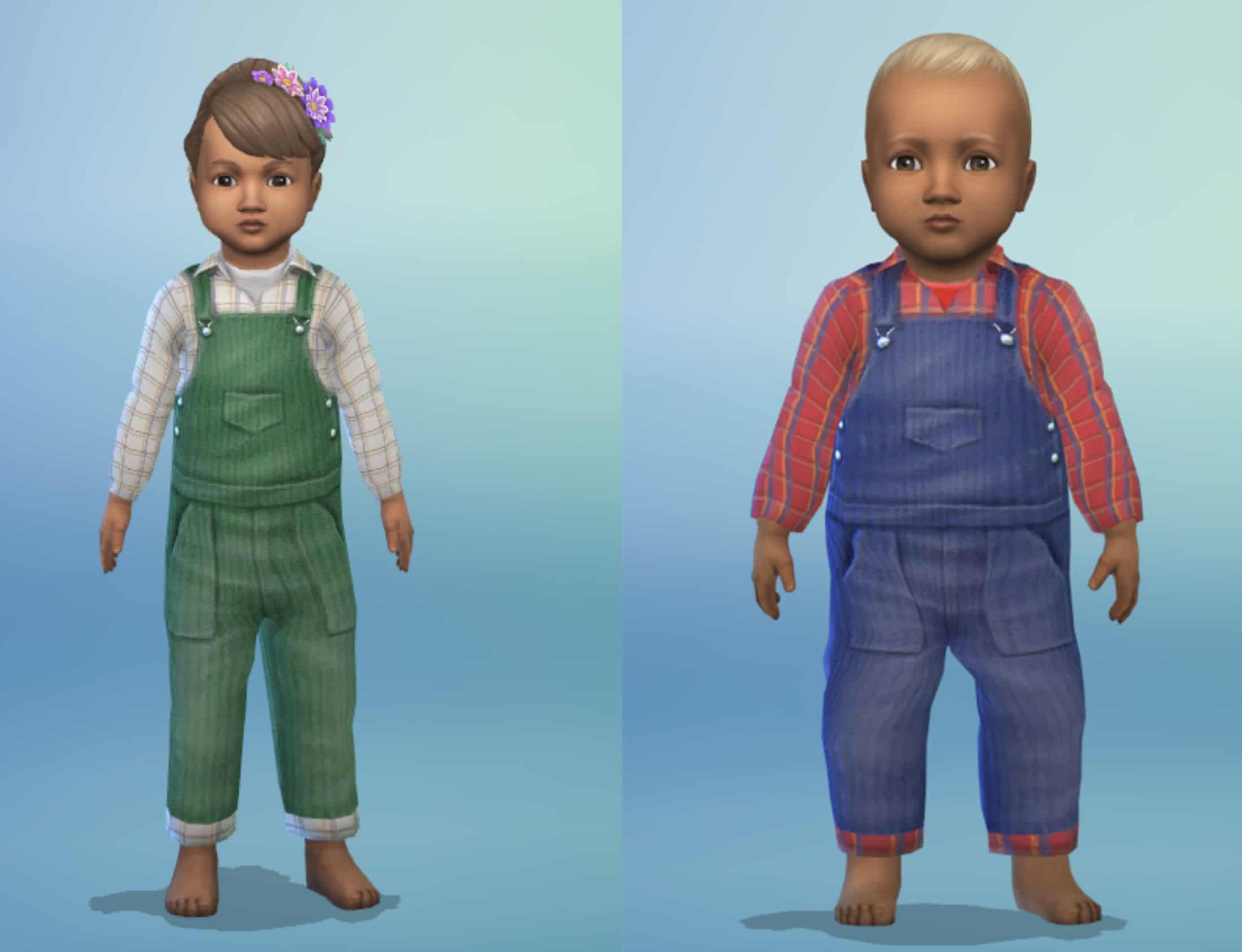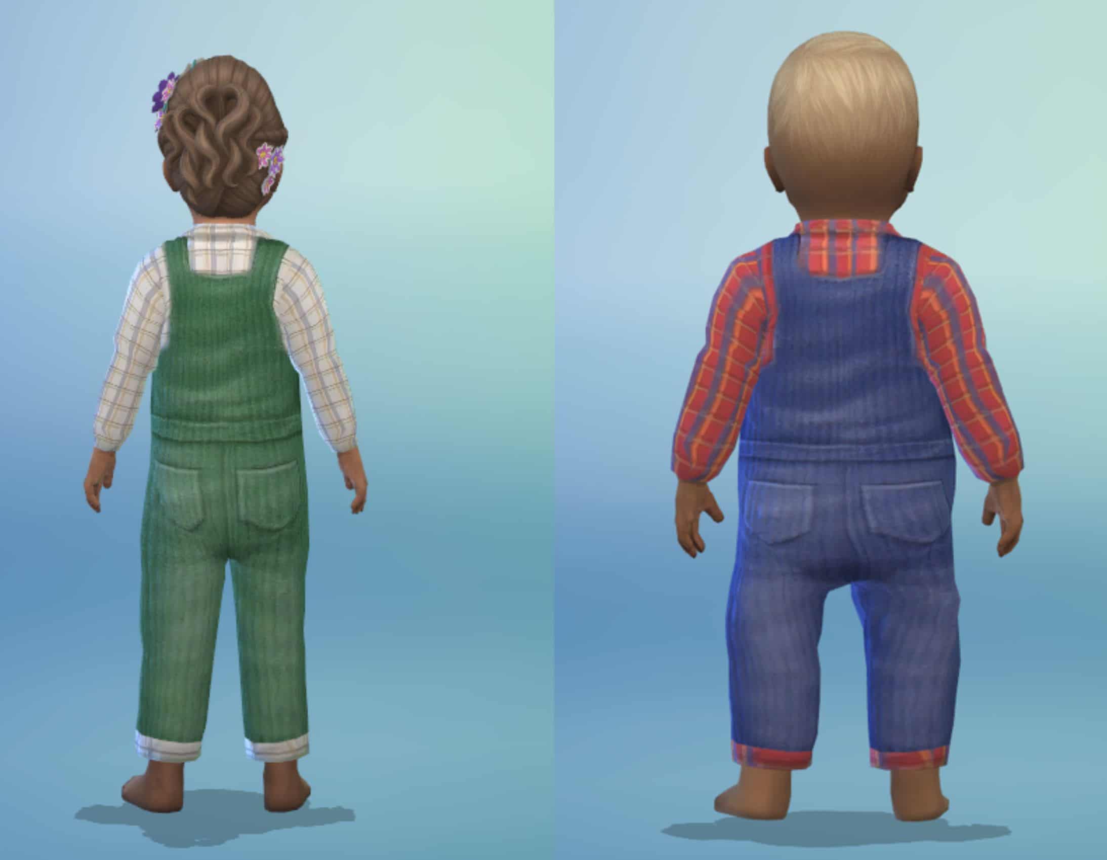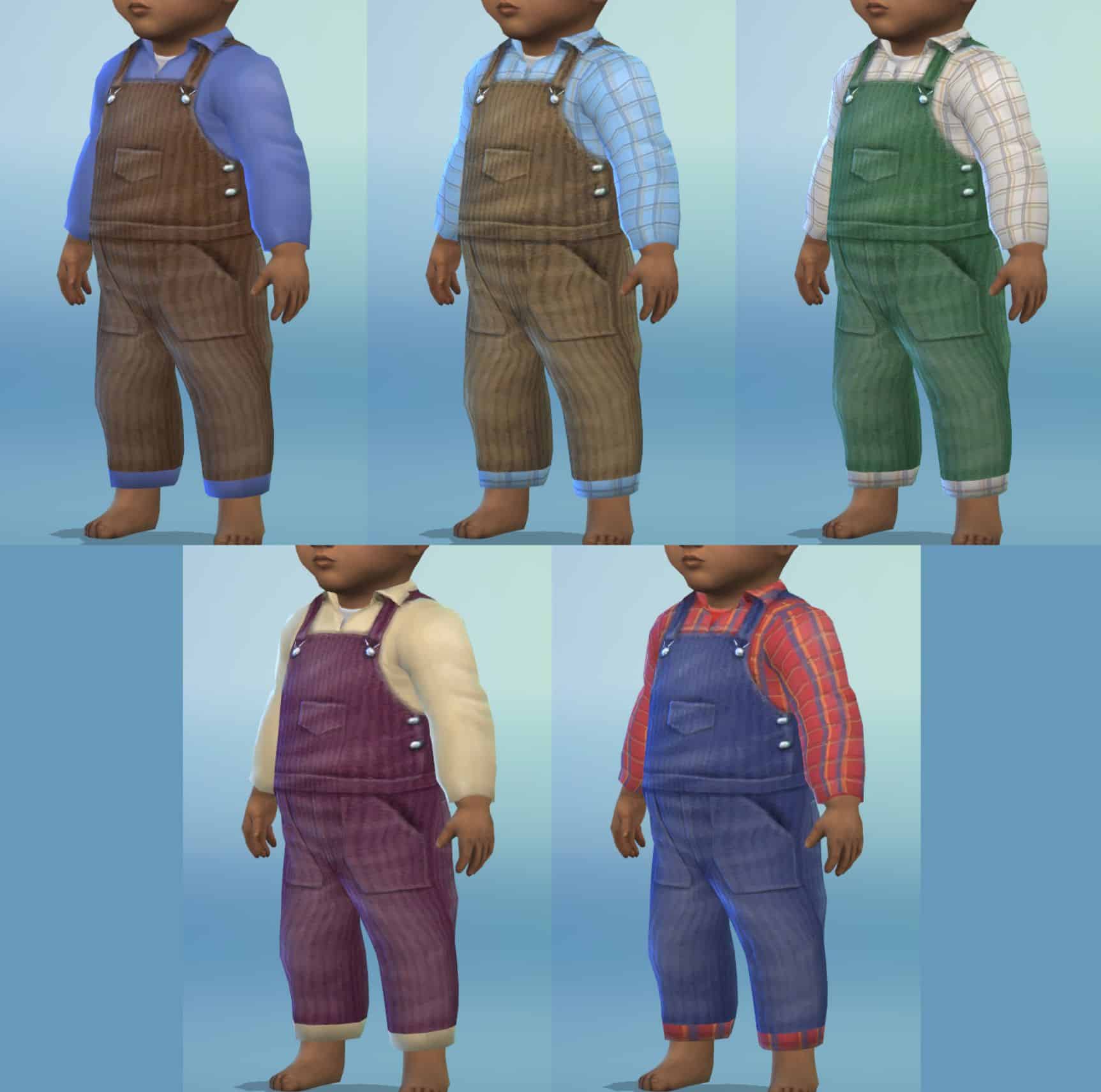 Boy, there really is no good way to get an in-world pic of infant CC, is there? Recently rebump-mapped, this infant and toddler conversion of the Sims 2 basic toddler onesie is great for your smallest of country bumpkins. For everyday and cold weather, and coming in the original five colors, your little darlings will be ready for all the mud-splattering, puddle-walking, yeehaw-dancing time they can handle before naptime.