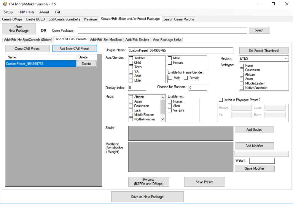 This tool makes custom TS4 morphs from base and morphed meshes and packages them in CAS sliders and presets.