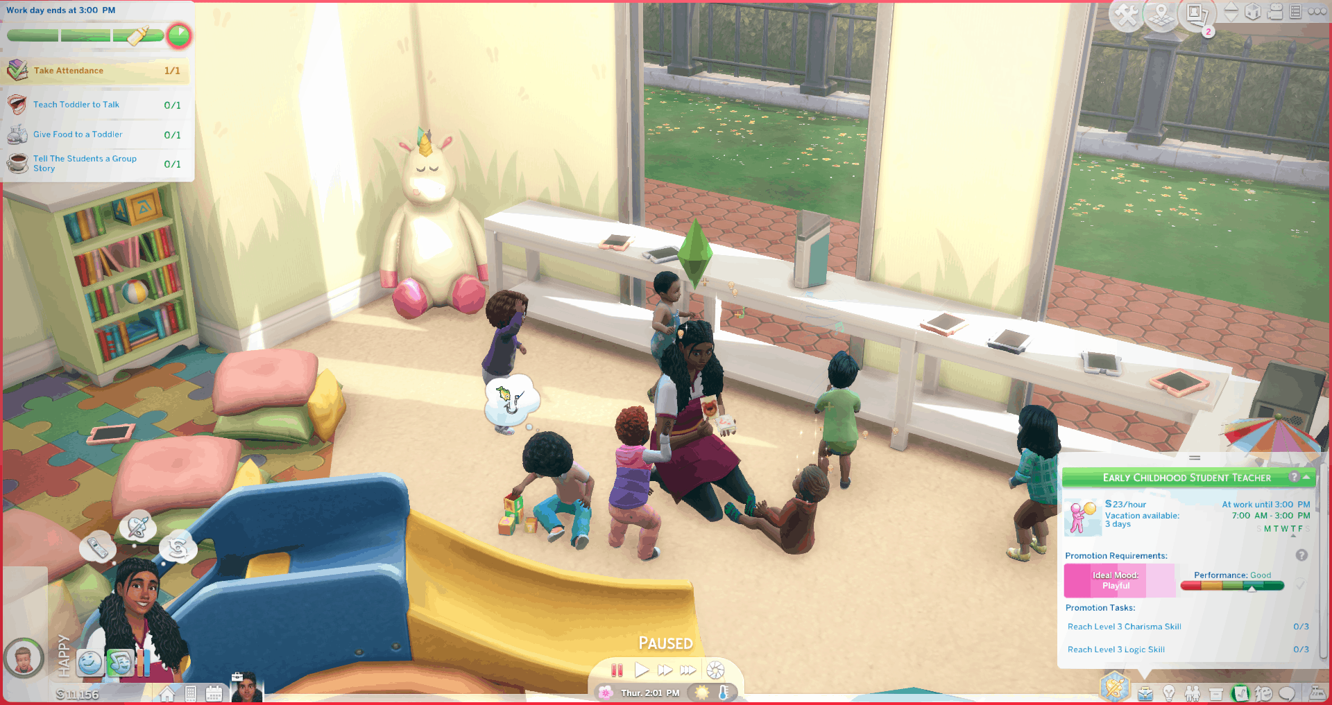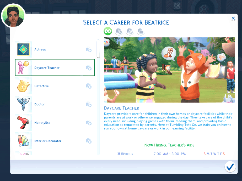 The Daycare Teacher career works like any other Get-To-Work career. When it’s time for your sim to go to work the game will give you the option to follow them to the daycare center venue and actually help your sim through the workday.