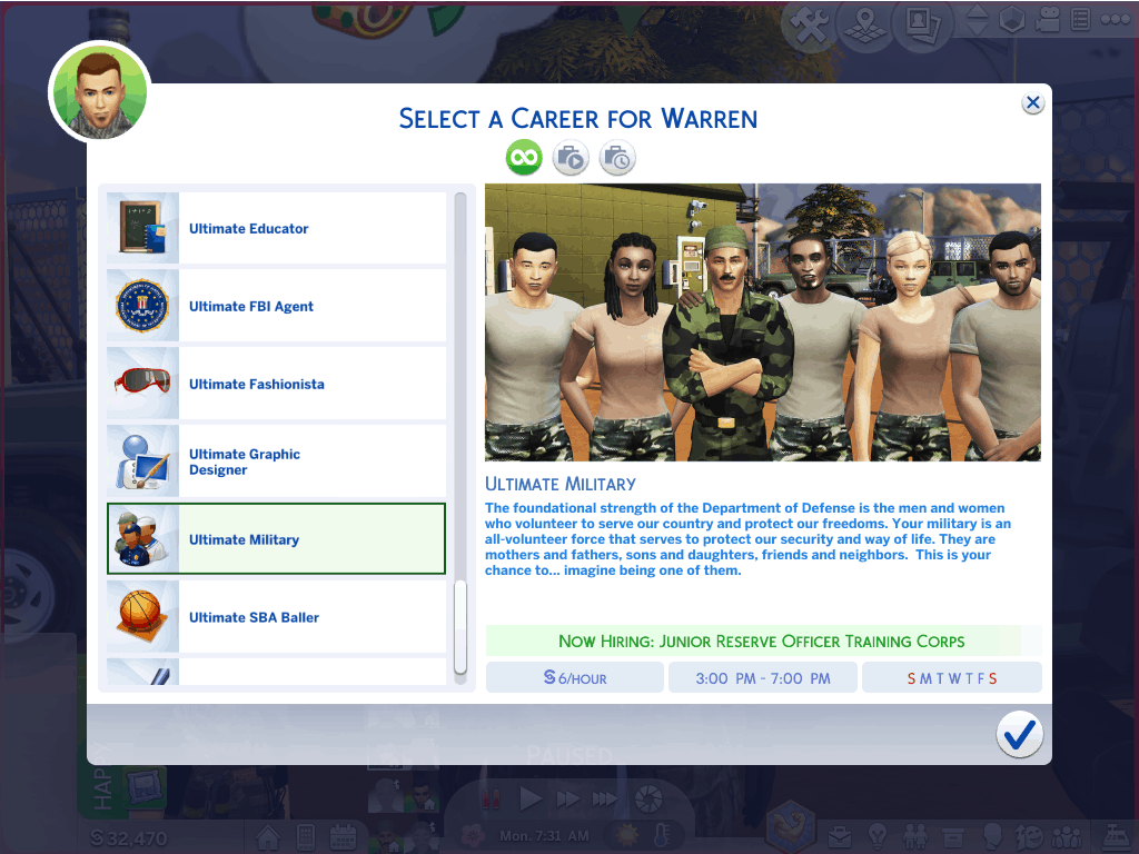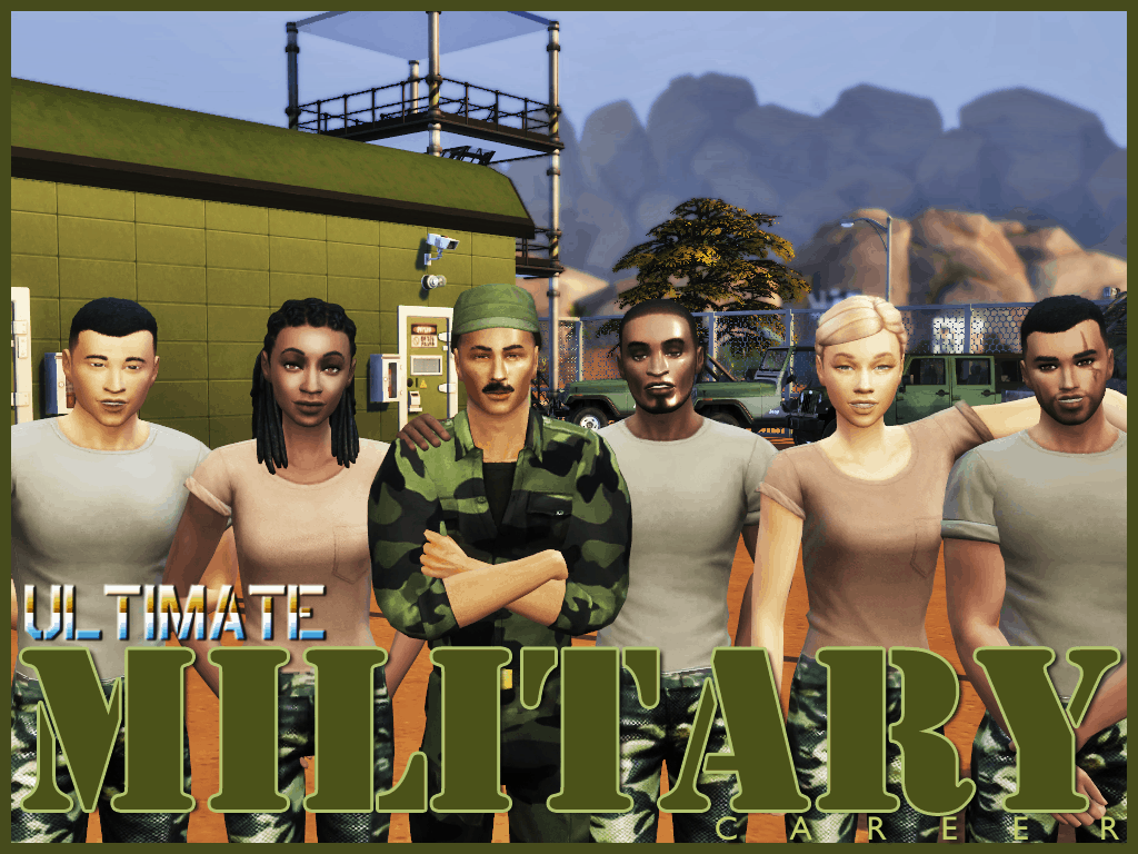 Ultimate Military has five paths (one for each branch of the military) and a minimum of 18 levels. It has almost all the actual ranks in each branch of the service. Senior enlisted ranks are skipped by a side trip to military college (which is actually possible). The career ranks and duties were thoroughly researched, but pay levels are mostly based on the Sims 3 military career. Like the actual military, all pay levels are the same for equivalent ranks in each branch.