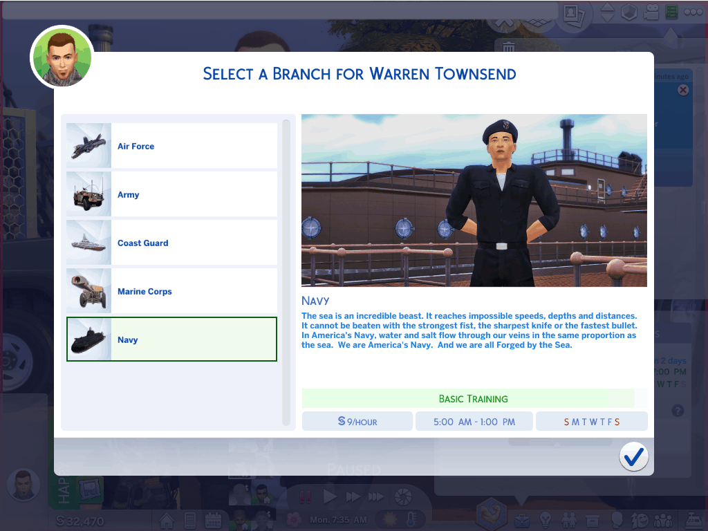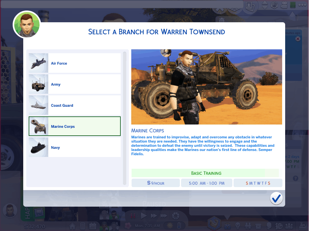 Ultimate Military has five paths (one for each branch of the military) and a minimum of 18 levels. It has almost all the actual ranks in each branch of the service. Senior enlisted ranks are skipped by a side trip to military college (which is actually possible). The career ranks and duties were thoroughly researched, but pay levels are mostly based on the Sims 3 military career. Like the actual military, all pay levels are the same for equivalent ranks in each branch.