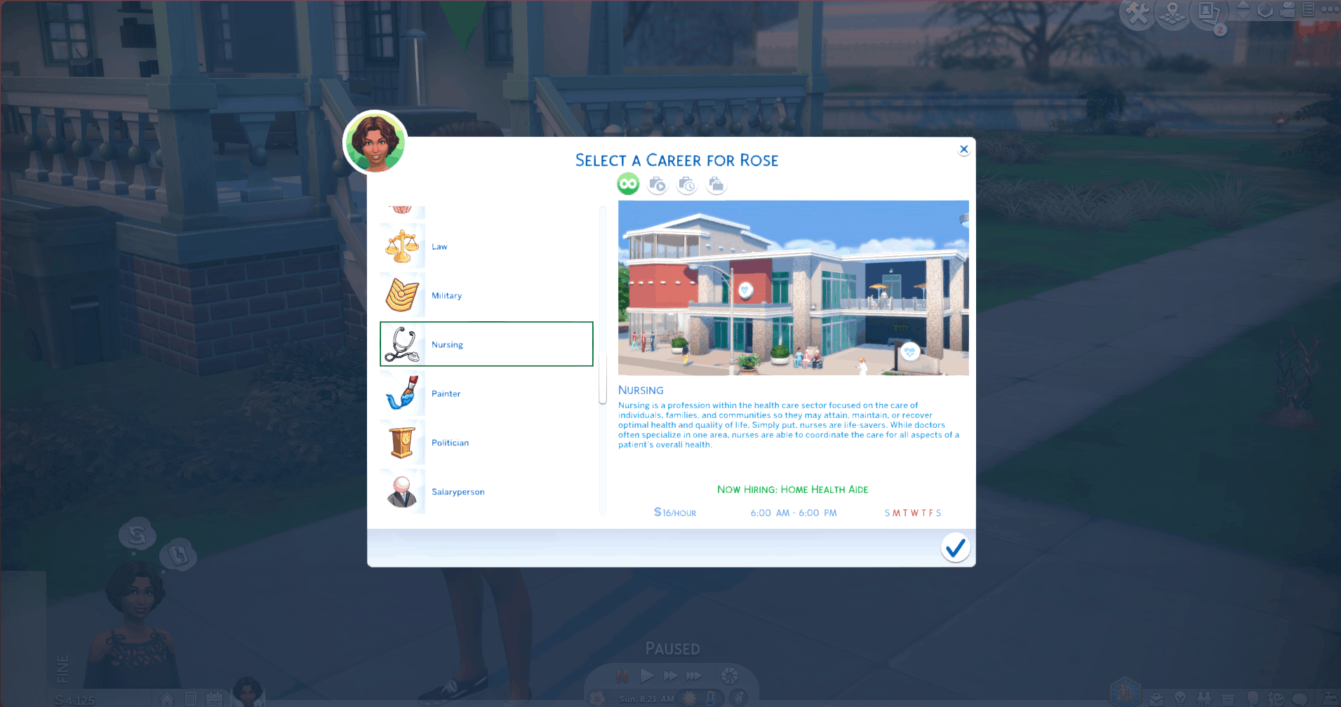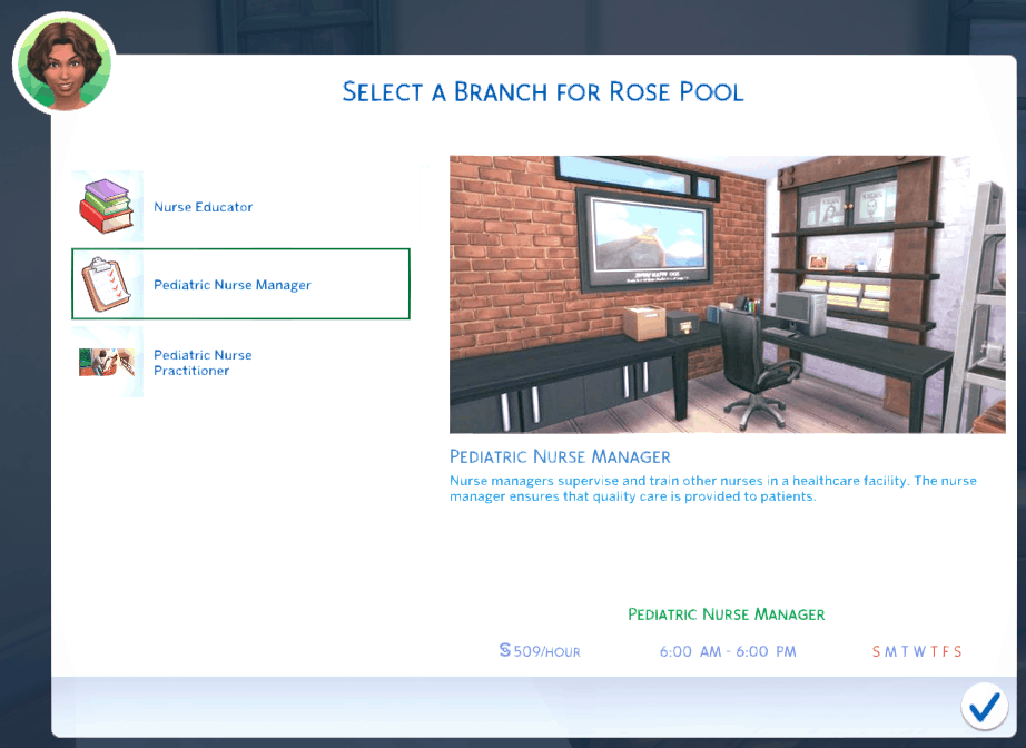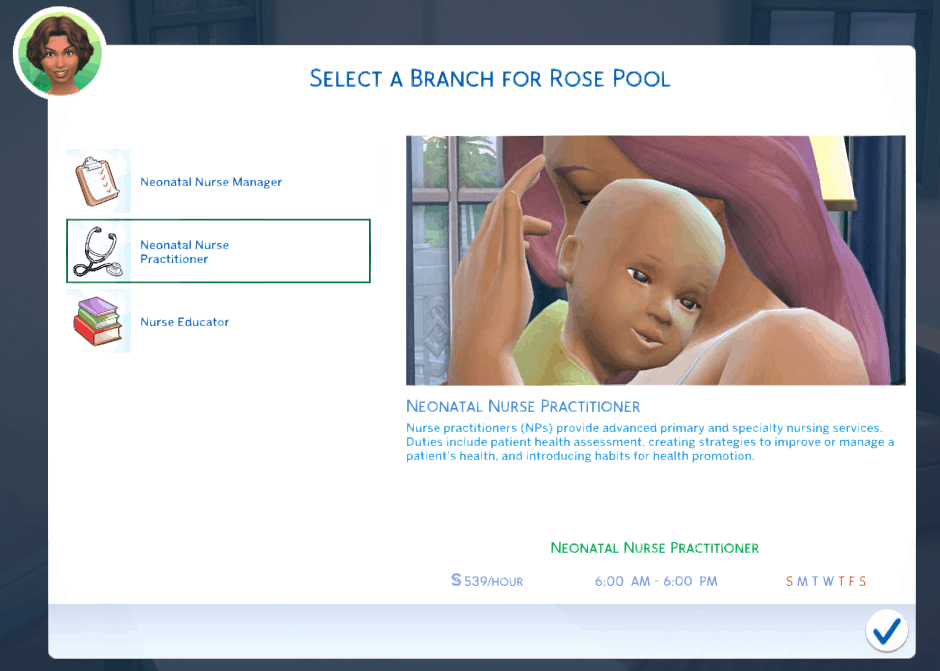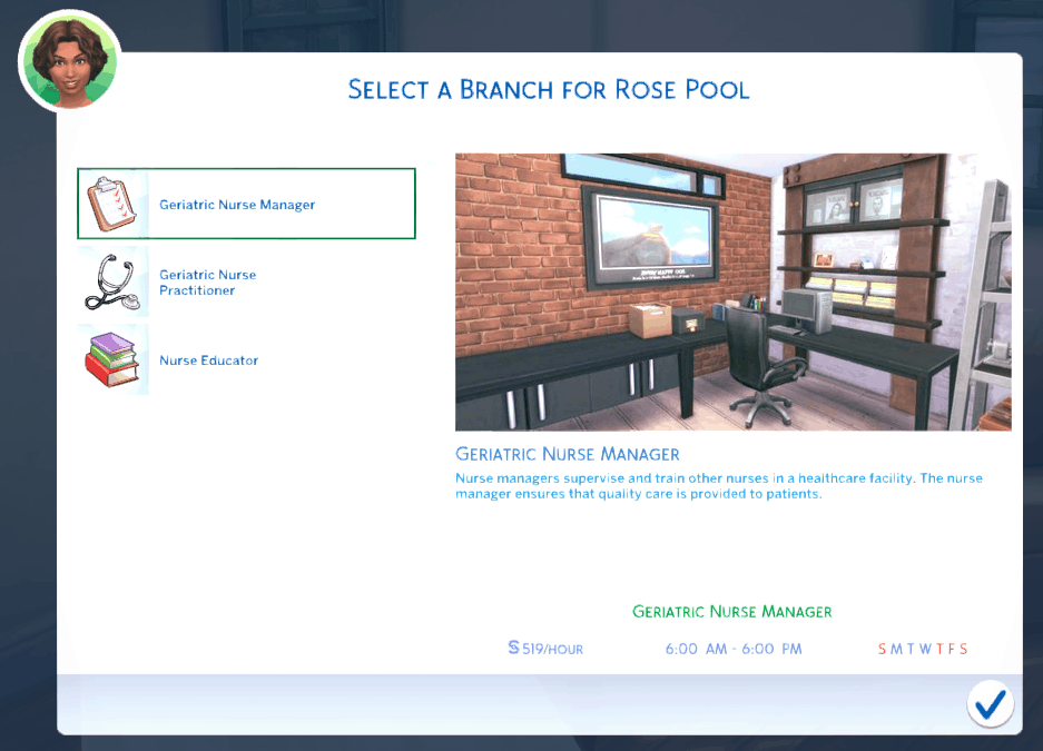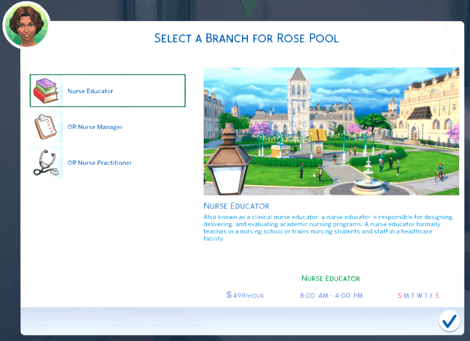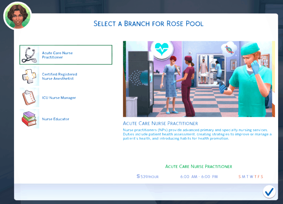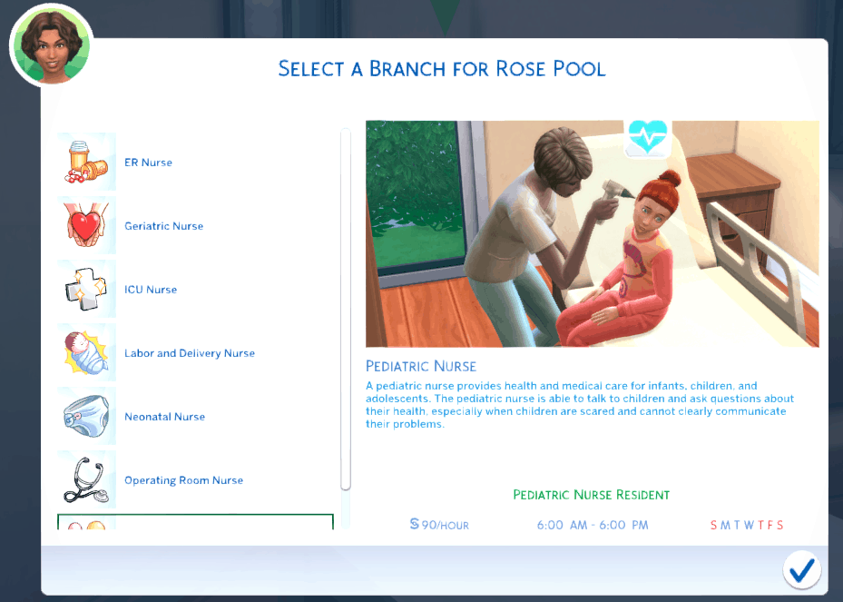 Welcome to the Ultimate Nursing Career Mod. With this mod, you are able to have your sim experience the amazing world of the nursing profession. There are 7 nursing specialties to pick from and each specialty branches off into graduate careers such as nurse practitioners, nurse managers, nurse educators, or even nurse anesthetists. You will work three 12 hours shifts and week and the only skills that are needed are logic and charisma!