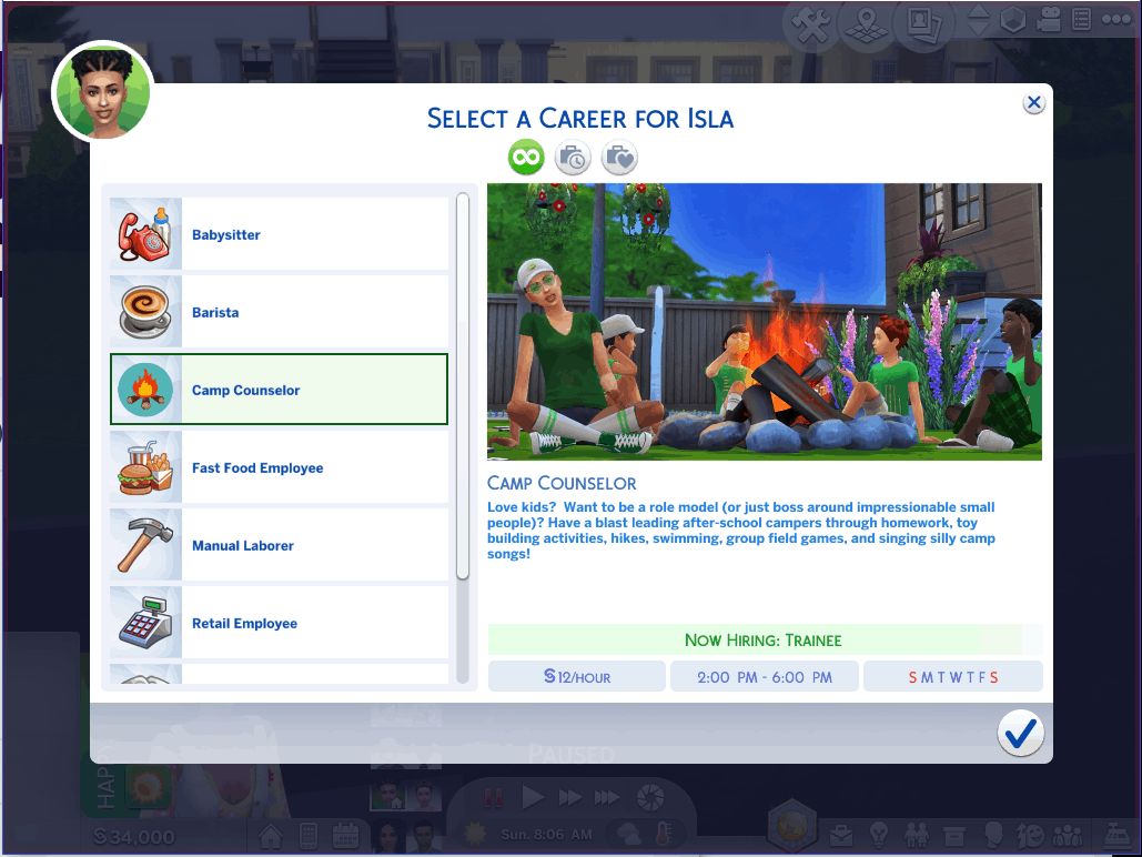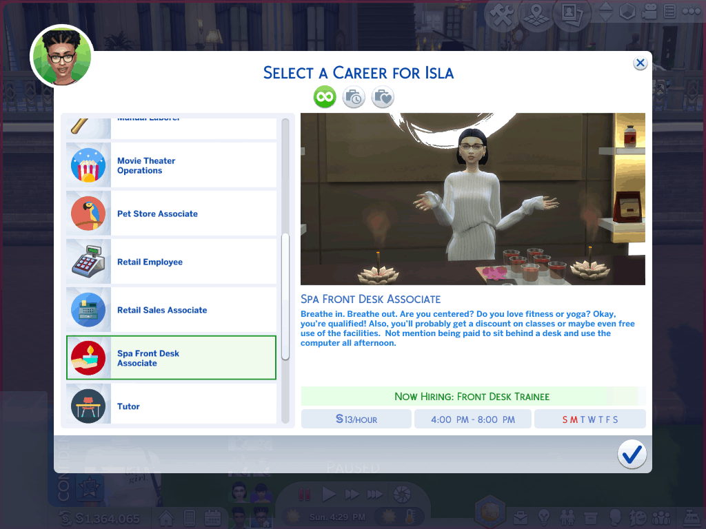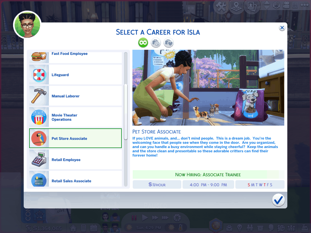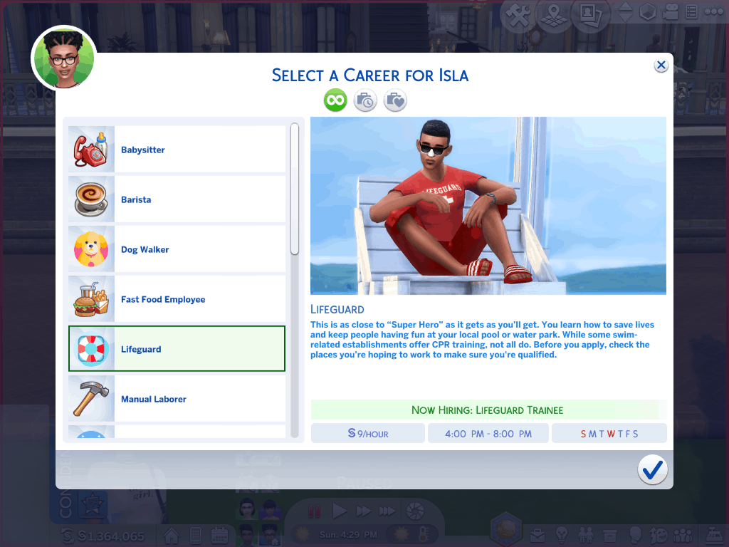 Ultimate Teen has eight original careers; Camp Counselor, Dog Walker, Lifeguard, Movie Theater Operations Person, Pet Store Associate, Spa Front Desk Associate, Tutor, Parking Valet and as a bonus, Retail Associate. I consider Retail Associate a bonus because there is already an EA Retail teen career (which I didn’t realize when I started… oops), but I left this one in because… really, who pays a teenager $33 an hour… like ever?