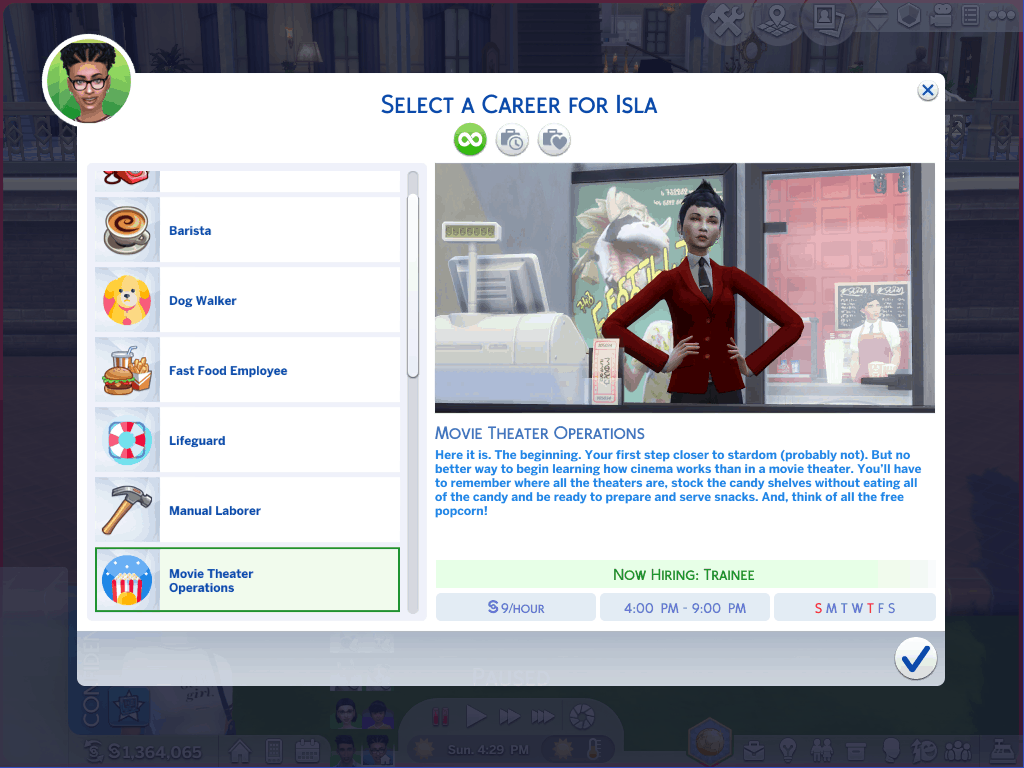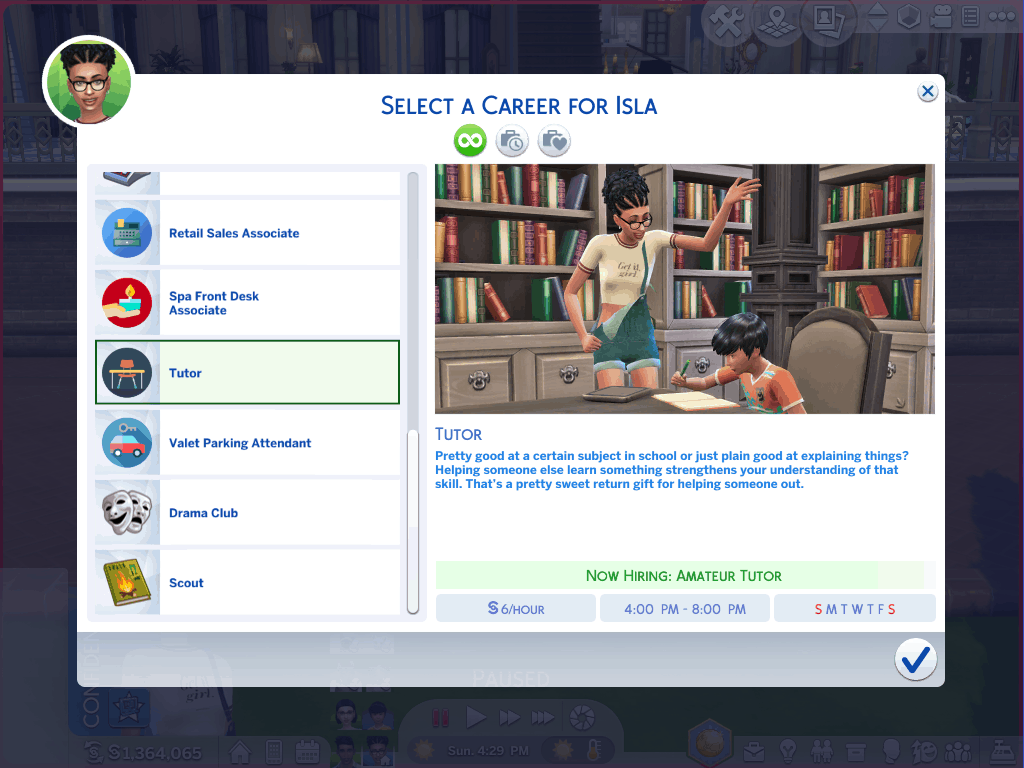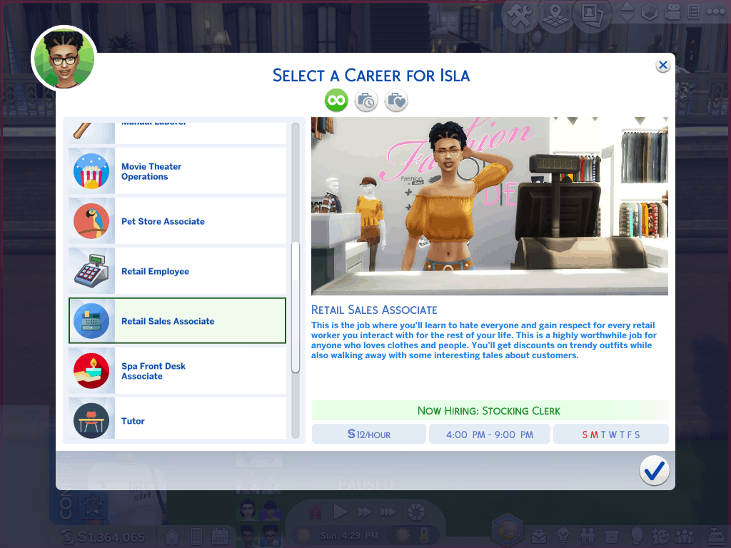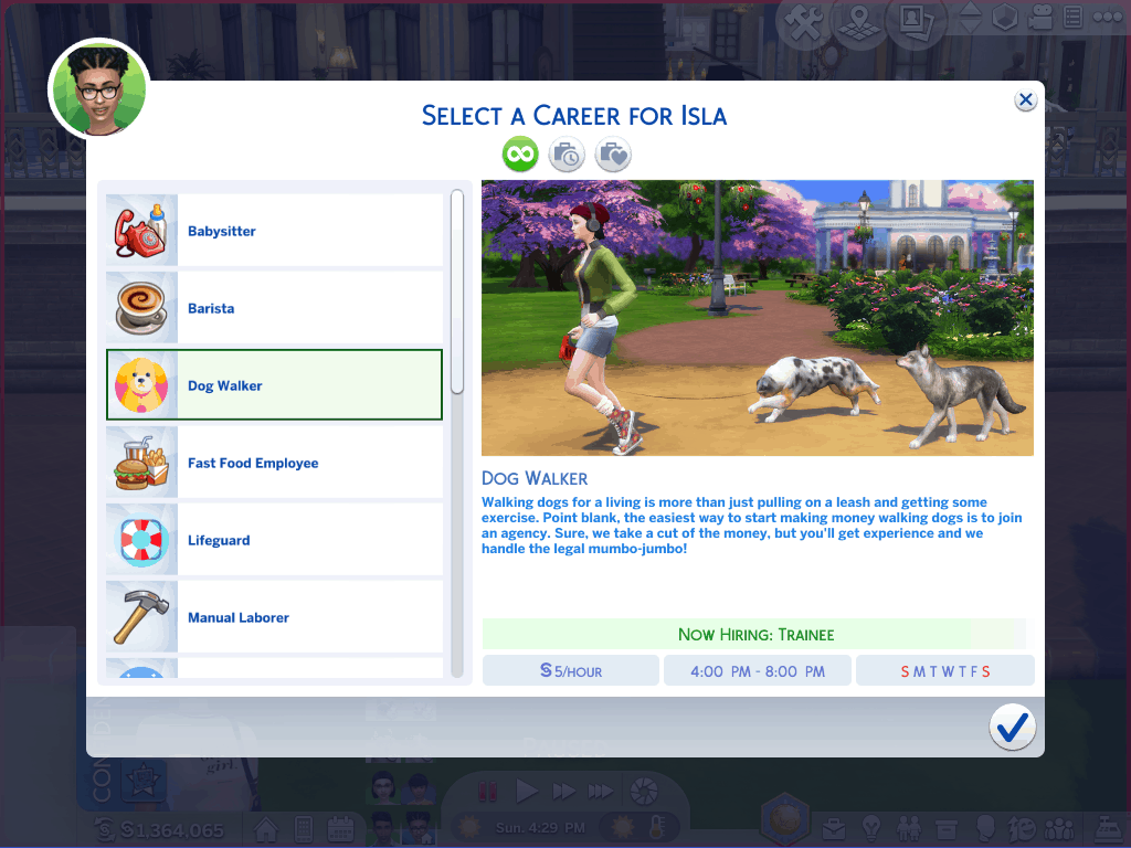 Ultimate Teen has eight original careers; Camp Counselor, Dog Walker, Lifeguard, Movie Theater Operations Person, Pet Store Associate, Spa Front Desk Associate, Tutor, Parking Valet and as a bonus, Retail Associate. I consider Retail Associate a bonus because there is already an EA Retail teen career (which I didn’t realize when I started… oops), but I left this one in because… really, who pays a teenager $33 an hour… like ever?